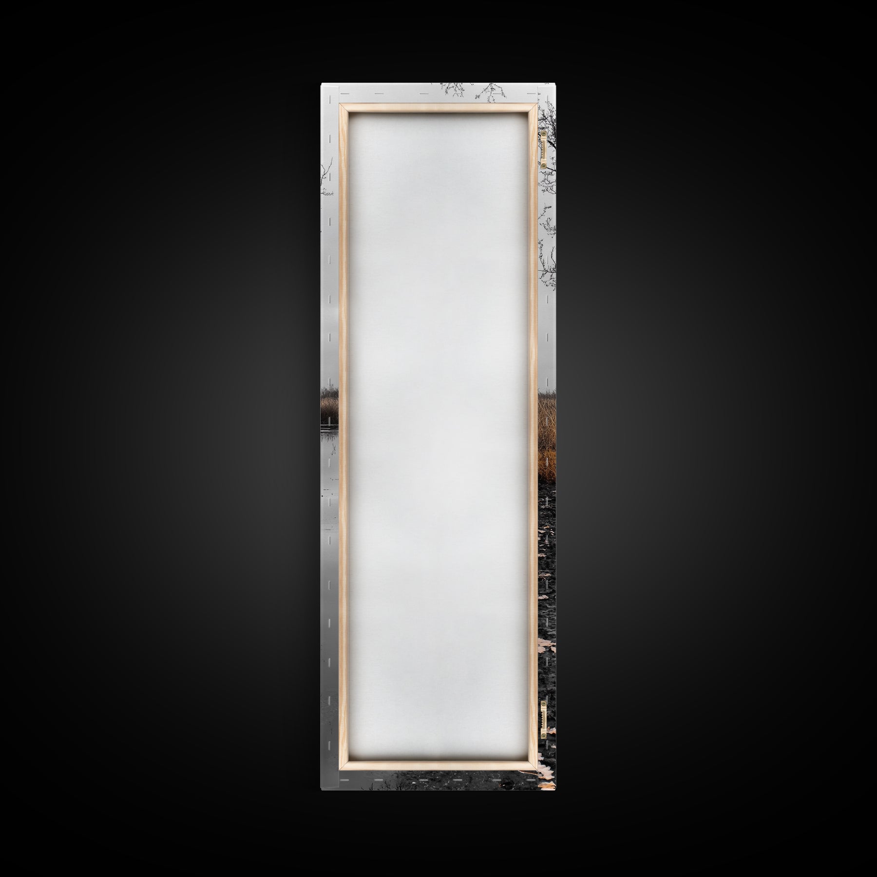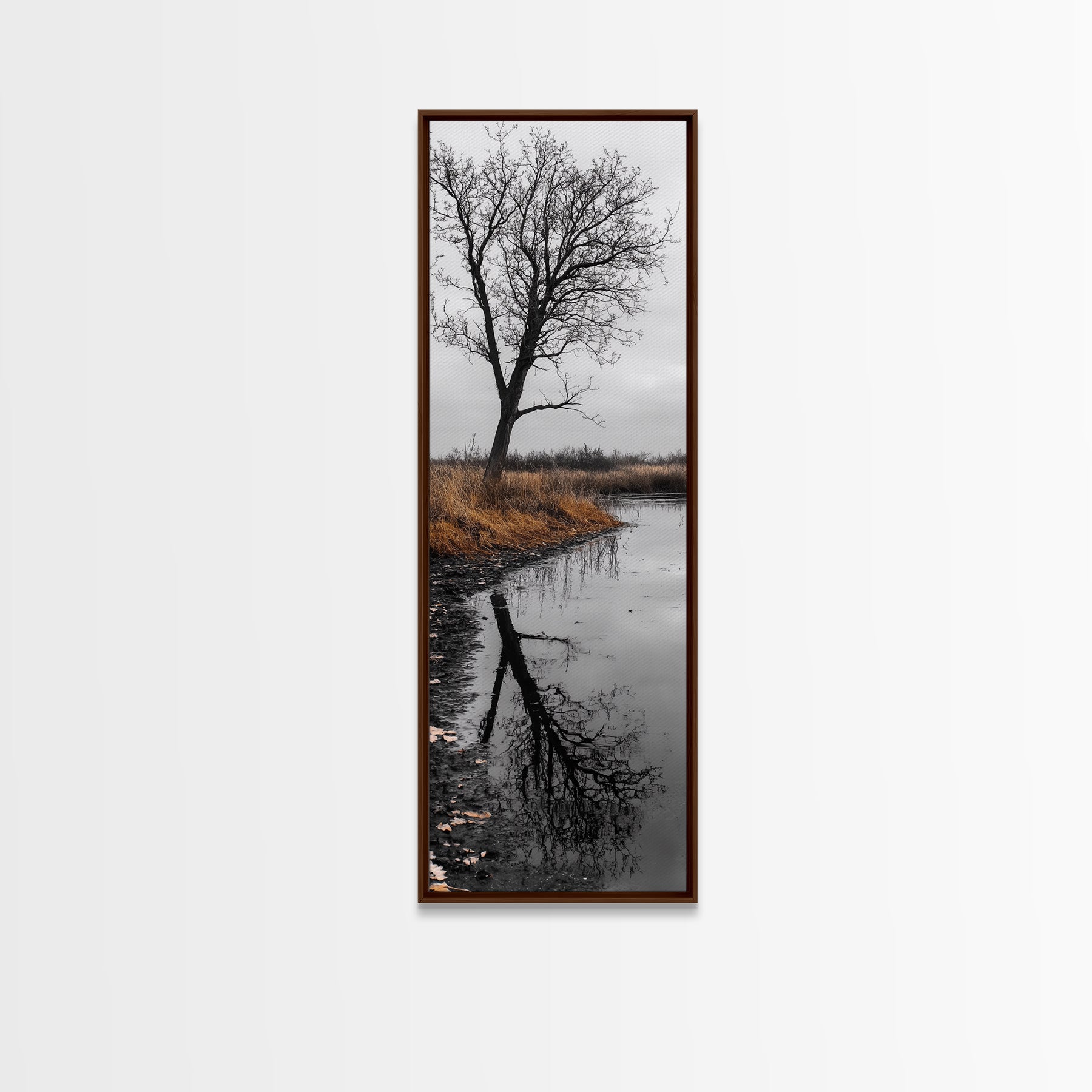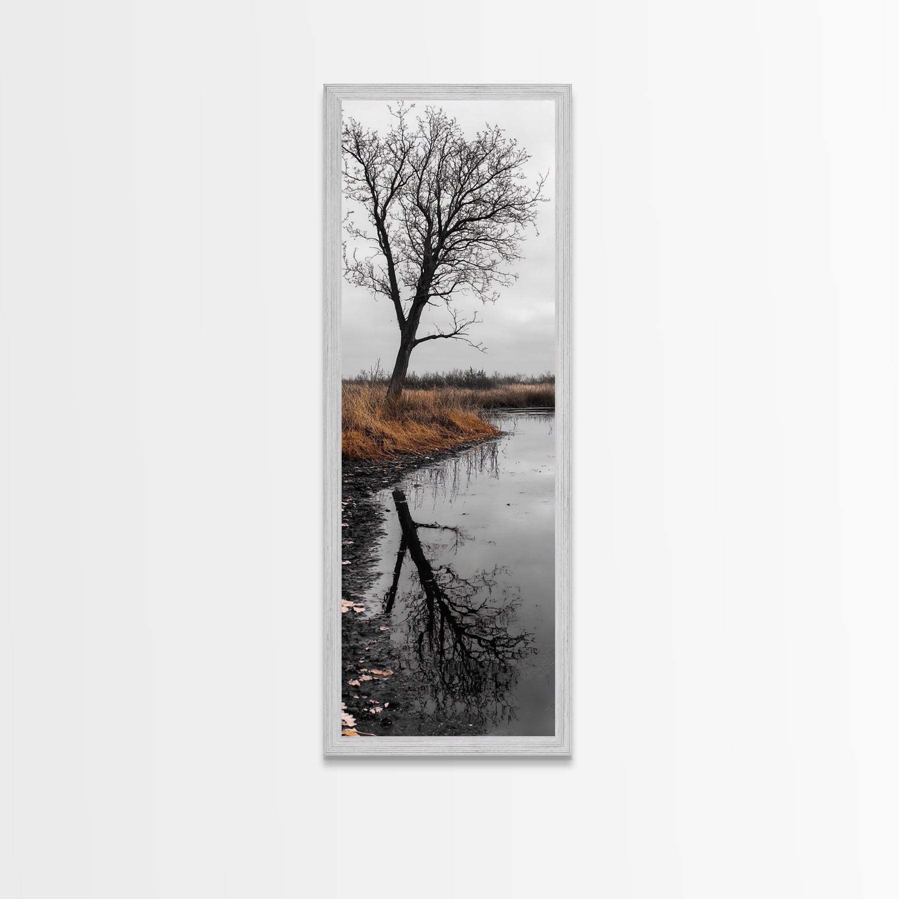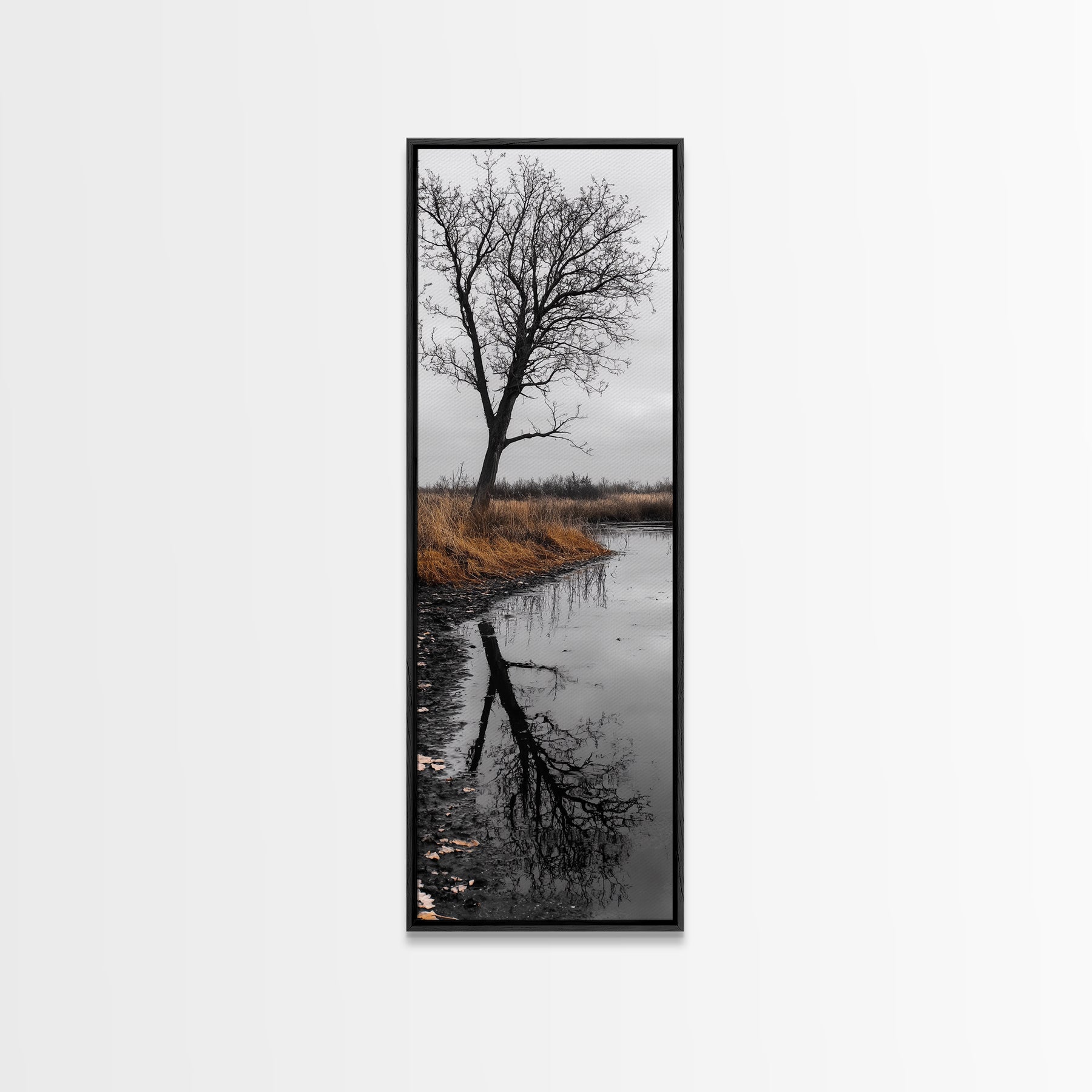Bare Tree, Marsh Reflection, Autumn Tones, Moody Nature Framed Canvas Print, fall farmhouse wall art, rustic entryway decor, office wall art