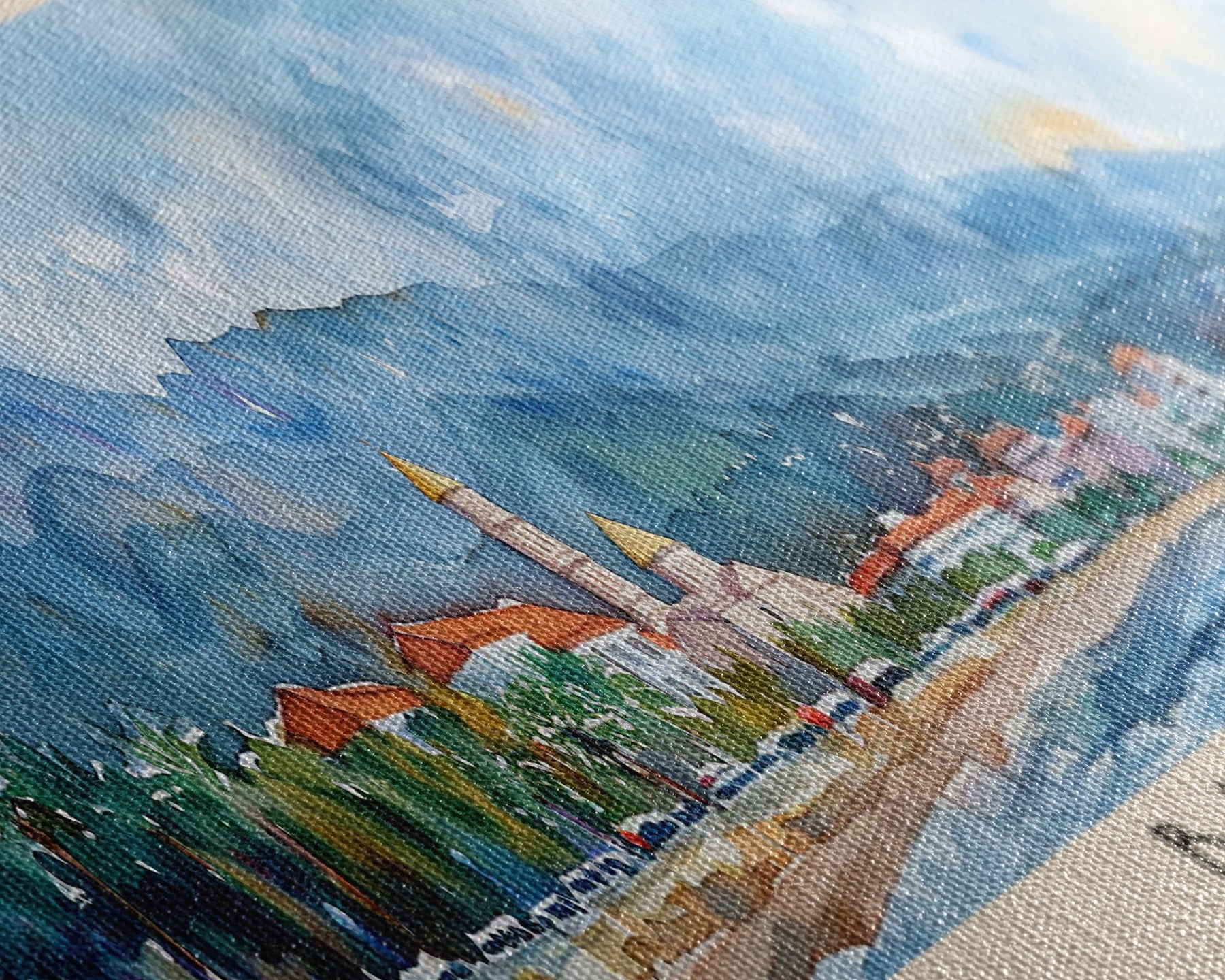 Most of our canvases are made in the USA, with the exception of canvases ordered with the light oak unstained frames, and any large canvases (24x48, 30x60, 16x48 and 20x60) ordered WITH a frame. These are temporarily made in and shipped from Europe, while we try to find a more consistent supplier in the USA.