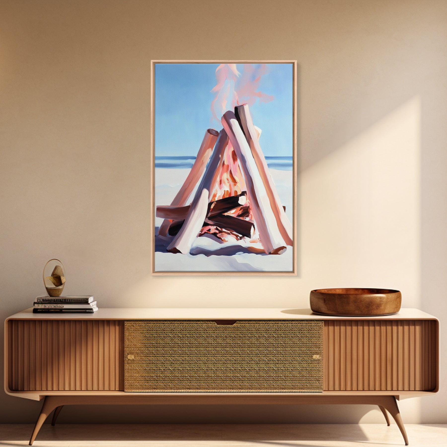 Beach Bonfire, Coastal Art, Ocean Sunset, Warm Minimalist, Canvas Print, Coastal Home Decor, Relaxing Wall Art, Boho Aesthetic