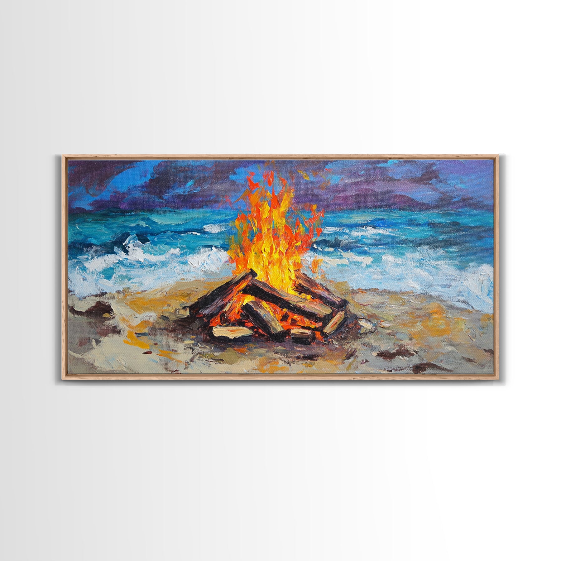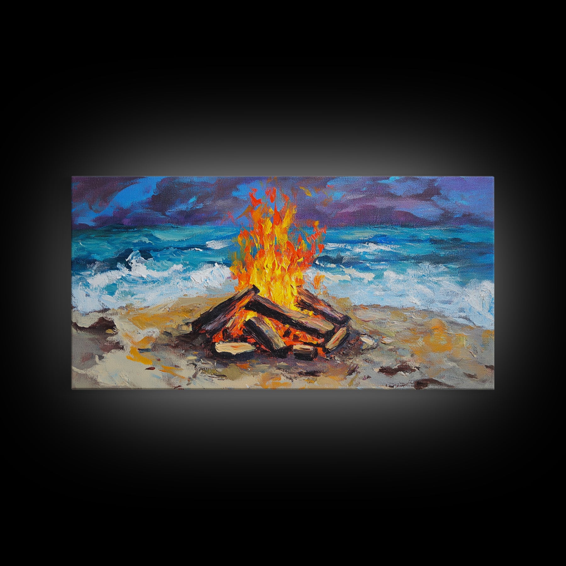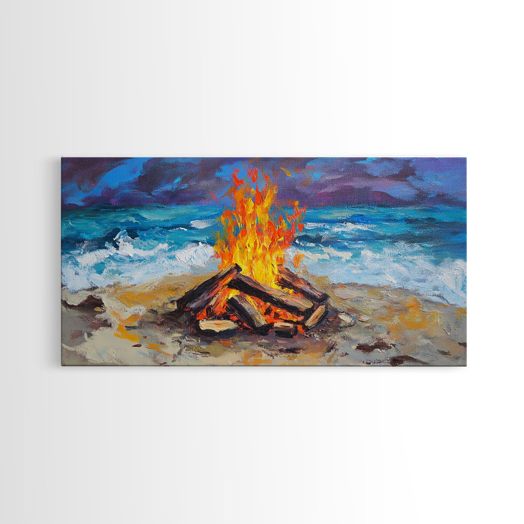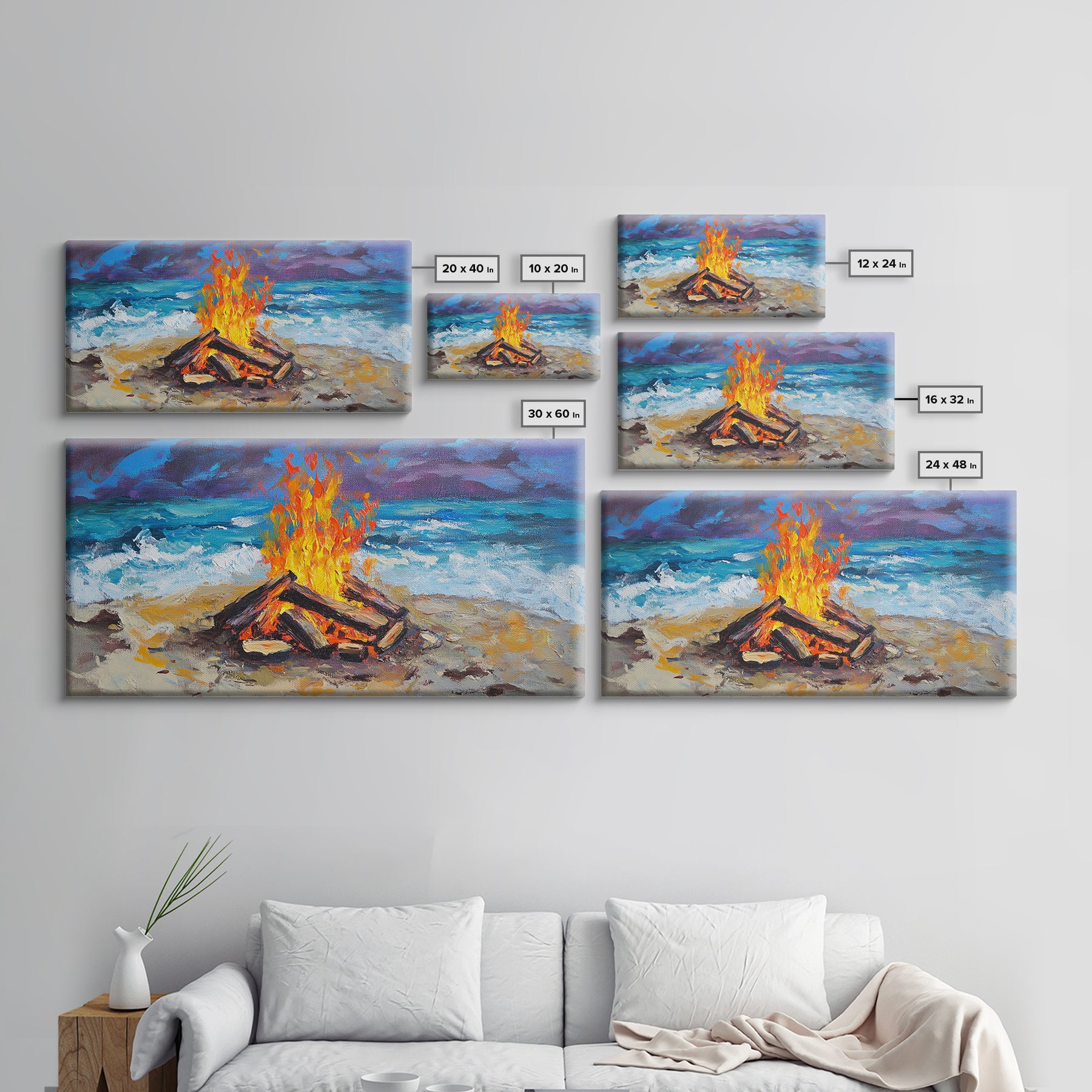 Beach bonfire, coastal decor, surf wall art, nautical painting, ocean fire, rustic wall art, horizontal wall art, canvas print, seascape