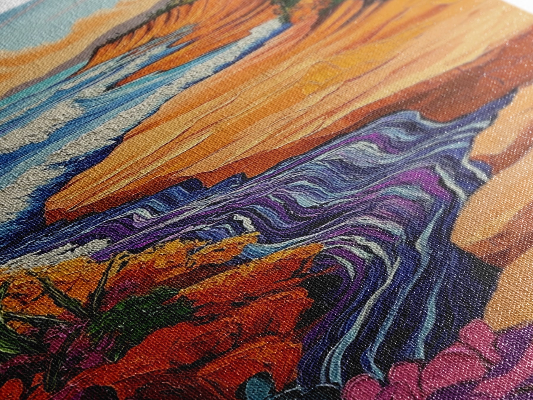 Beach Cliff, Waterfall, Sunset, Canvas Print bold beachside cliff art, ocean waterfall wall decor, coastal boho painting, living room print