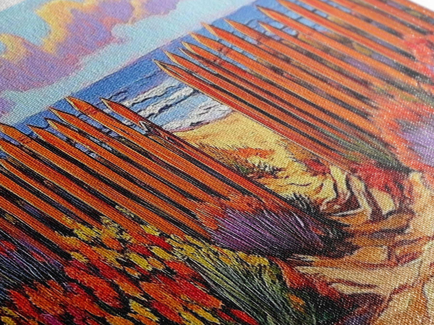 Most of our canvases are made in the USA, with the exception of canvases ordered with the light oak unstained frames, and any large canvases (24x48, 30x60, 16x48 and 20x60) ordered WITH a frame. These are temporarily made in and shipped from Europe, while we try to find a more consistent supplier in the USA.