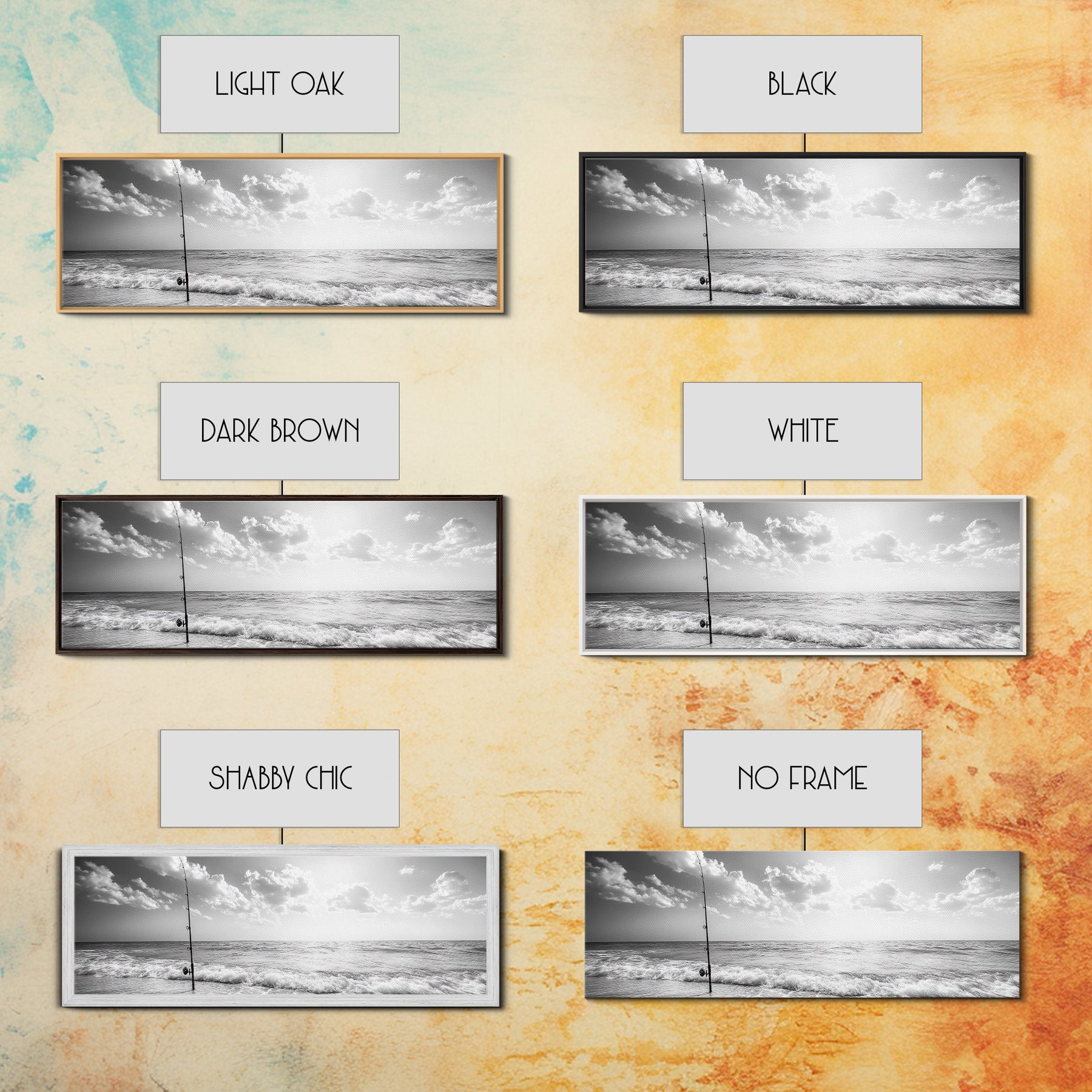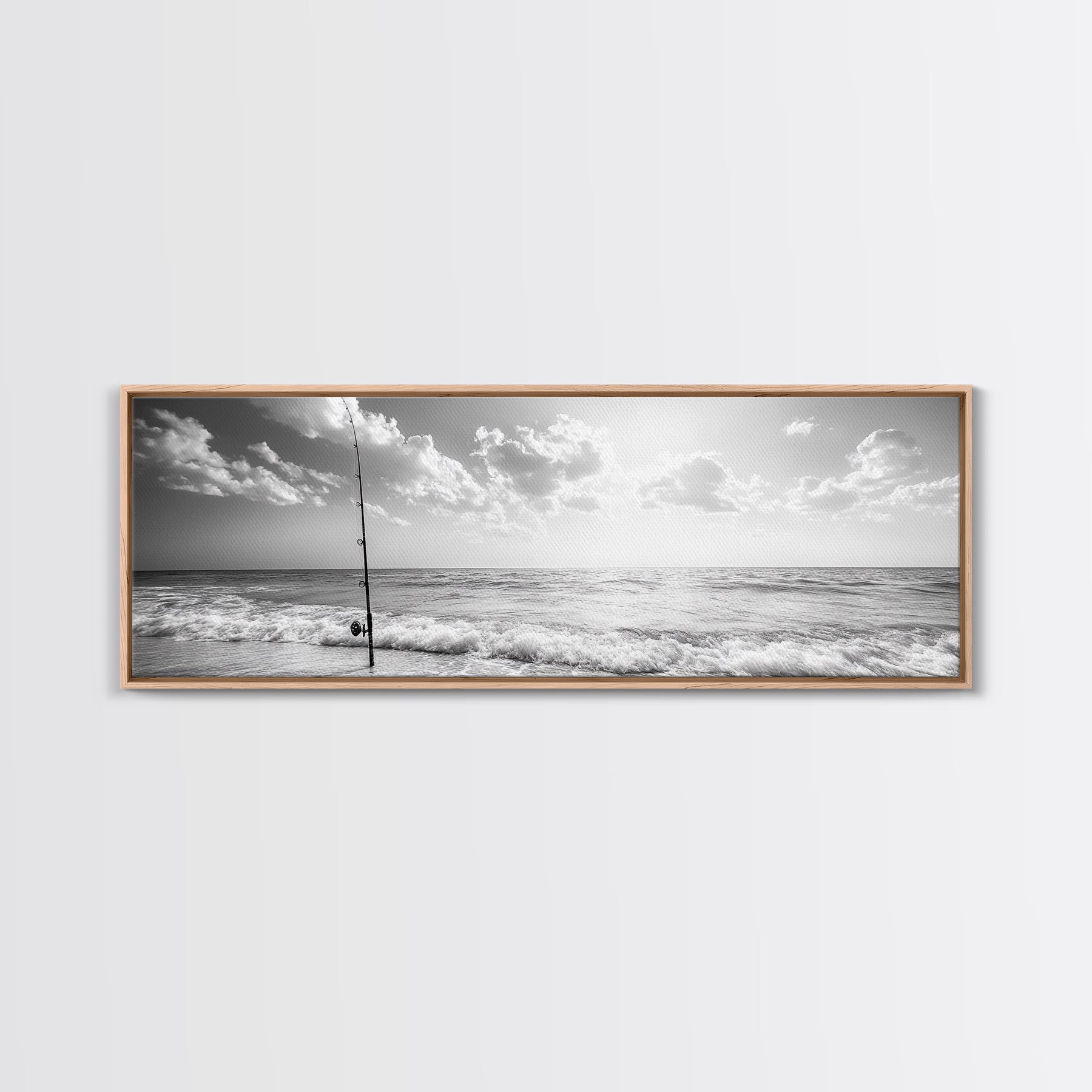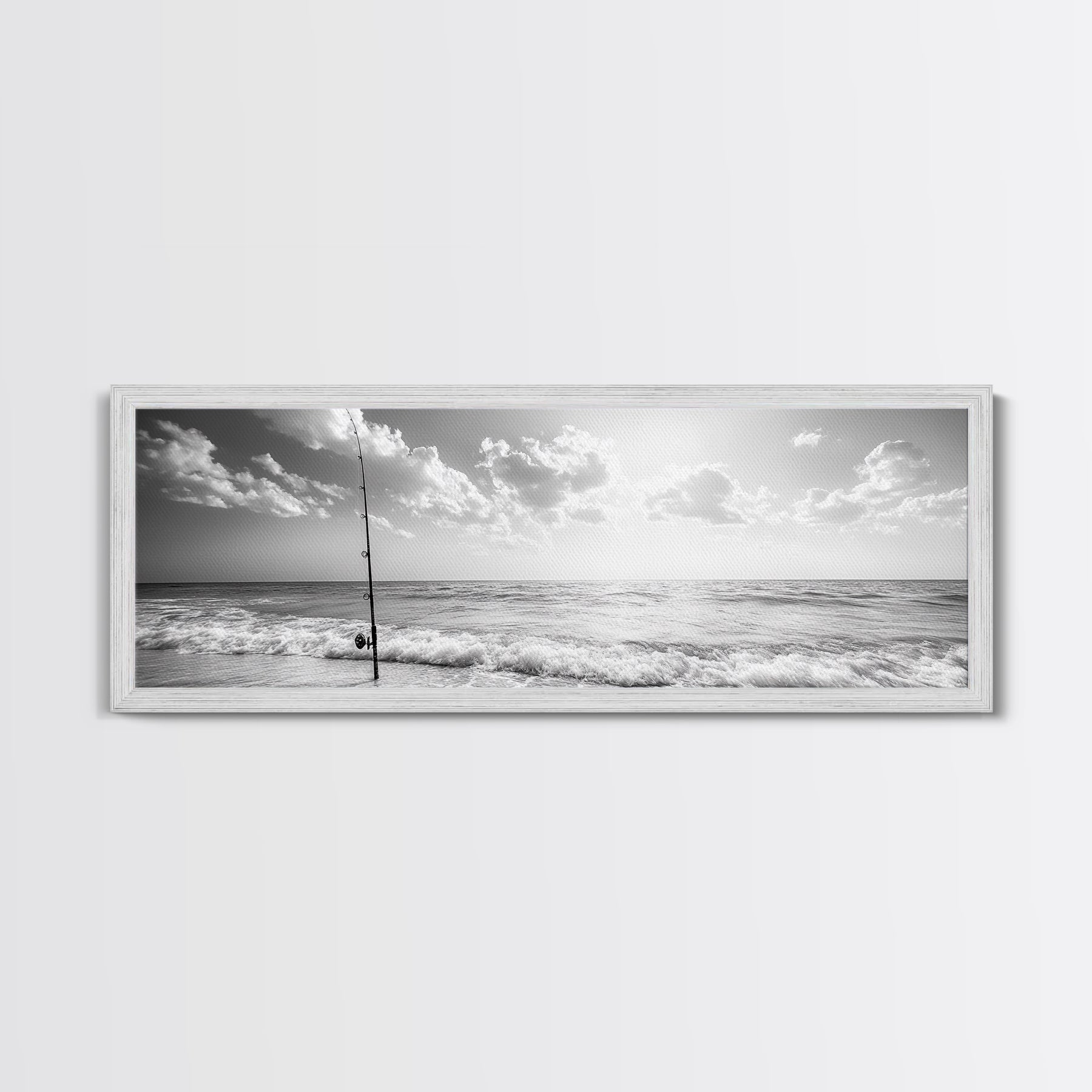 Beach Fishing, Ocean Waves, Rod and Reel, Framed Canvas Print, Coastal Living Wall Art, Minimalist Nautical Decor, Beach House Aesthetic