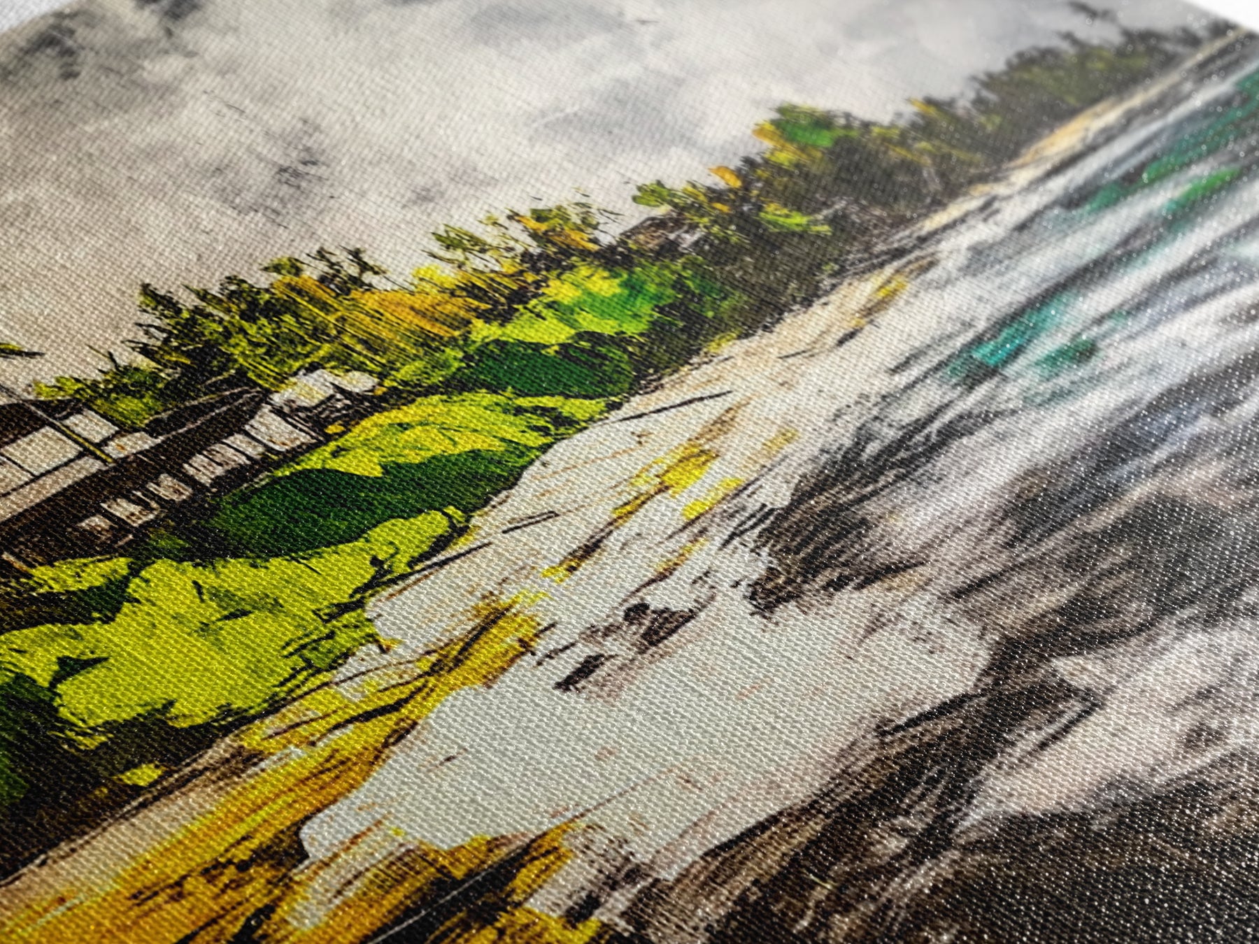 Most of our canvases are made in the USA, with the exception of canvases ordered with the light oak unstained frames, and any large canvases (24x48, 30x60, 16x48 and 20x60) ordered WITH a frame. These are temporarily made in and shipped from Europe, while we try to find a more consistent supplier in the USA.