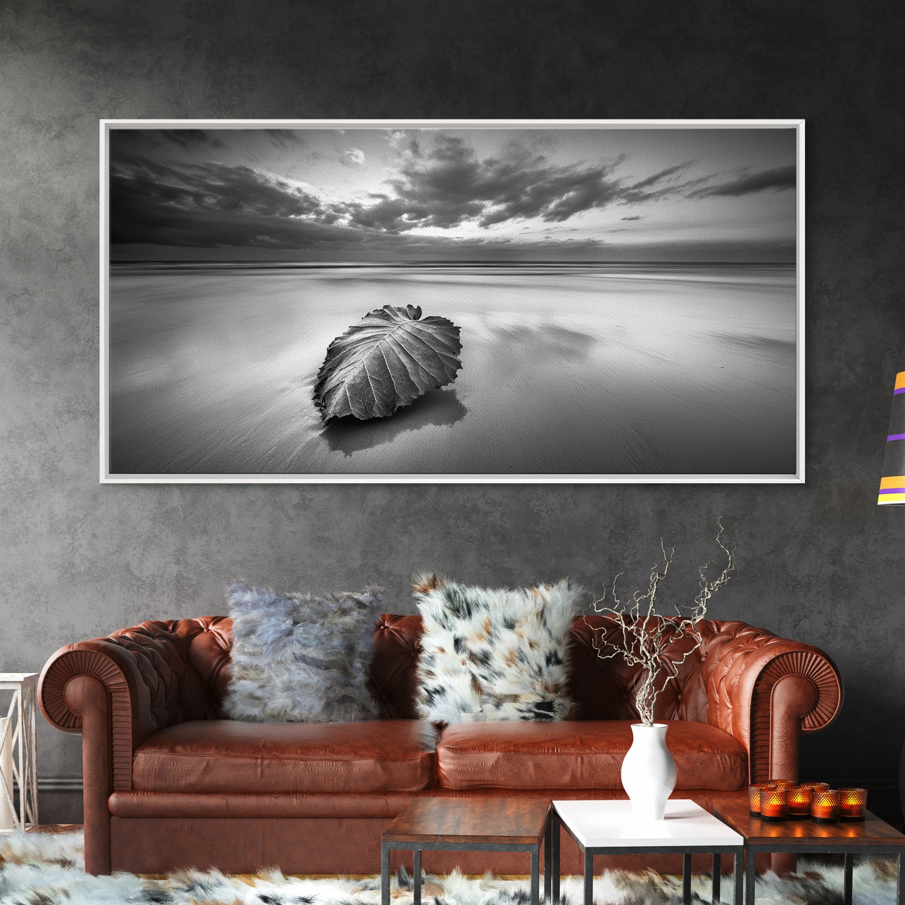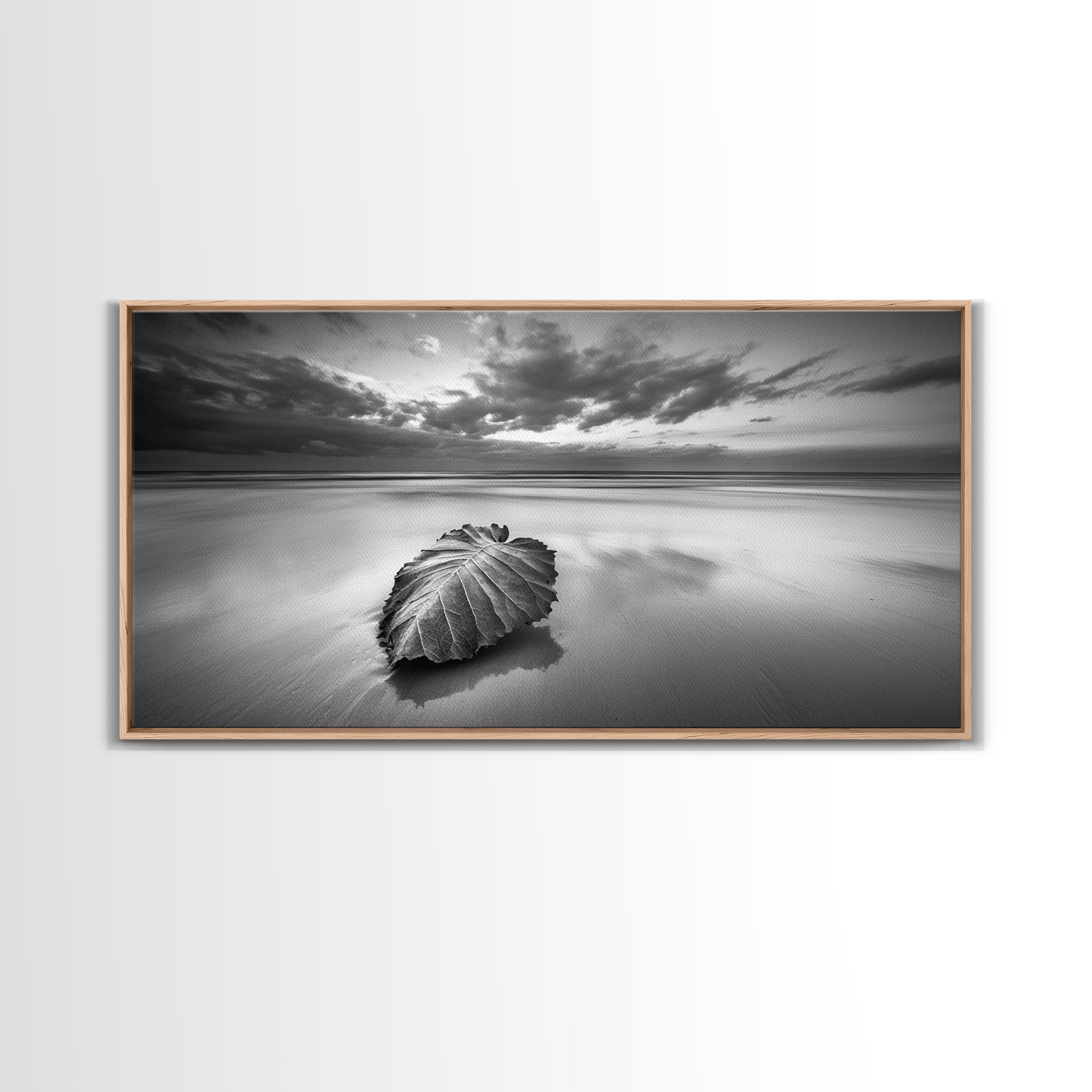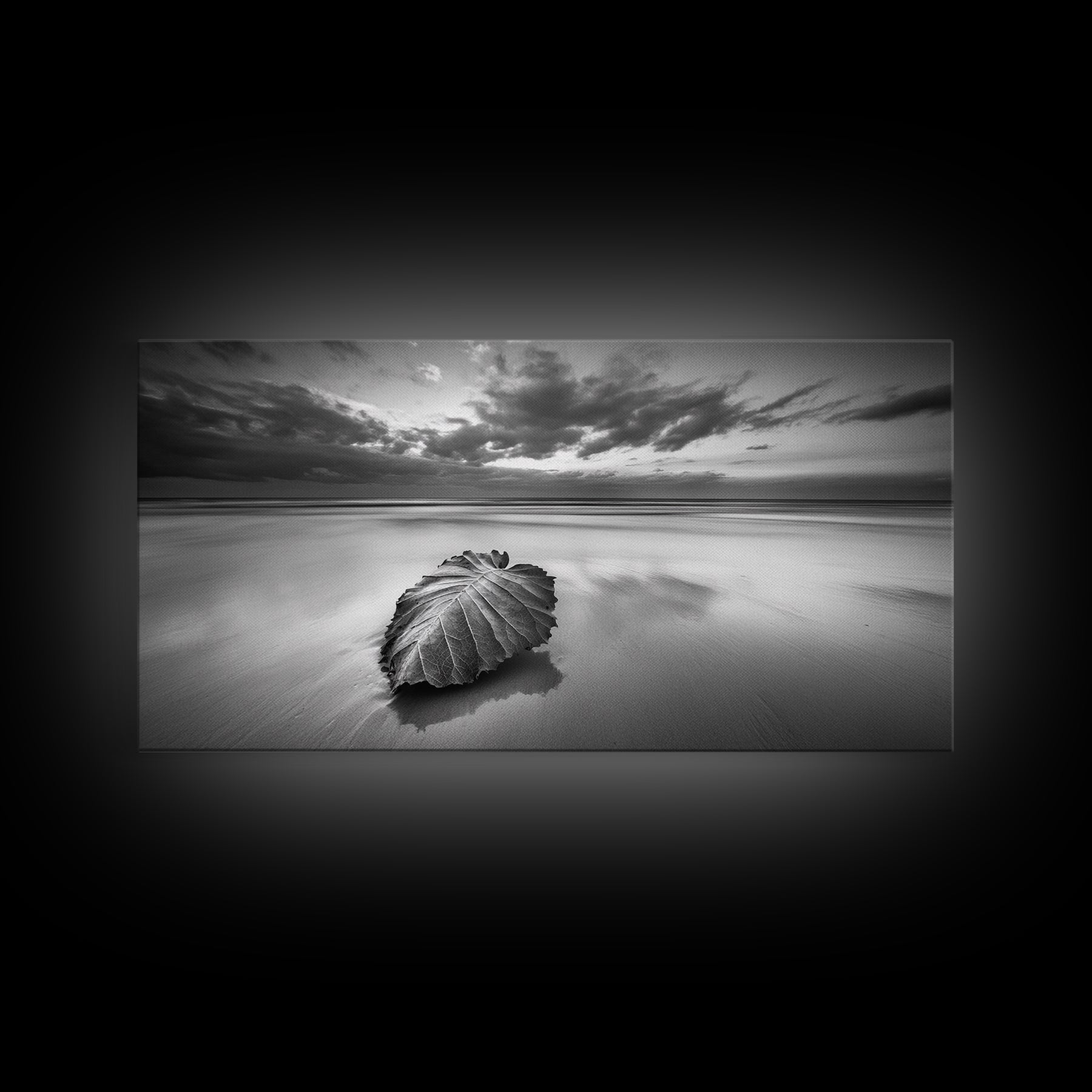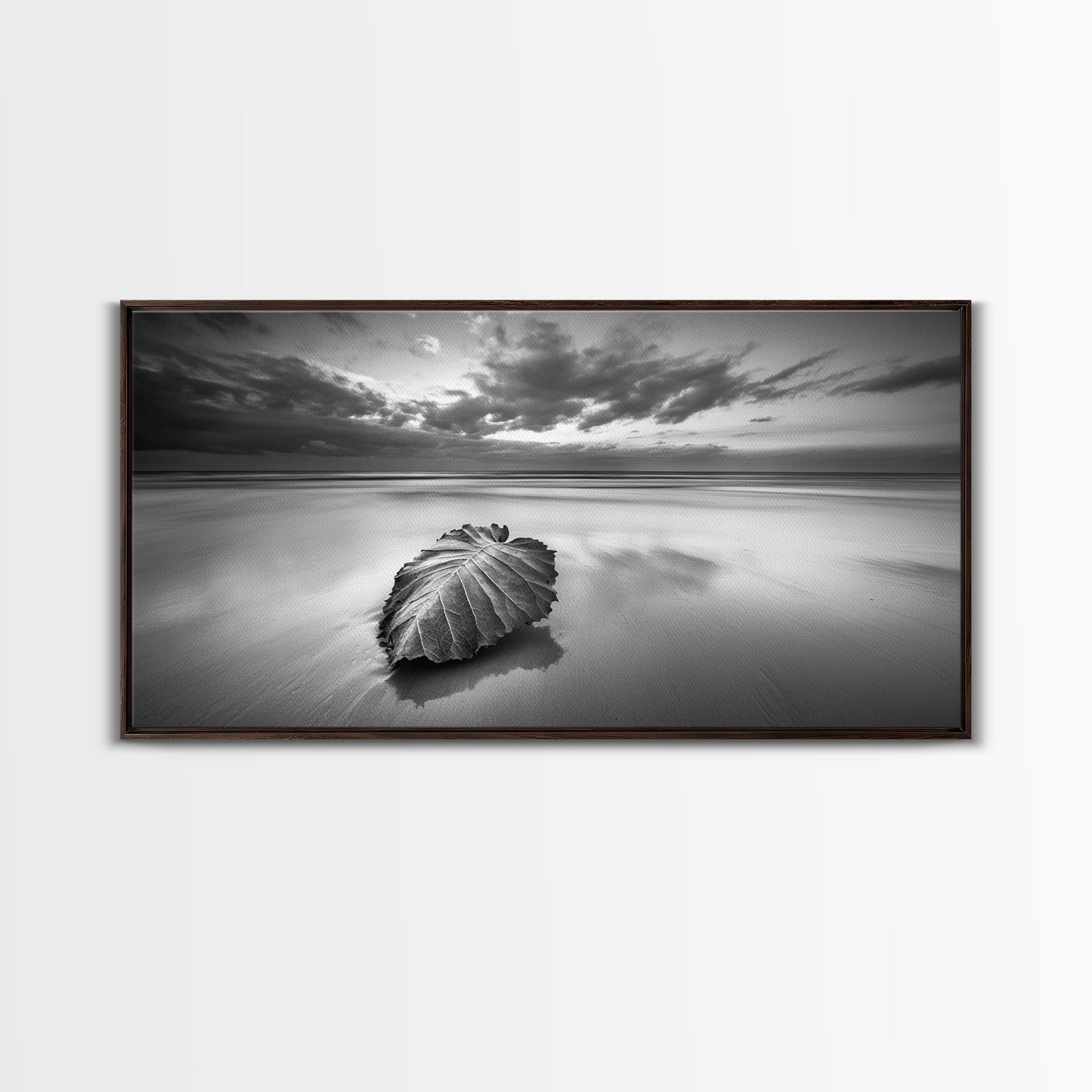 Beach Leaf Still, Autumn Nature Scene, Calm Ocean Shoreline, Canvas Print, Fall Bathroom Wall Art, Neutral Earth Tone Decor
