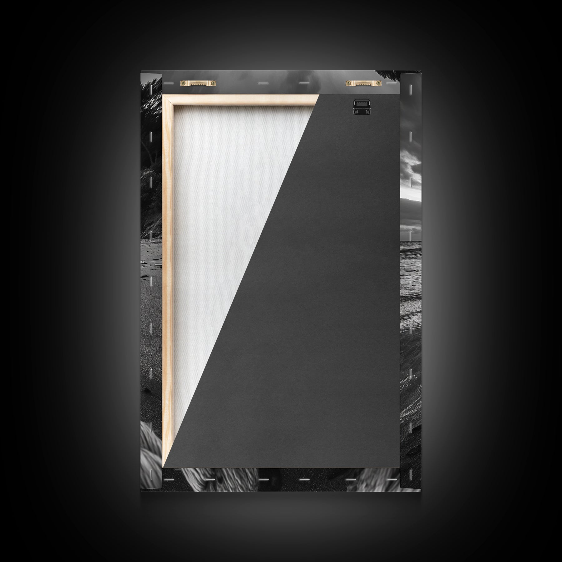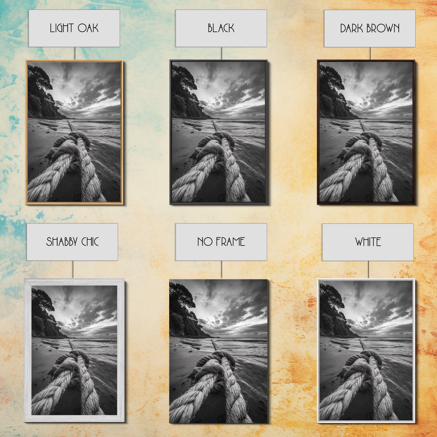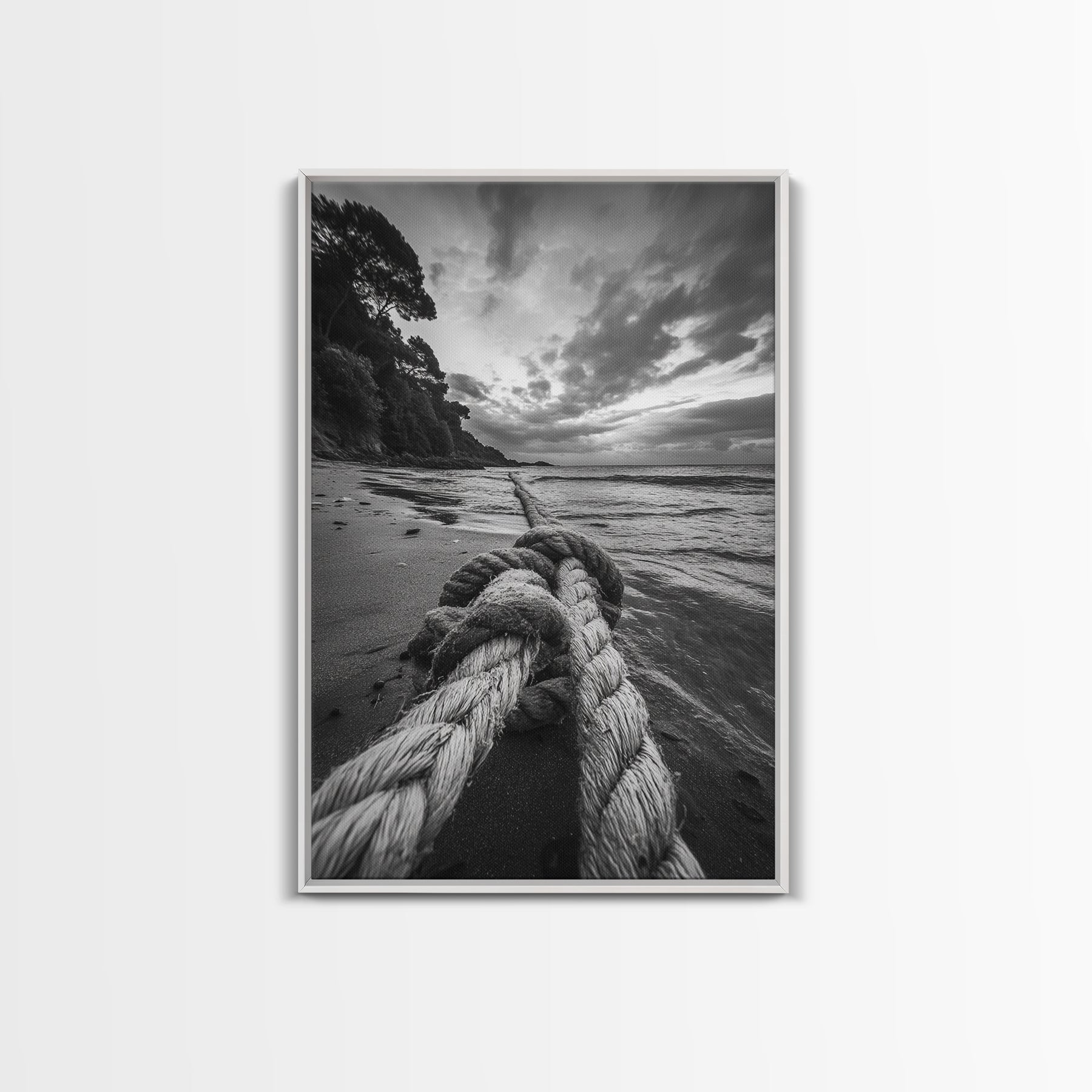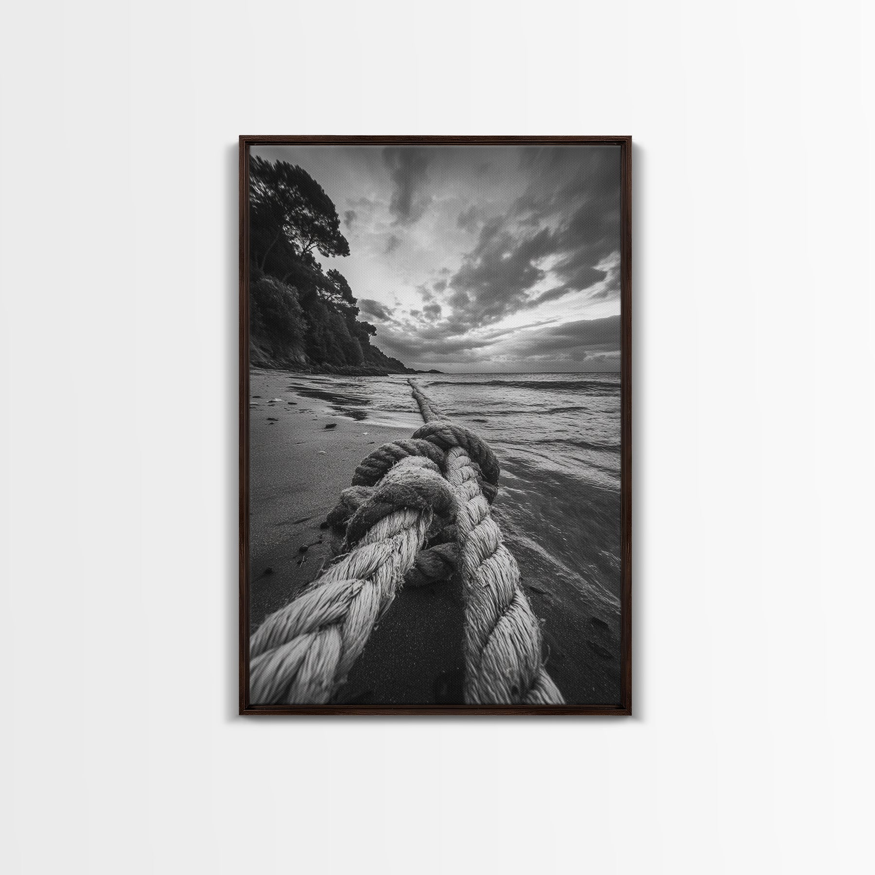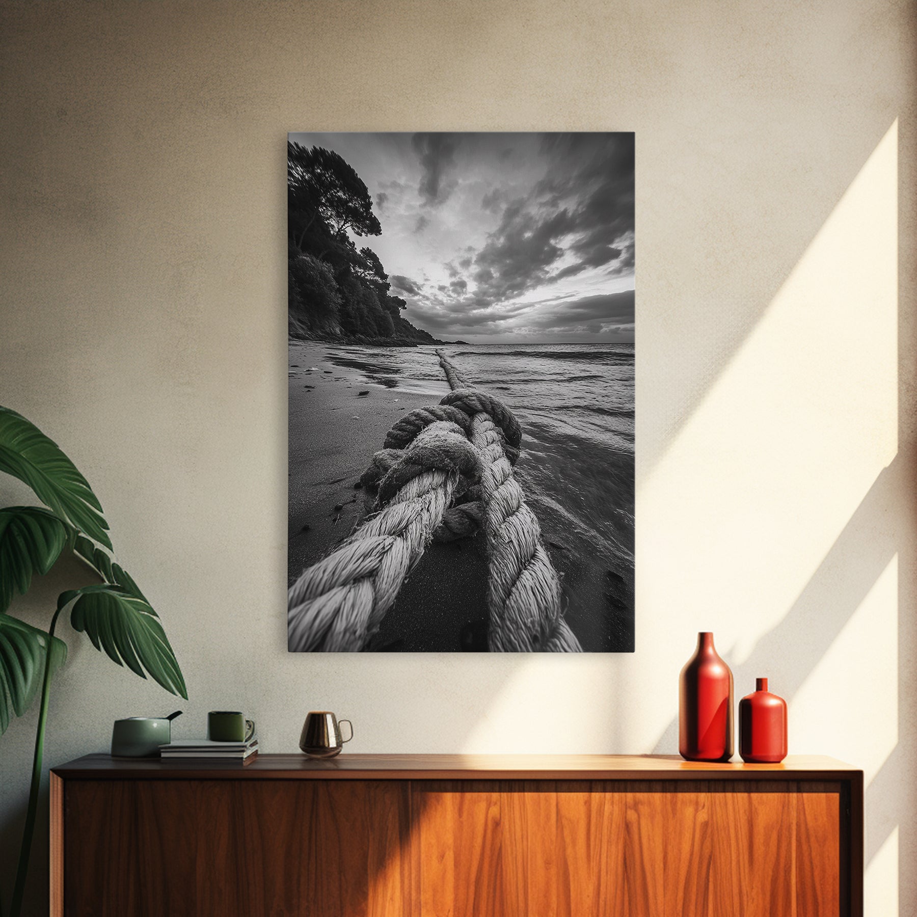 Beach Rope Knot, Coastal Connection, Ocean Shoreline, Nautical Canvas Print, Black and White Bathroom or Seaside Wall Decor