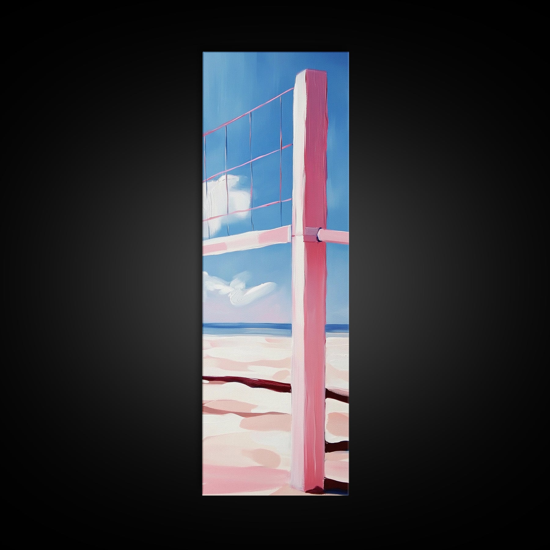 Beach Volleyball Net, Summer Fun, Pink Aesthetic, Framed Canvas Print, Modern Minimalist, Coastal Sports, Vacation Home Wall Art