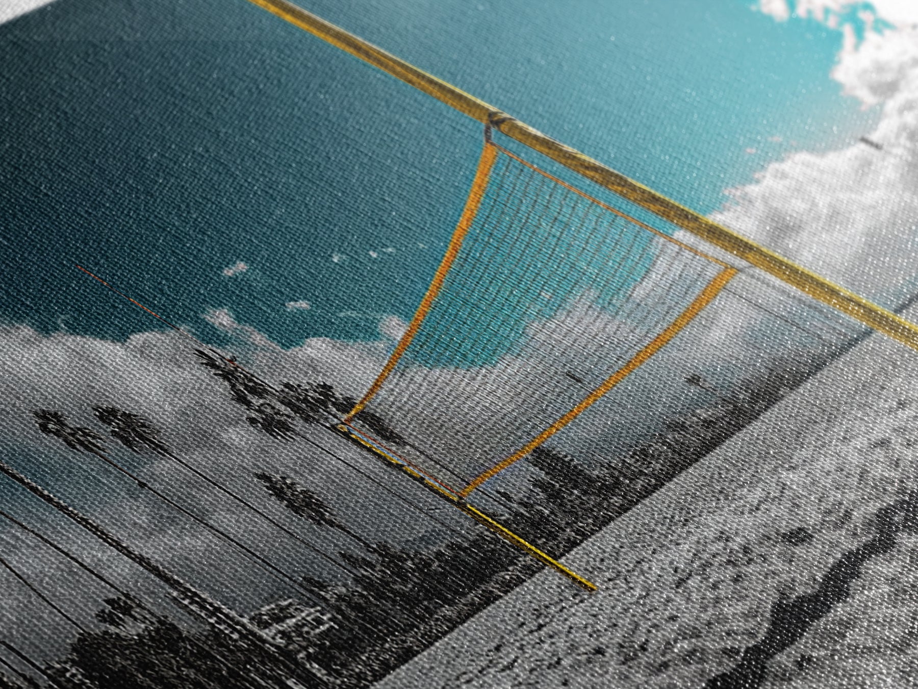 Beach Volleyball, Palm Trees, Summer Sport, Coastal Minimalism, Framed Canvas Print, Rec Room Wall Art, Sporty Vibe Decor