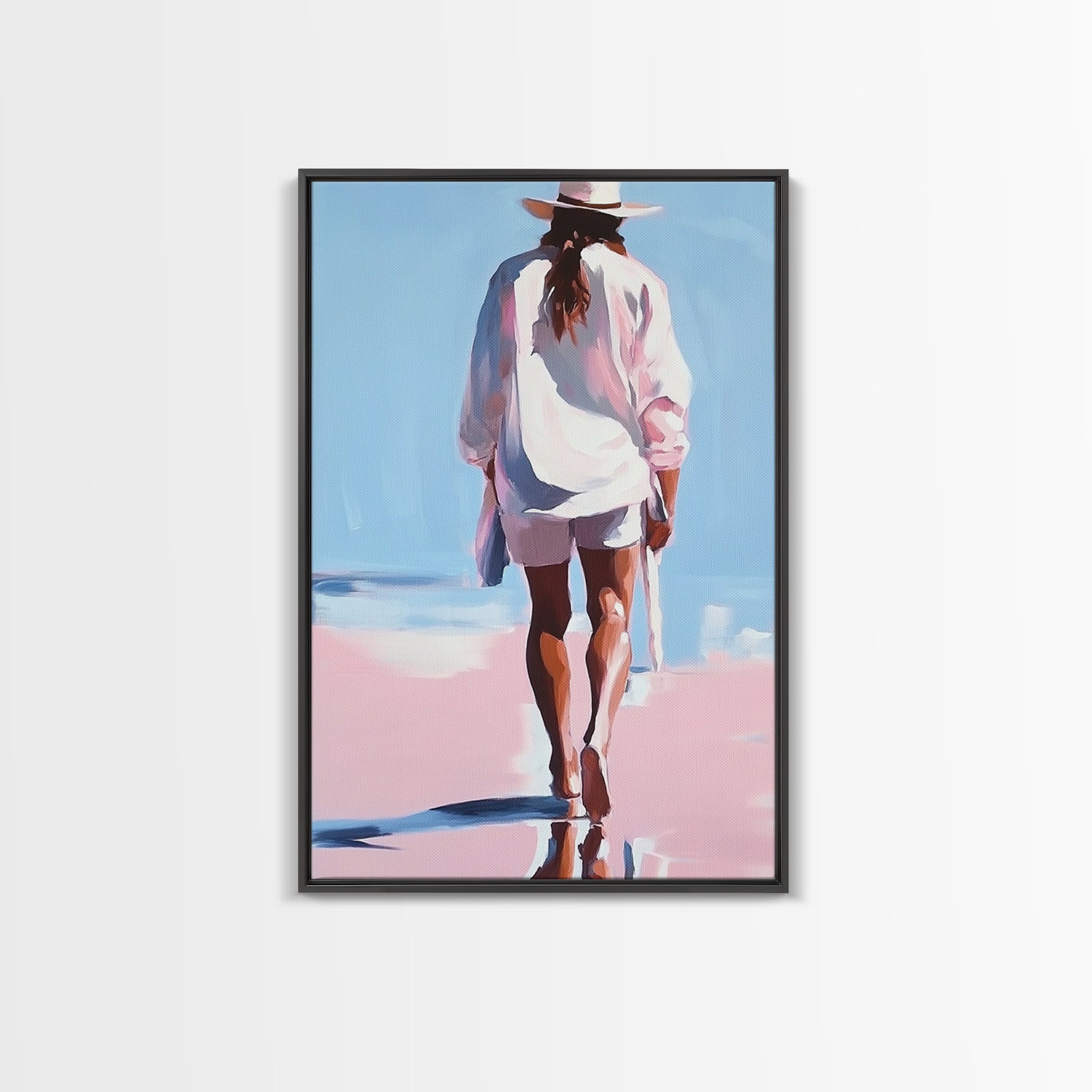 Beach Walk, coastal cowgirl wall art, boho art, pink orange wall art, light pink wall art, coastal decor, framed canvas print