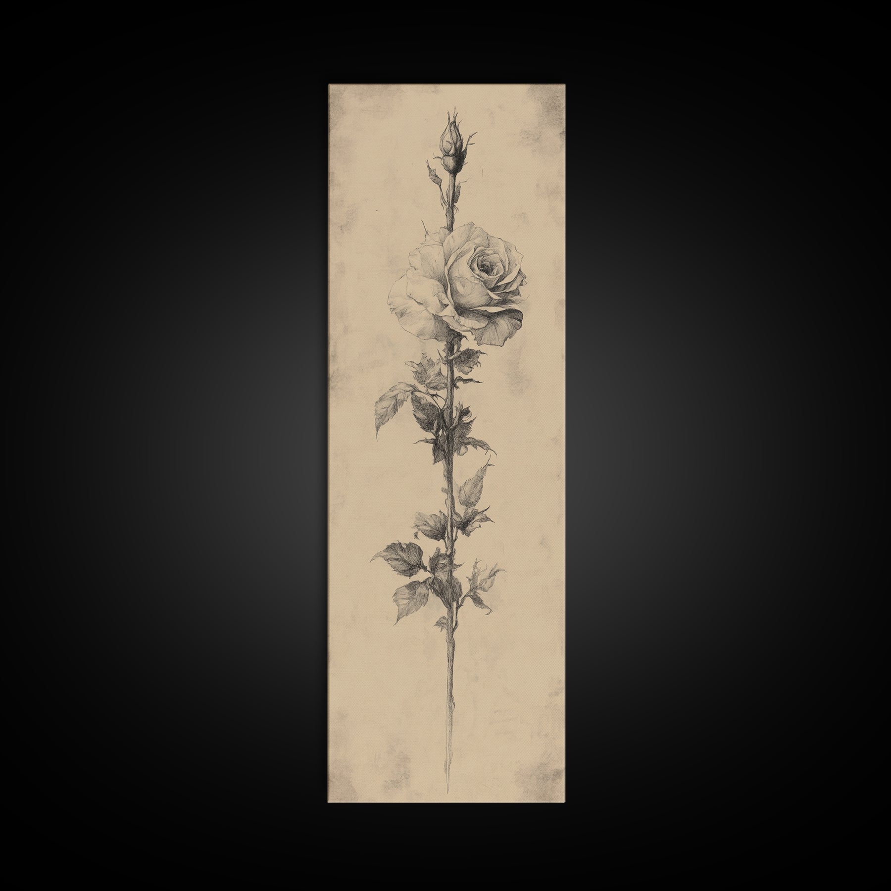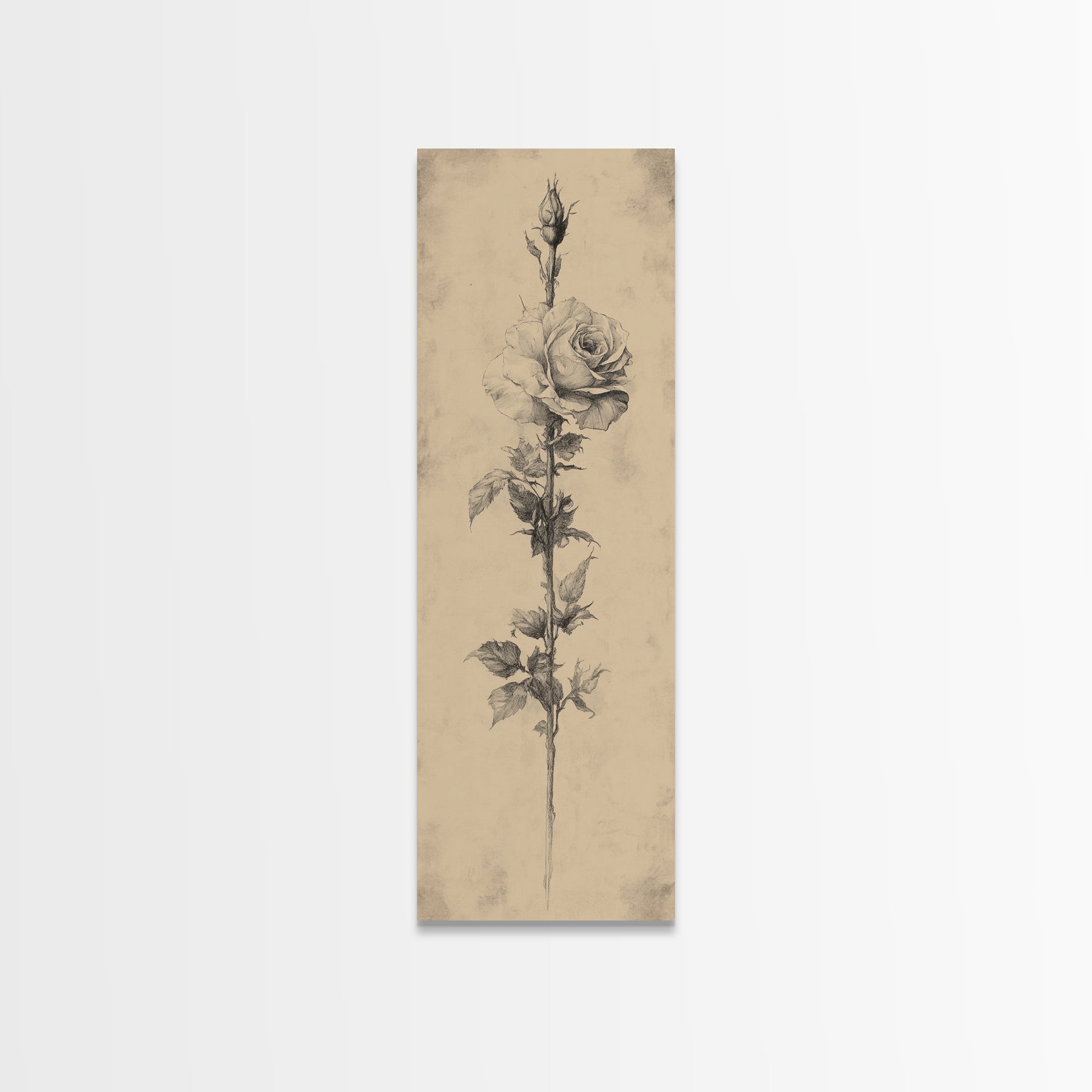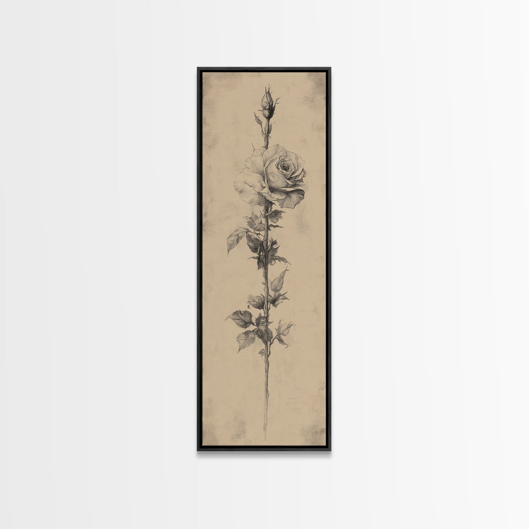 Black and White Sketch of a Rose, Framed Canvas Print, Narrow Art, Tall Skinny Art, Flower Painting, Paint of a Rose, Floral Prints
