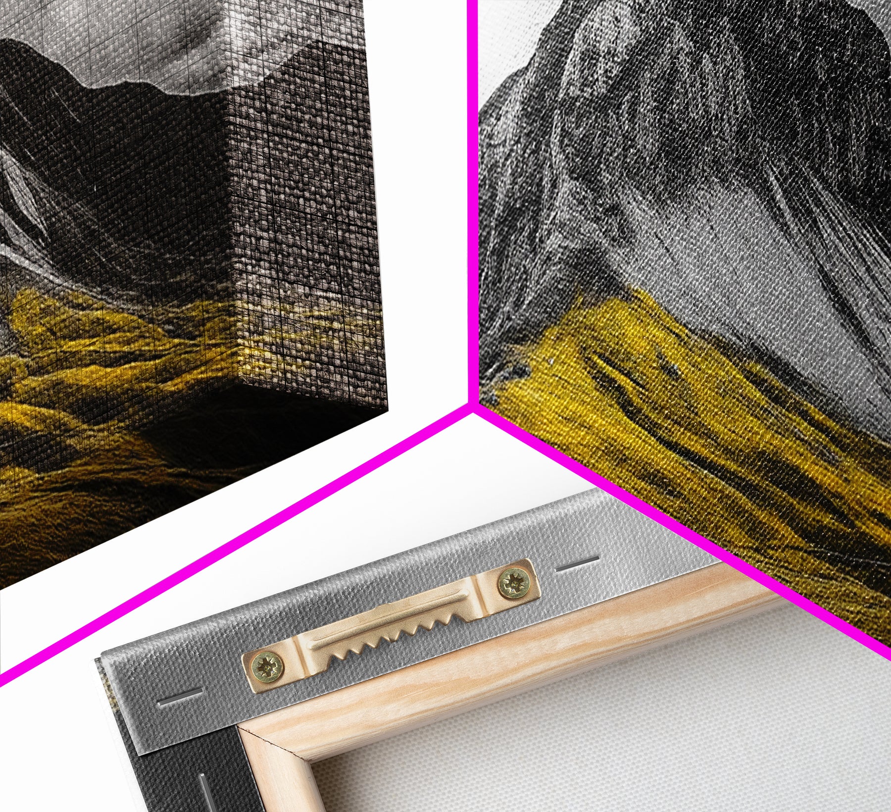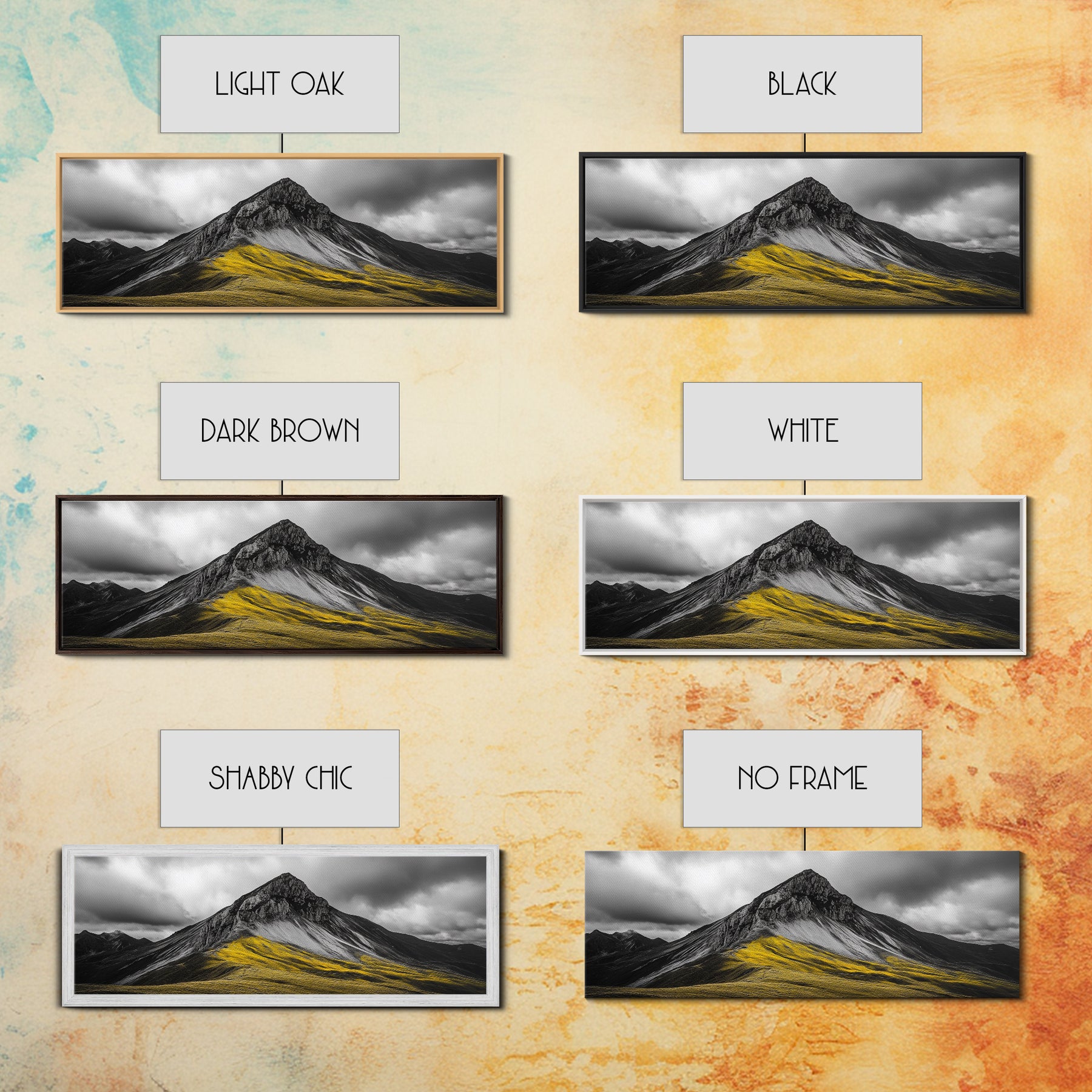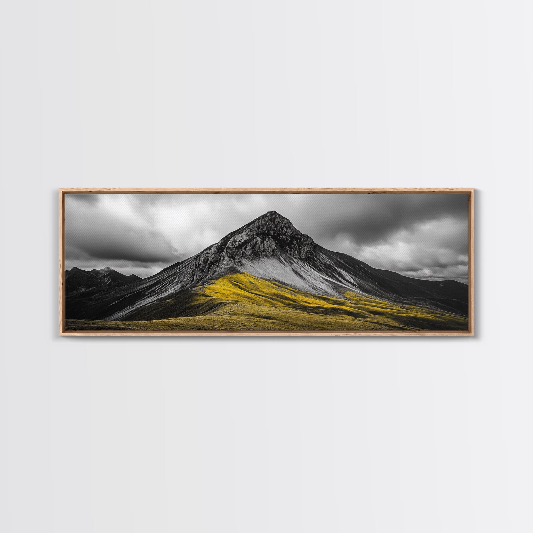 Black Mountain Peak, Moody Sky, Bold Yellow Hillside, Framed Canvas Print, Nature Art, Bedroom Wall Decor, Modern Landscape Print