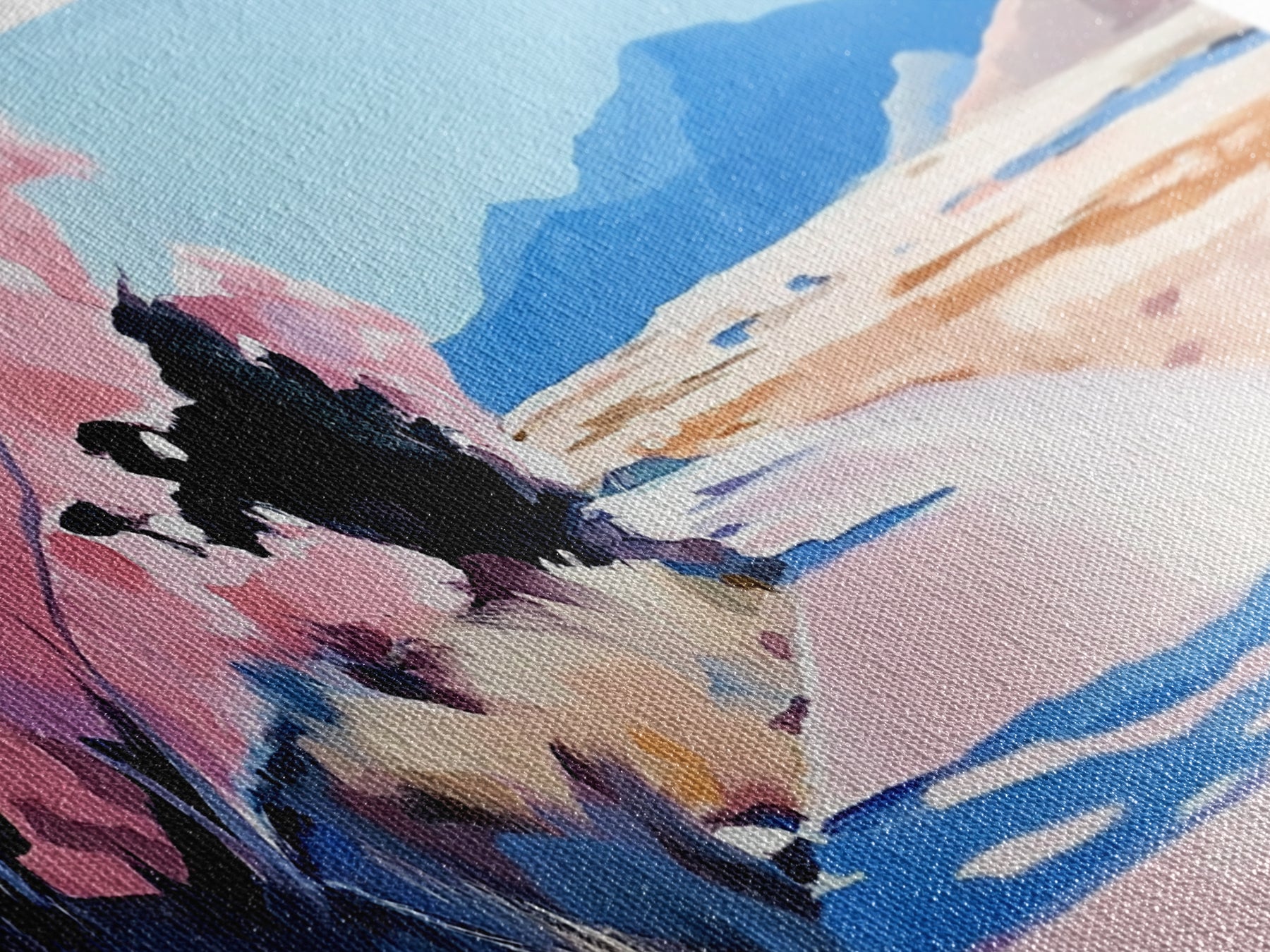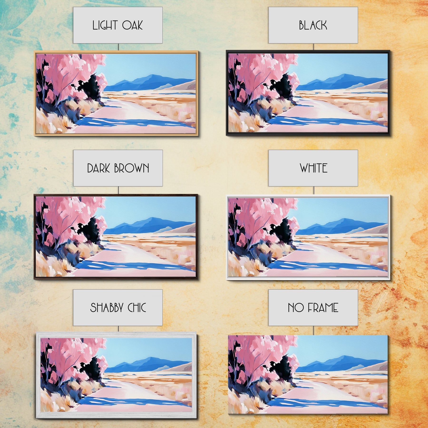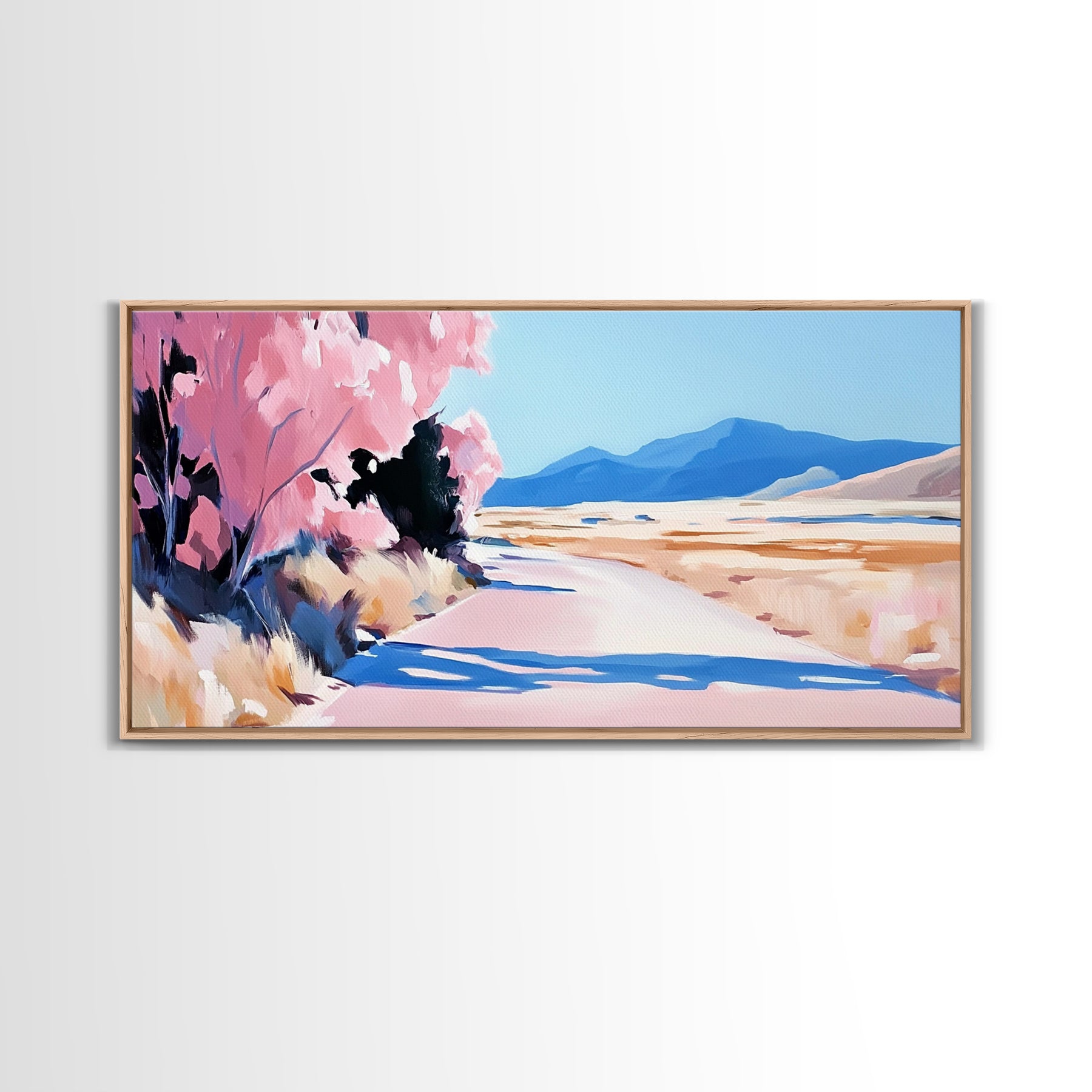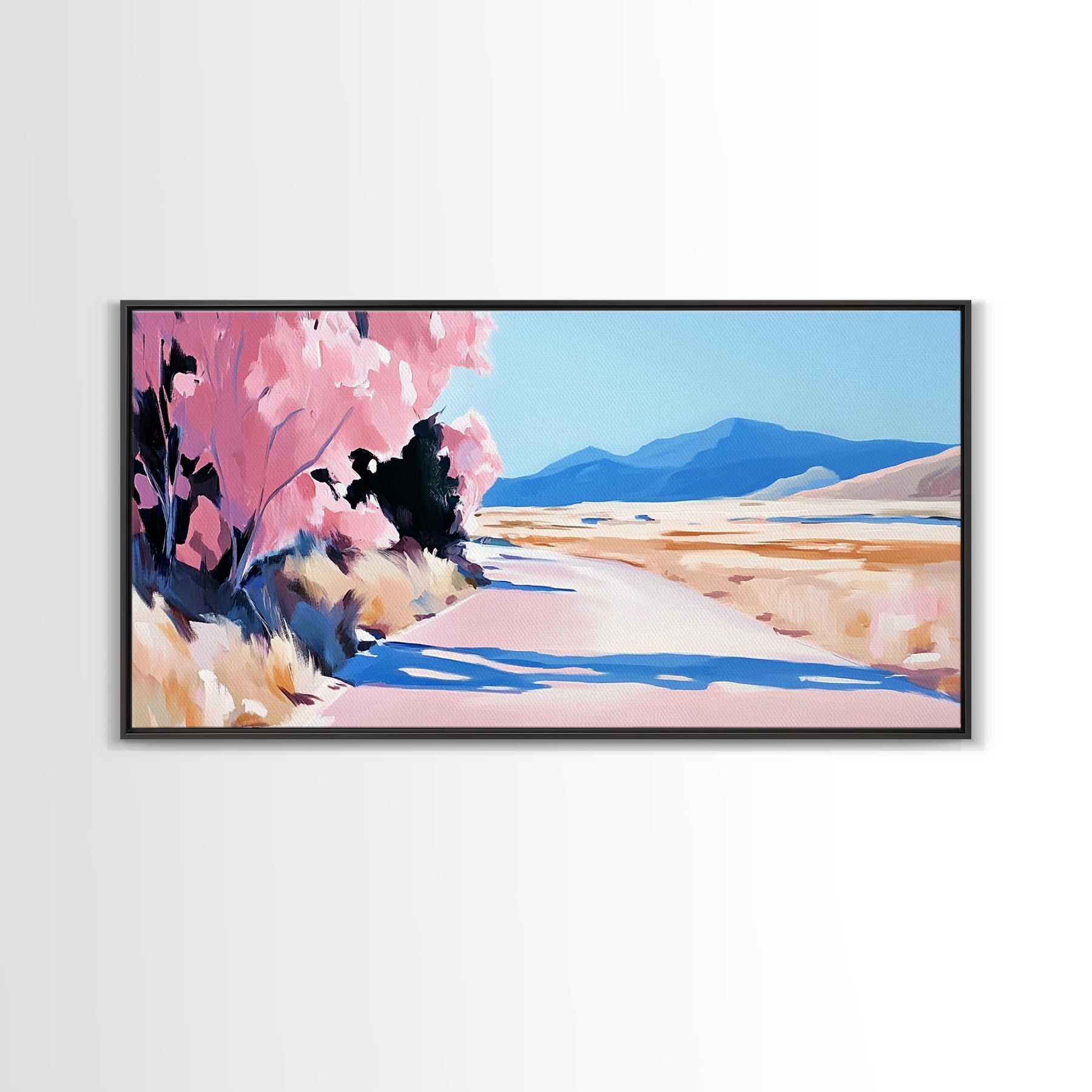 Blossoms, Mountain Path, Scenic Landscape Art, Nature Painting, Boho Decor, Framed Canvas Print, Pastel Pink Trees, Serene Wall Art