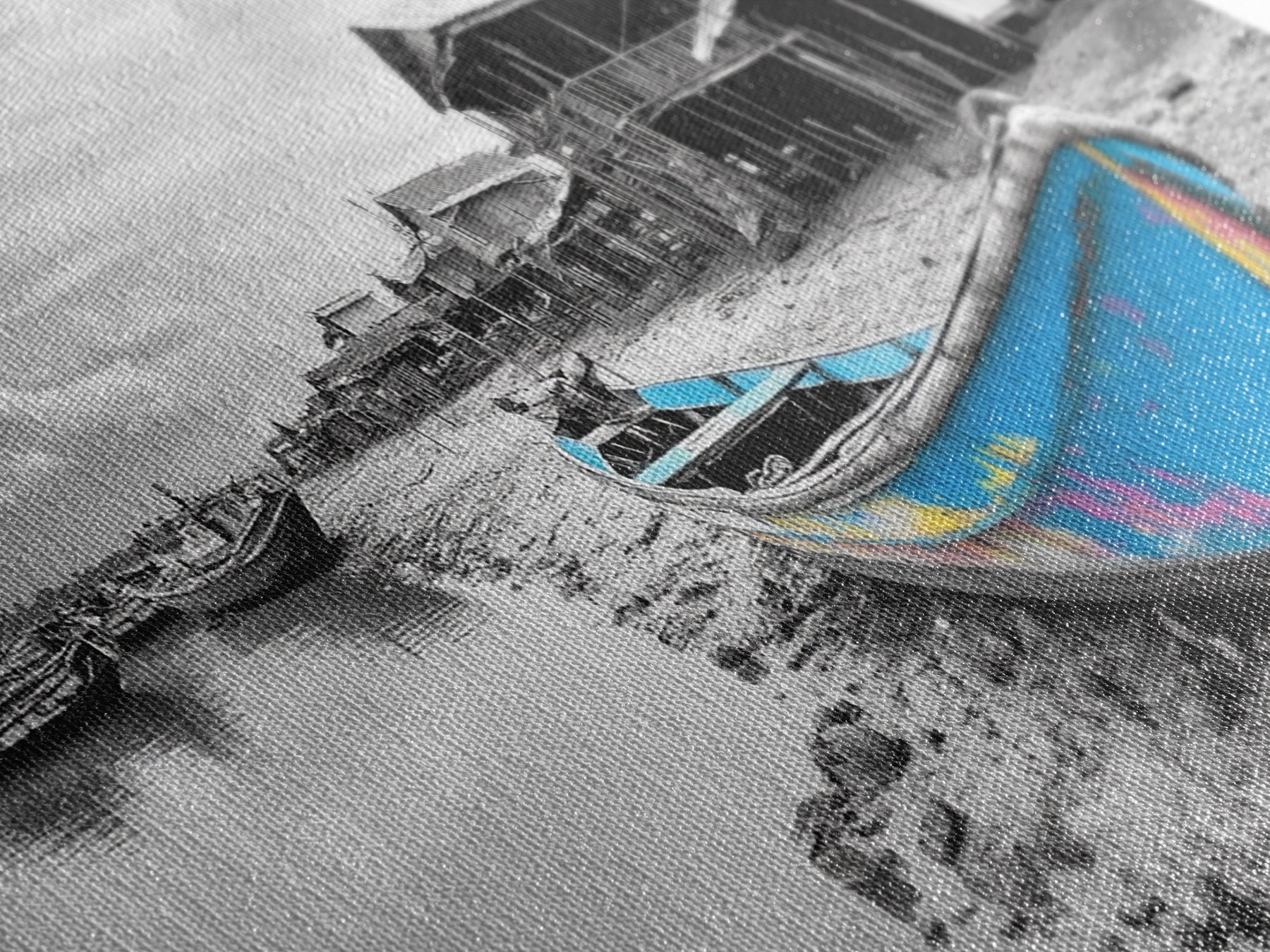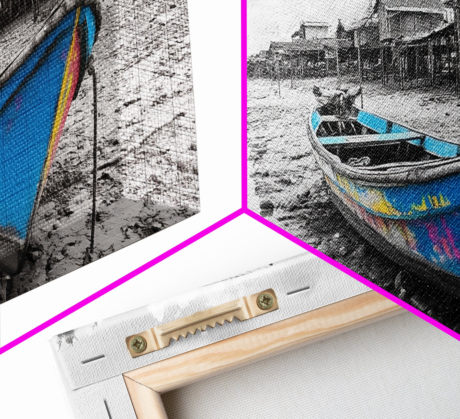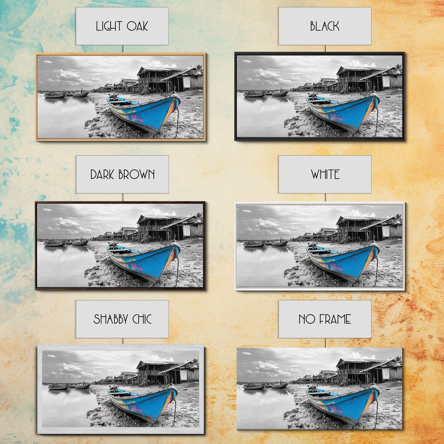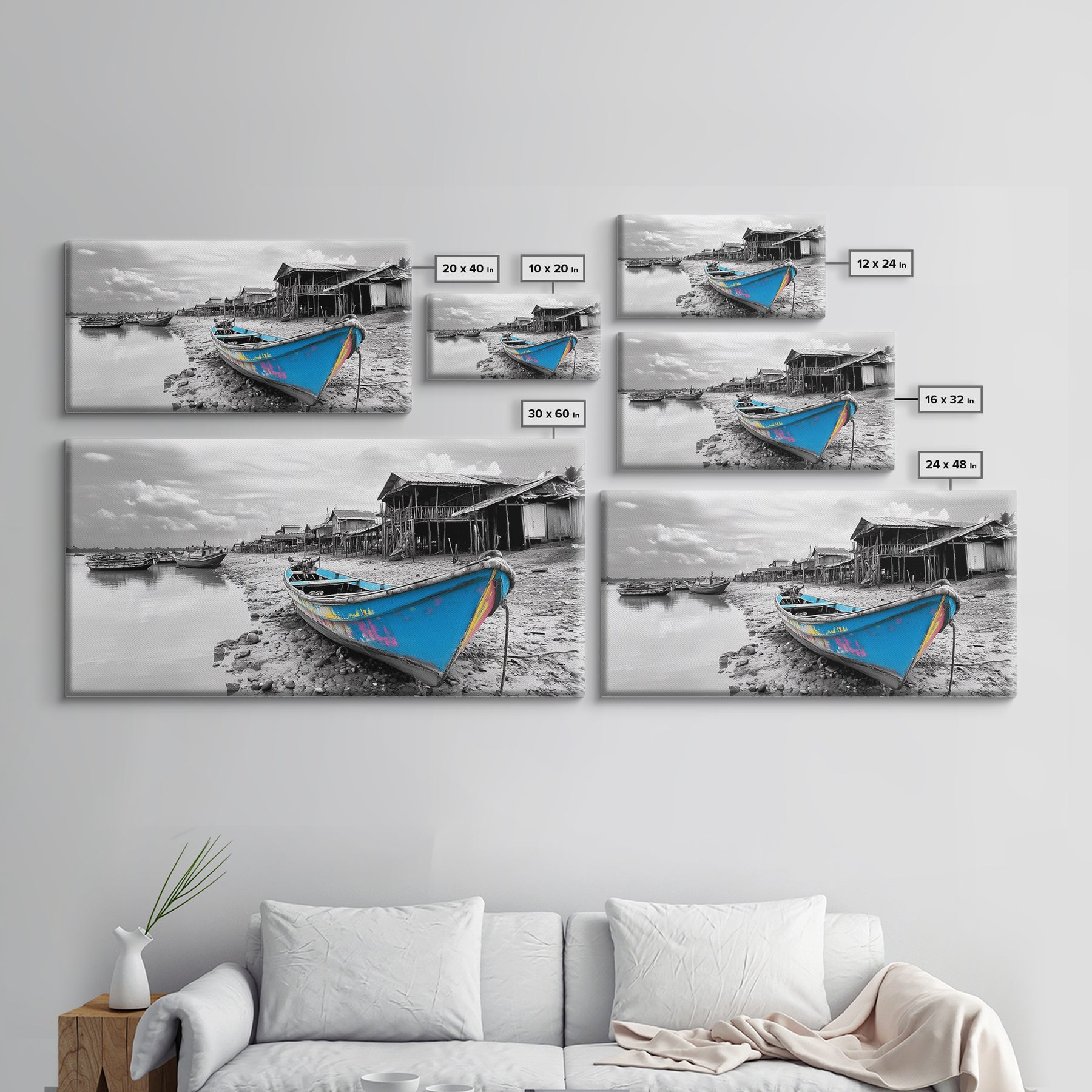 Blue Boat, Shore Village, Coastal Charm, Framed Canvas Print, Rustic Fishing Art, Seaside Home Decor, Nautical Style, Ocean Wall Art