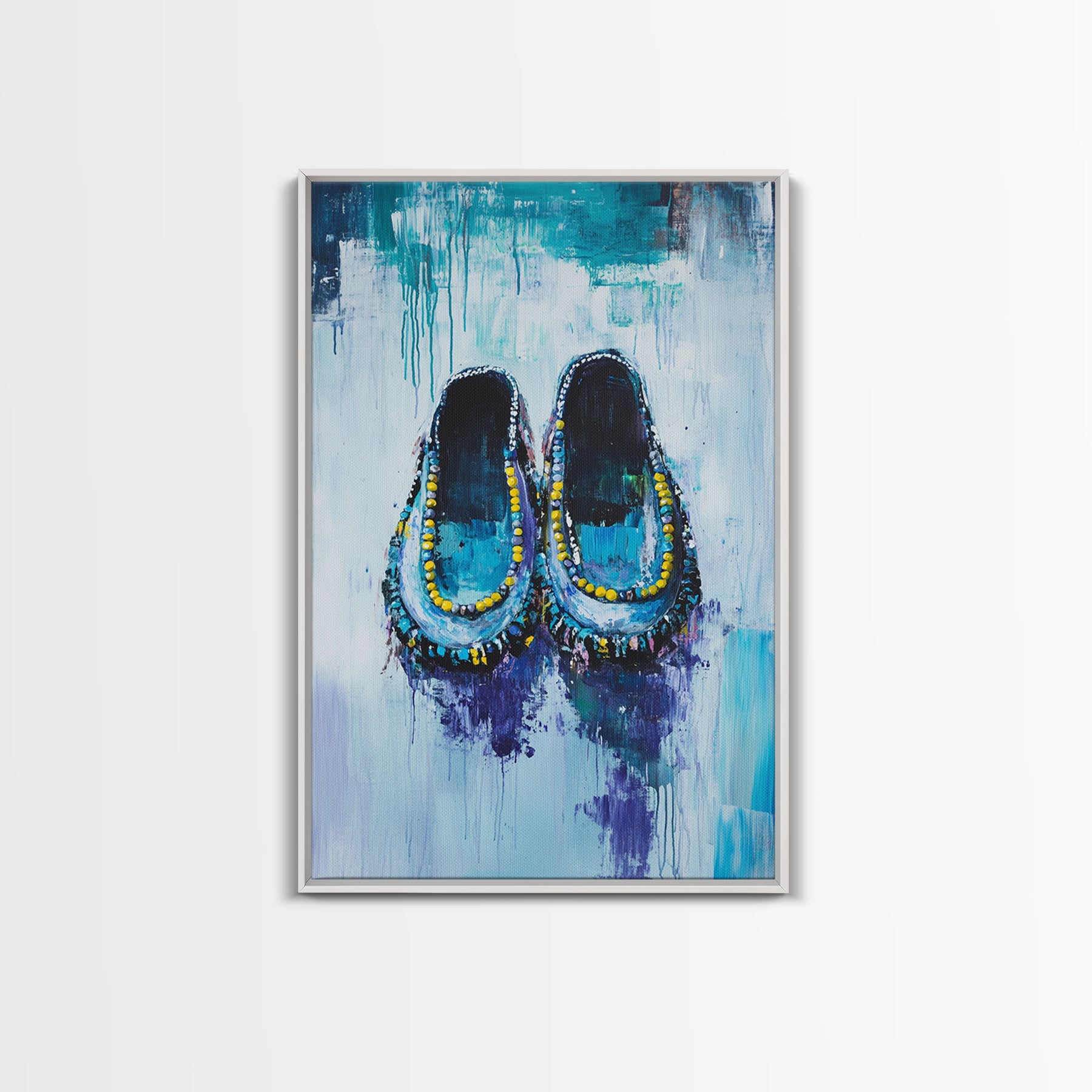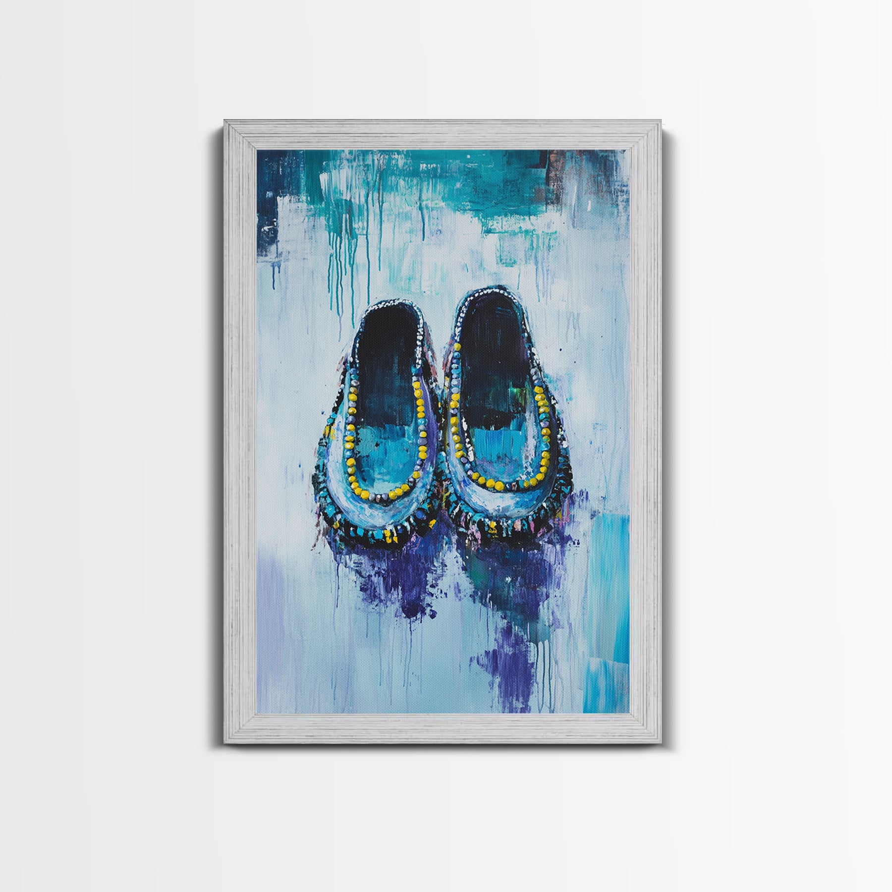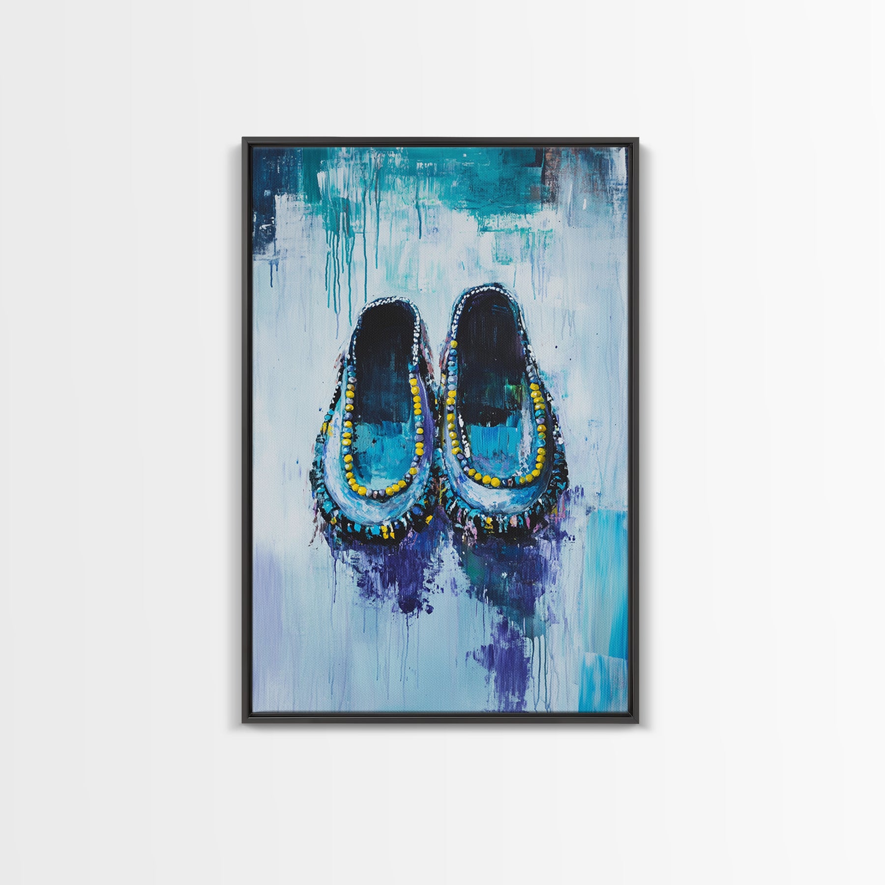 Blue Moccasins, boho art, whimsical art, teal wall art, folk art, rustic art, gift idea for her, original painting, canvas print