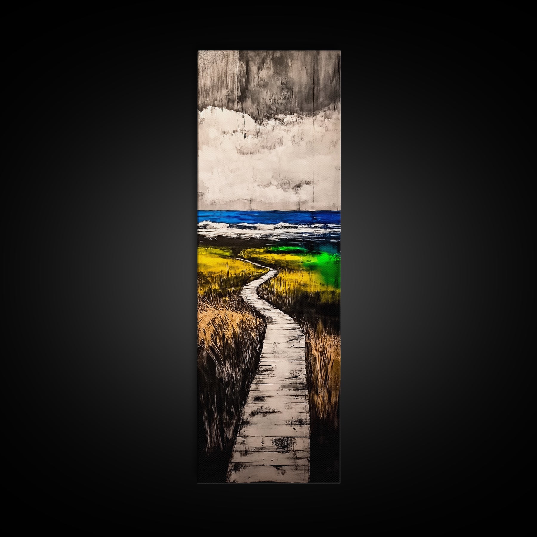 Boardwalk, Beach Path Art, Coastal Living Room Decor, Ocean Horizon Print, Tranquil Landscape, Relaxing Home Aesthetic, Framed Canvas Print