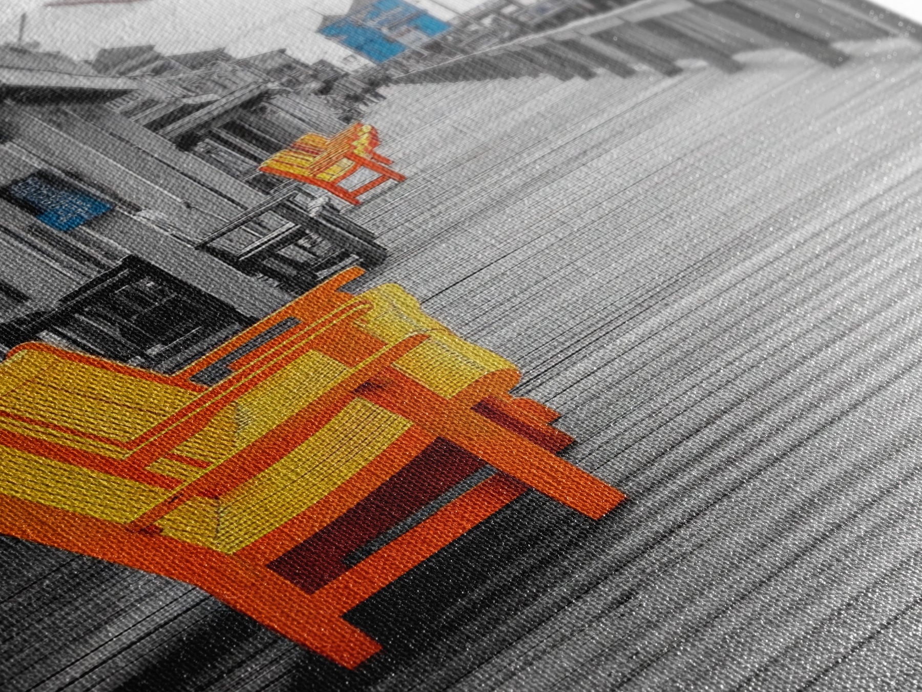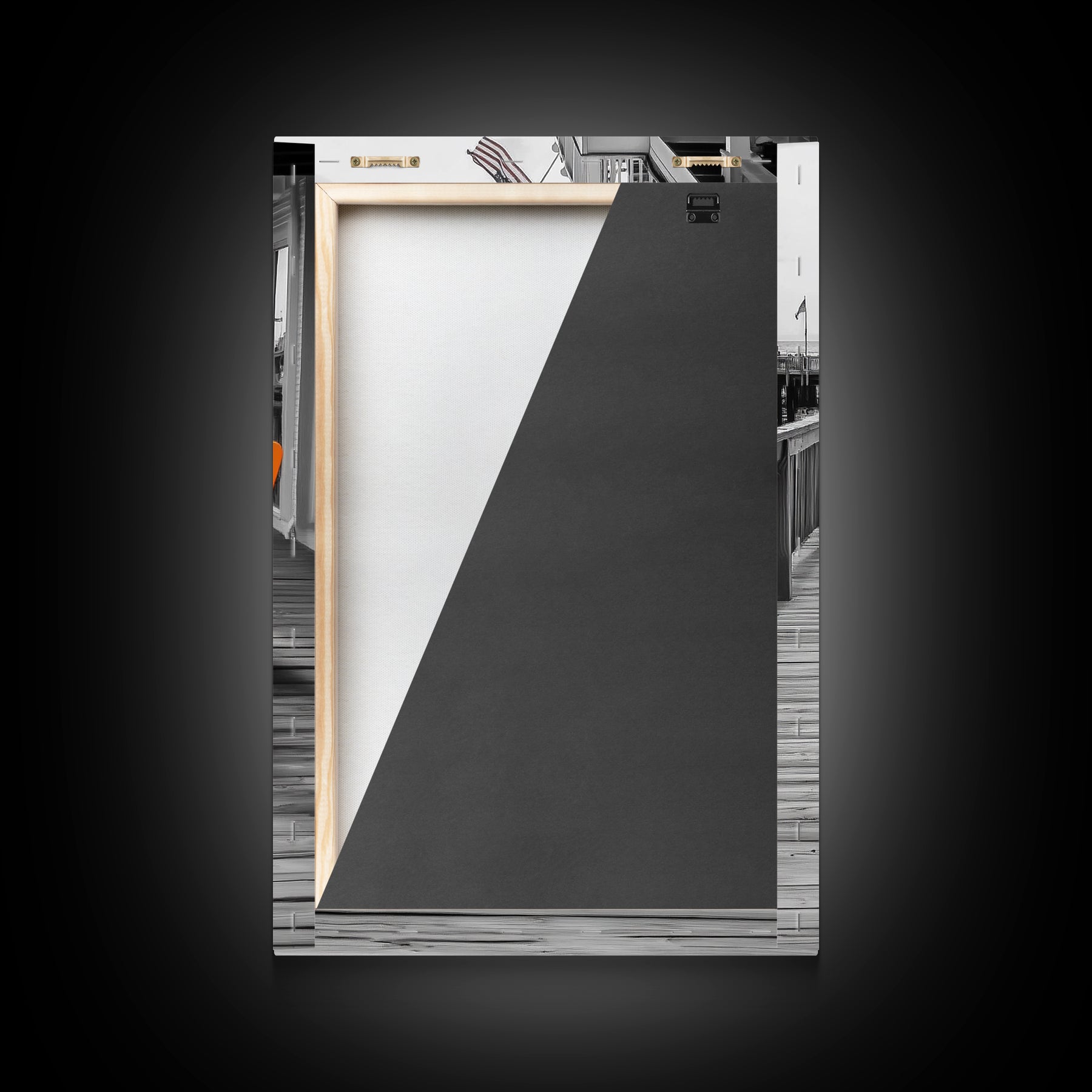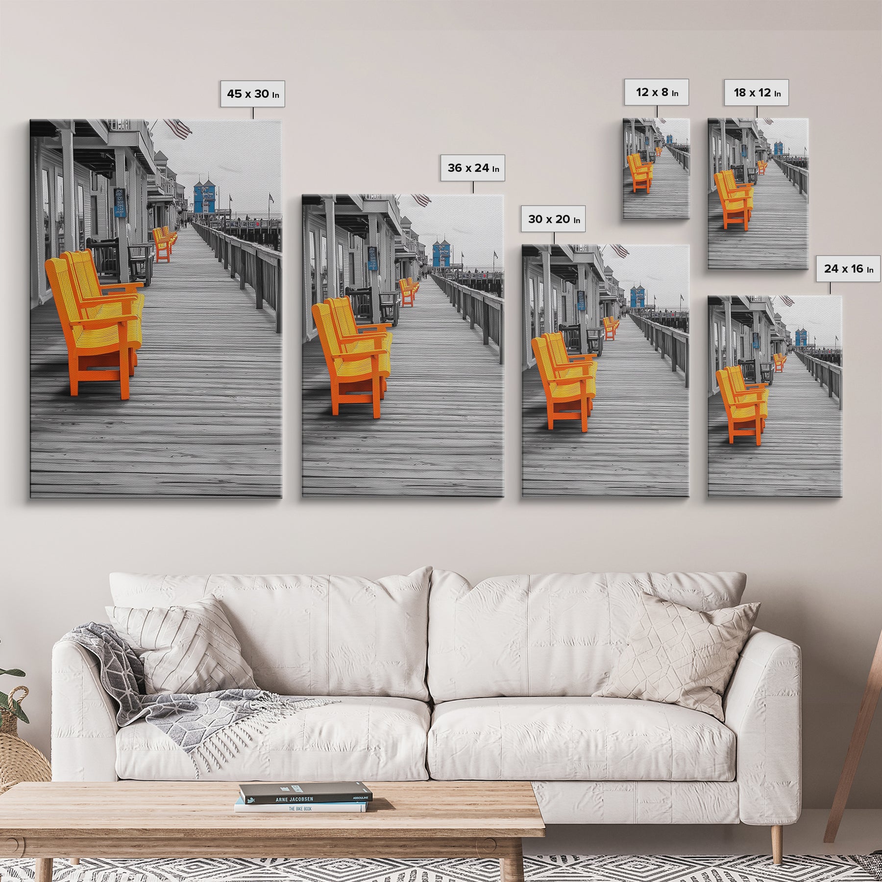 Boardwalk Chairs, Orange Seating, Coastal Town, Wooden Path, Framed Canvas Print beach town photography, nautical home decor, coastal art