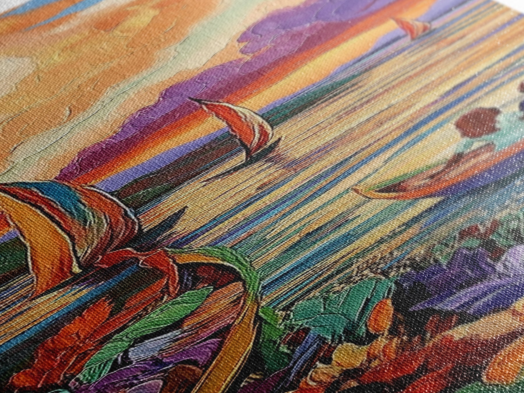 Most of our canvases are made in the USA, with the exception of canvases ordered with the light oak unstained frames, and any large canvases (24x48, 30x60, 16x48 and 20x60) ordered WITH a frame. These are temporarily made in and shipped from Europe, while we try to find a more consistent supplier in the USA.