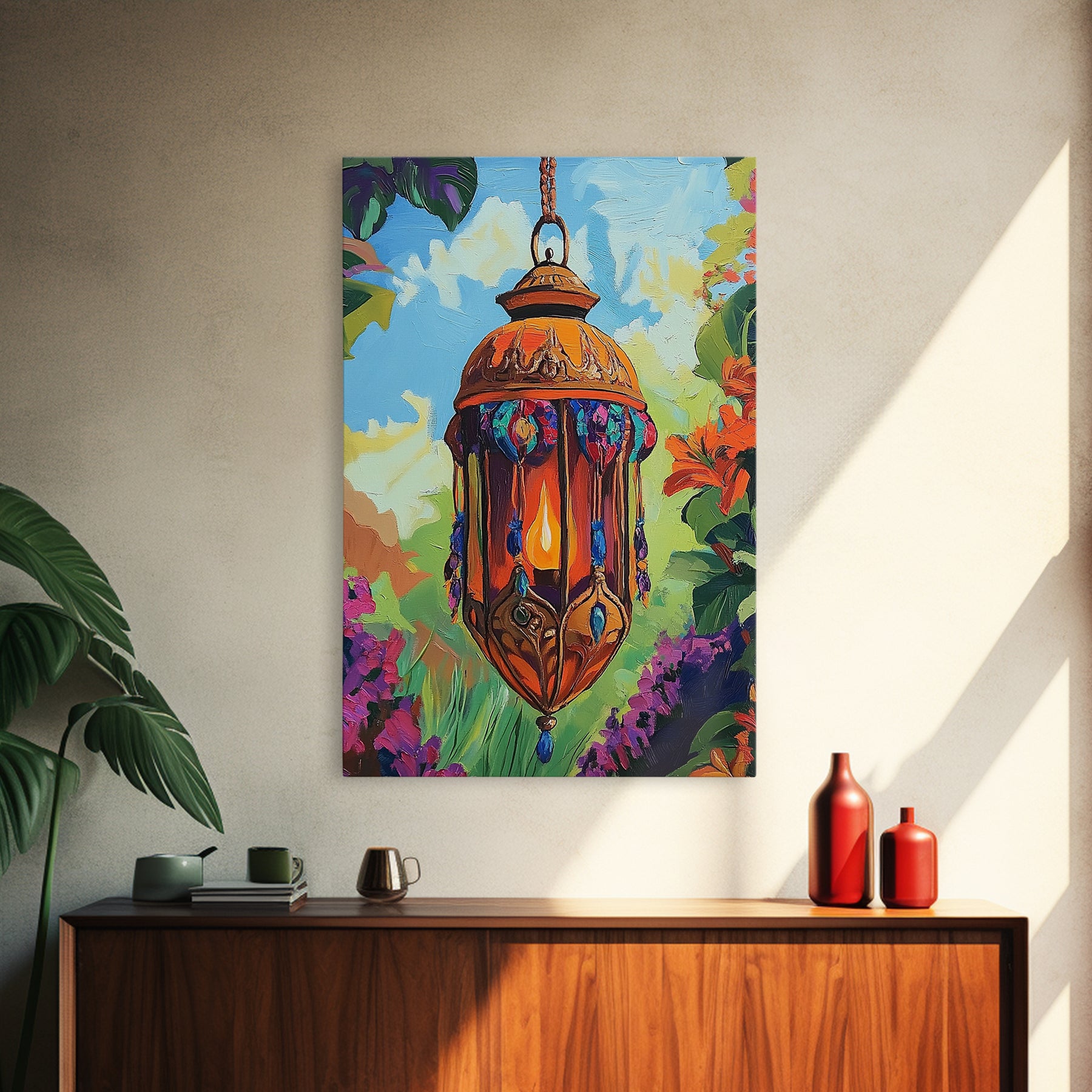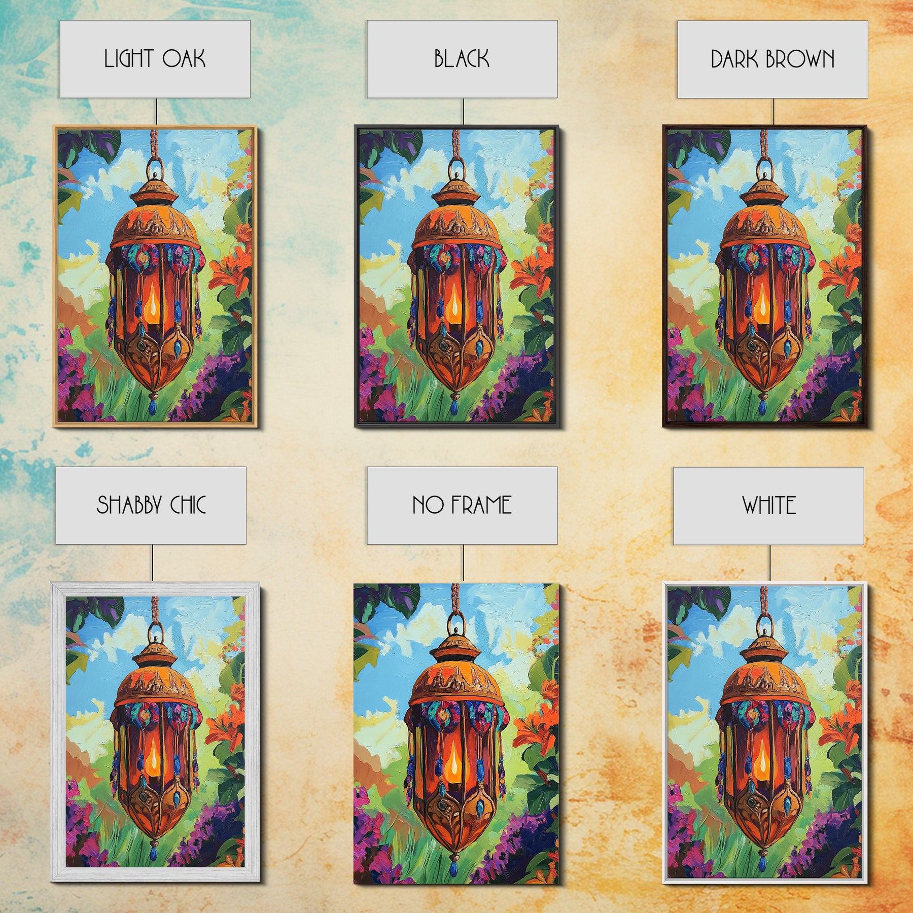 Boho Lantern, Glow, Garden, Framed Canvas Print, Moroccan Lantern Art, Boho Wall Decor, Eclectic Lighting Artwork, Patio Living Room Art