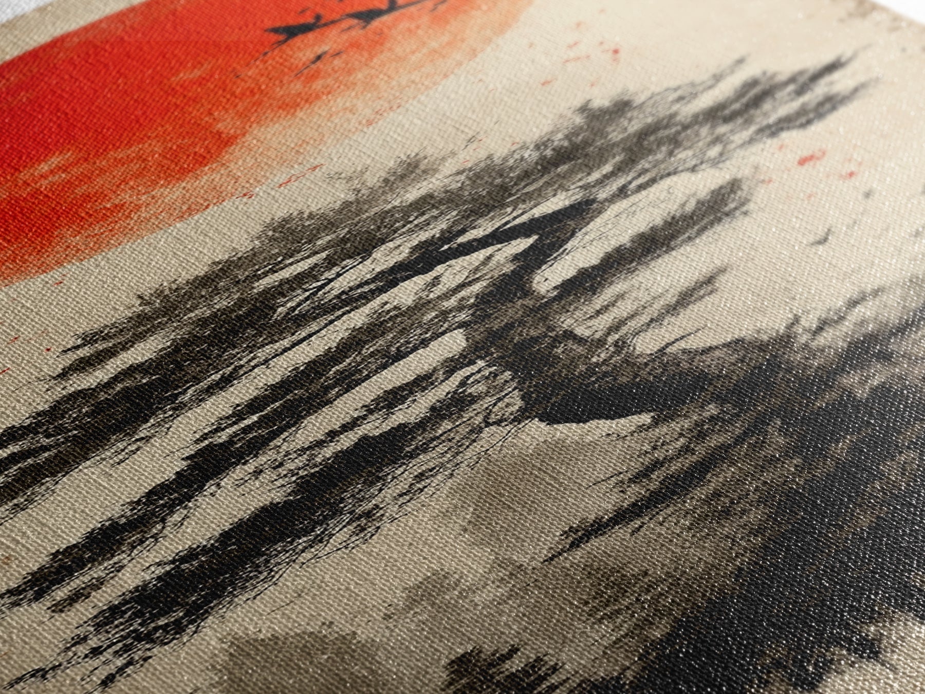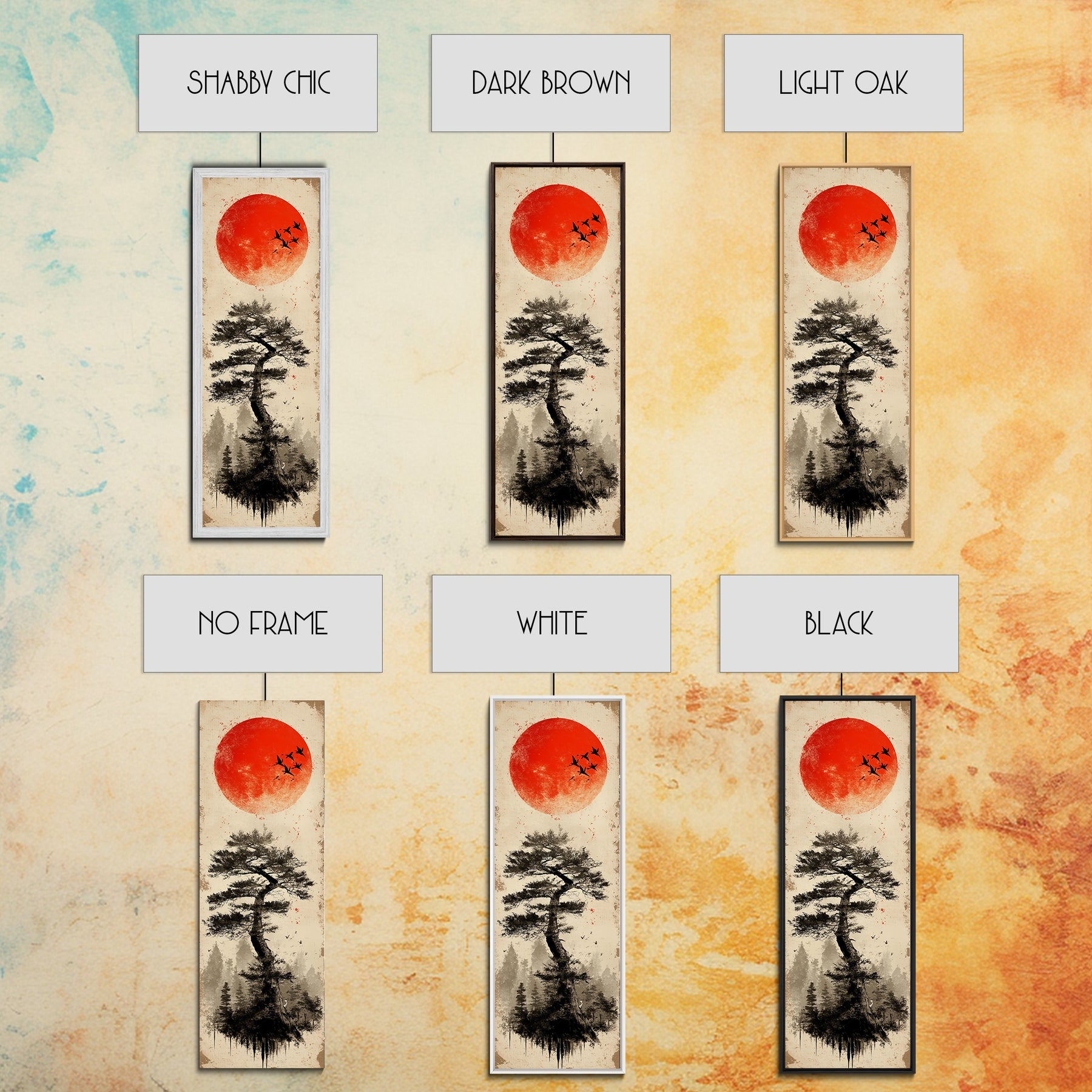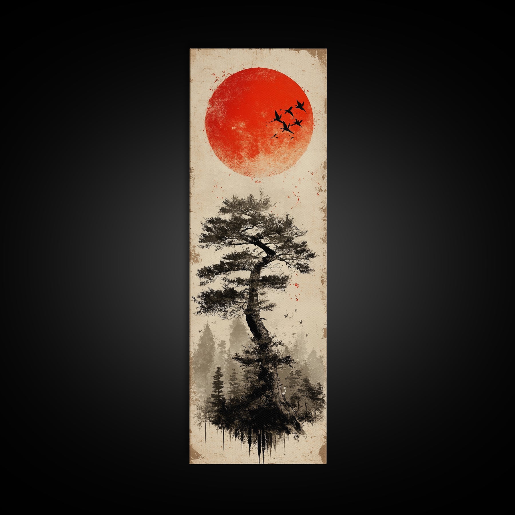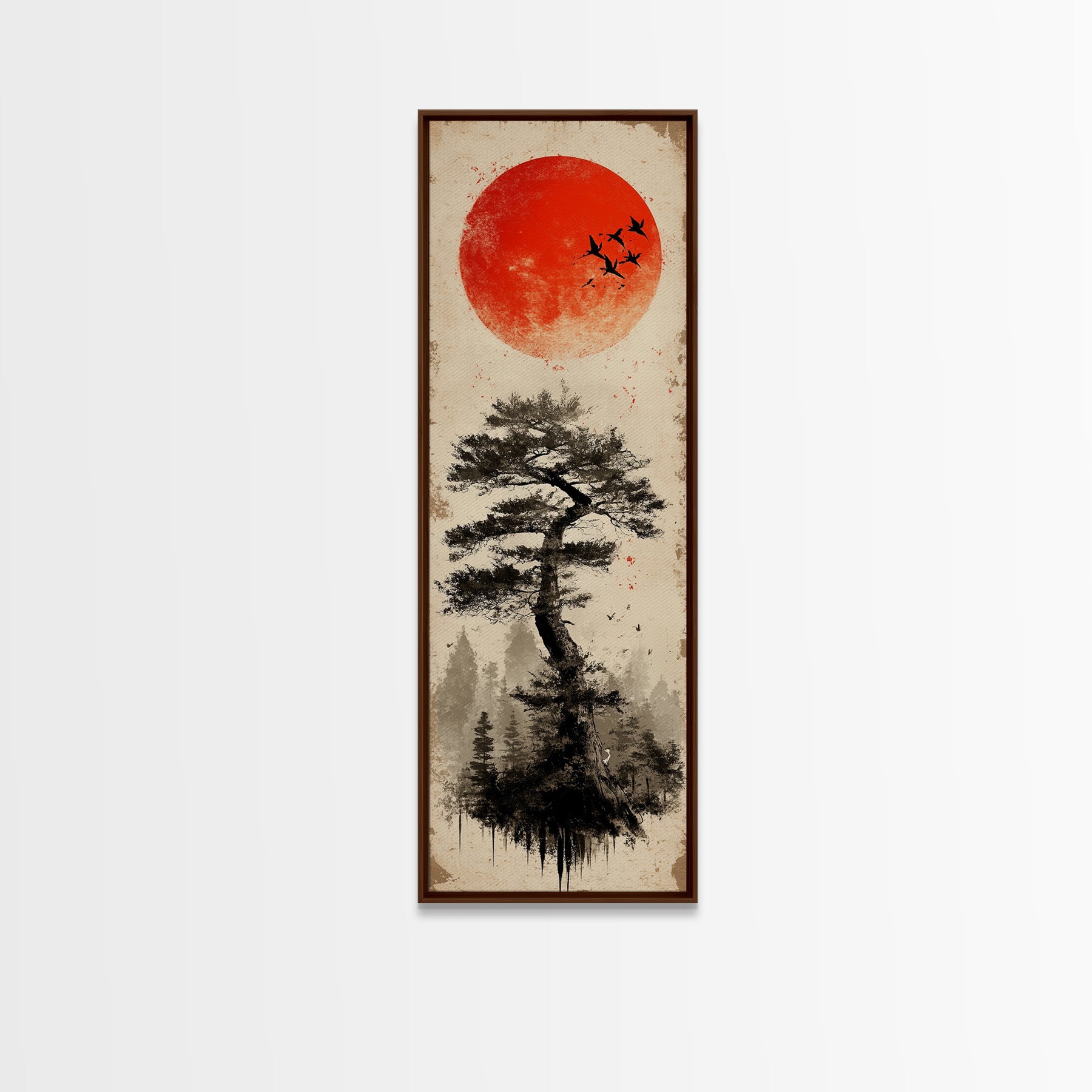 Bold Red Sun Pine Tree Framed Canvas Print Japanese Inspired Minimalist Wall Art Rustic Zen Decor Unique Vertical Nature Artwork