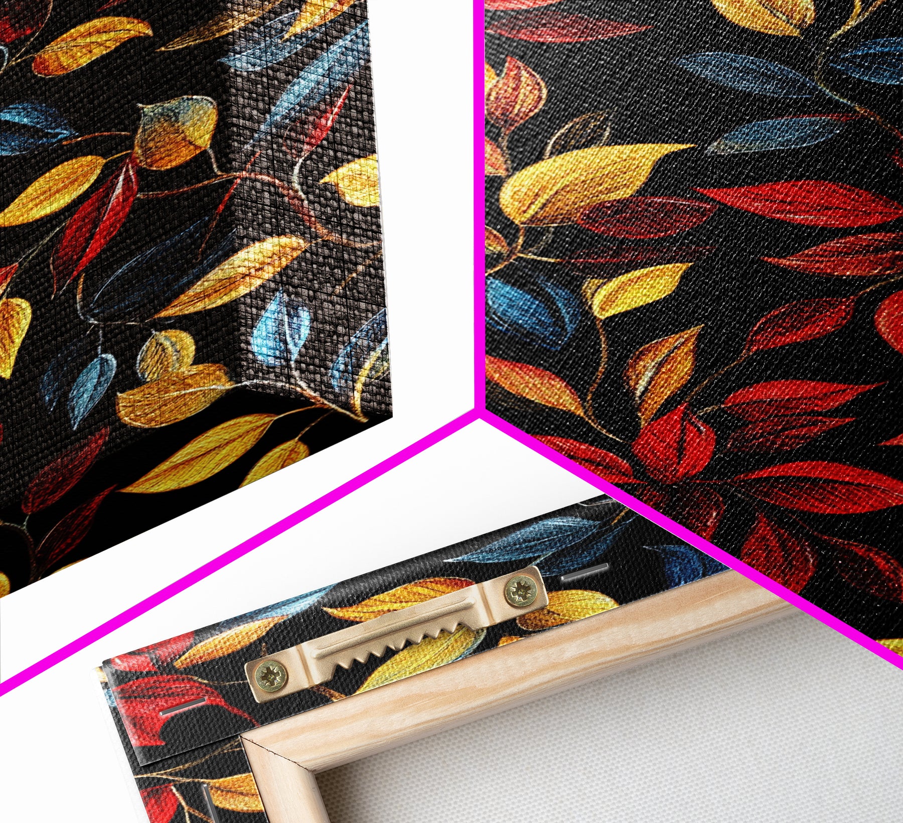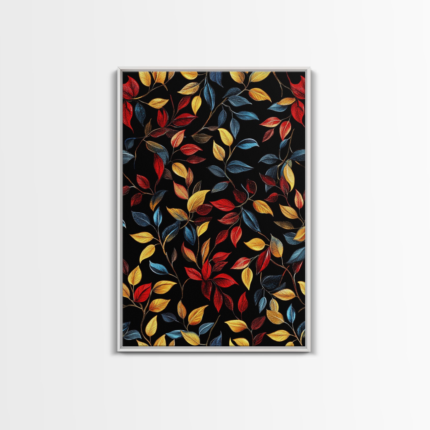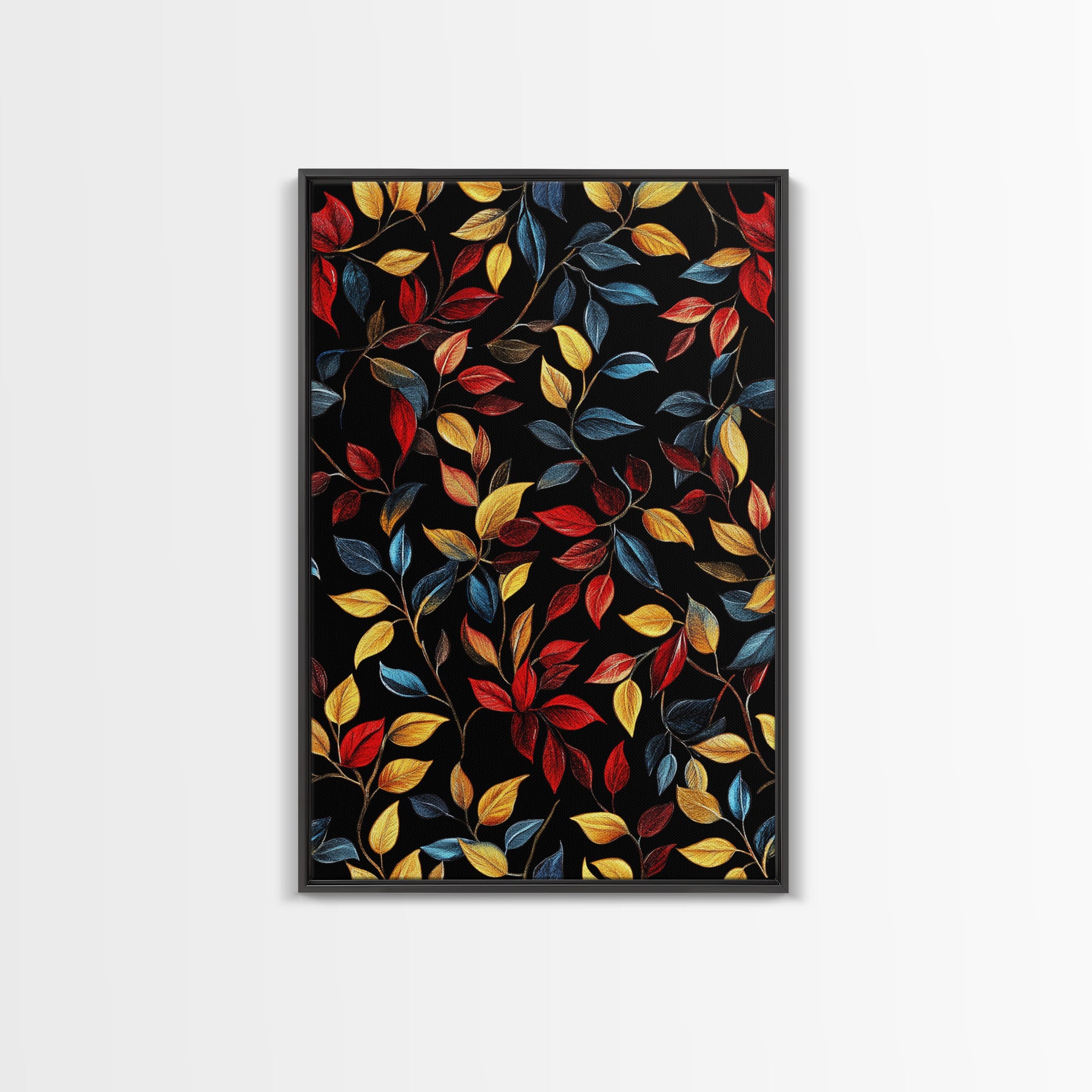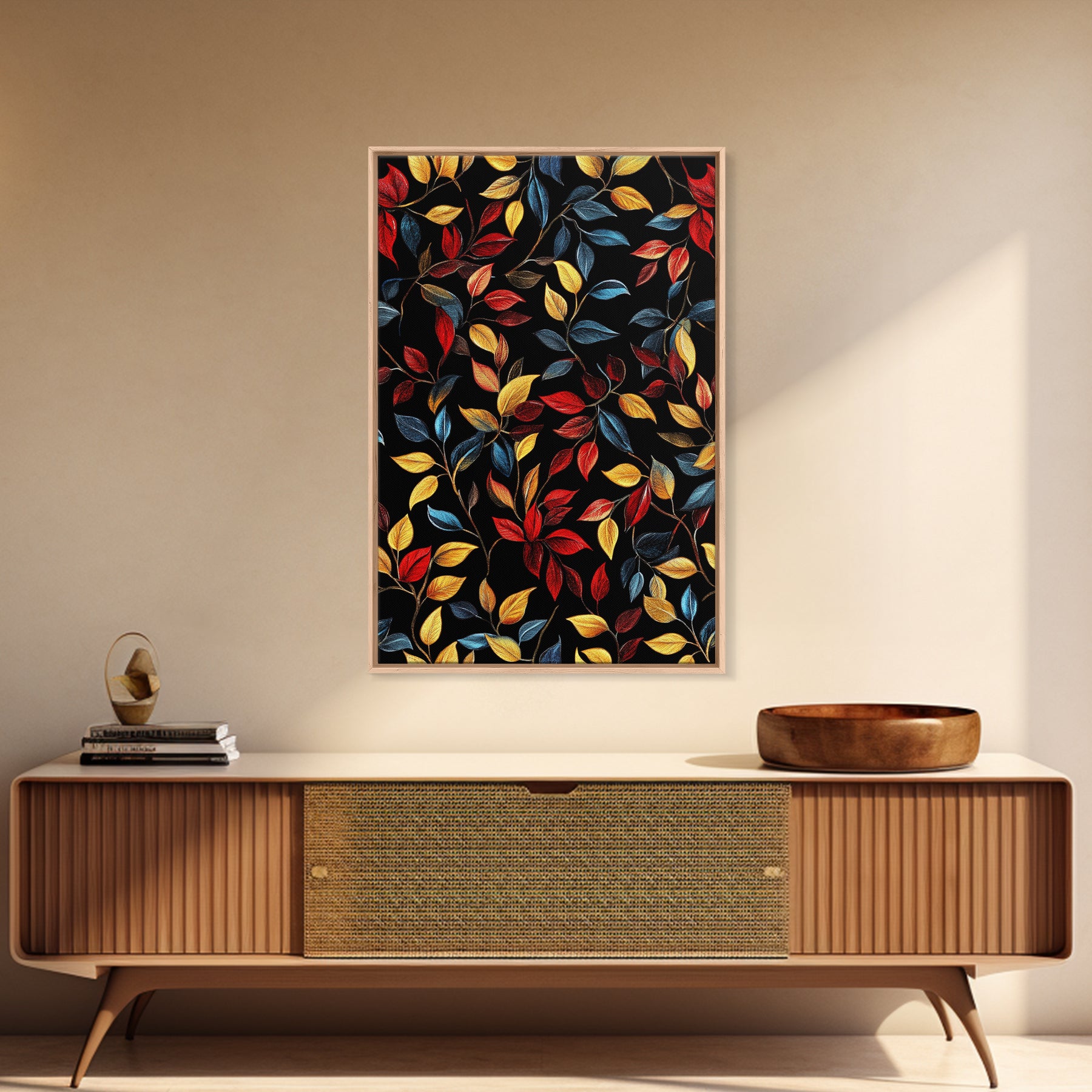 Botanical Fall Leaves Art Print On Canvas with Wood Frame, Black Background, Retro Style Home Decor