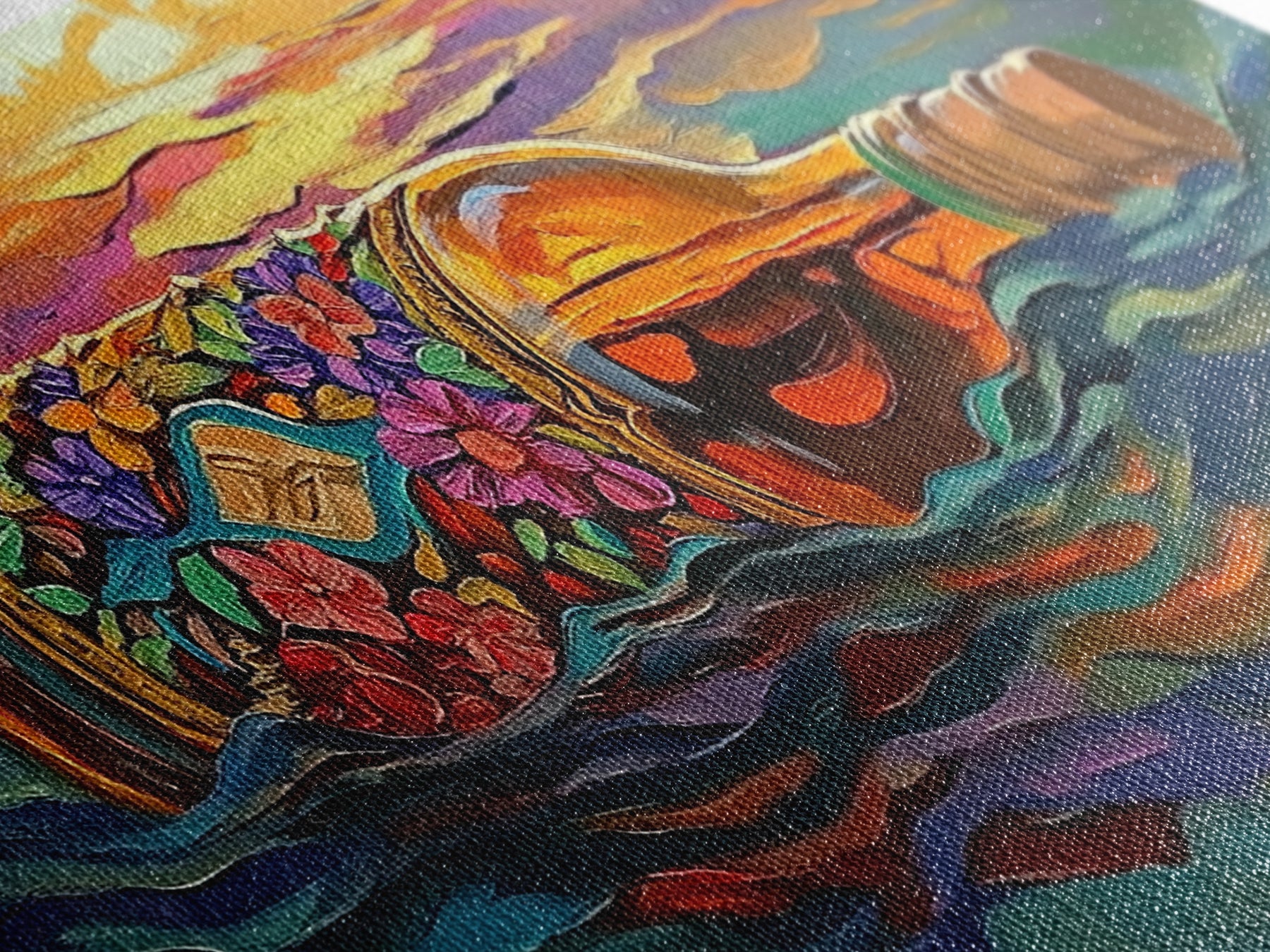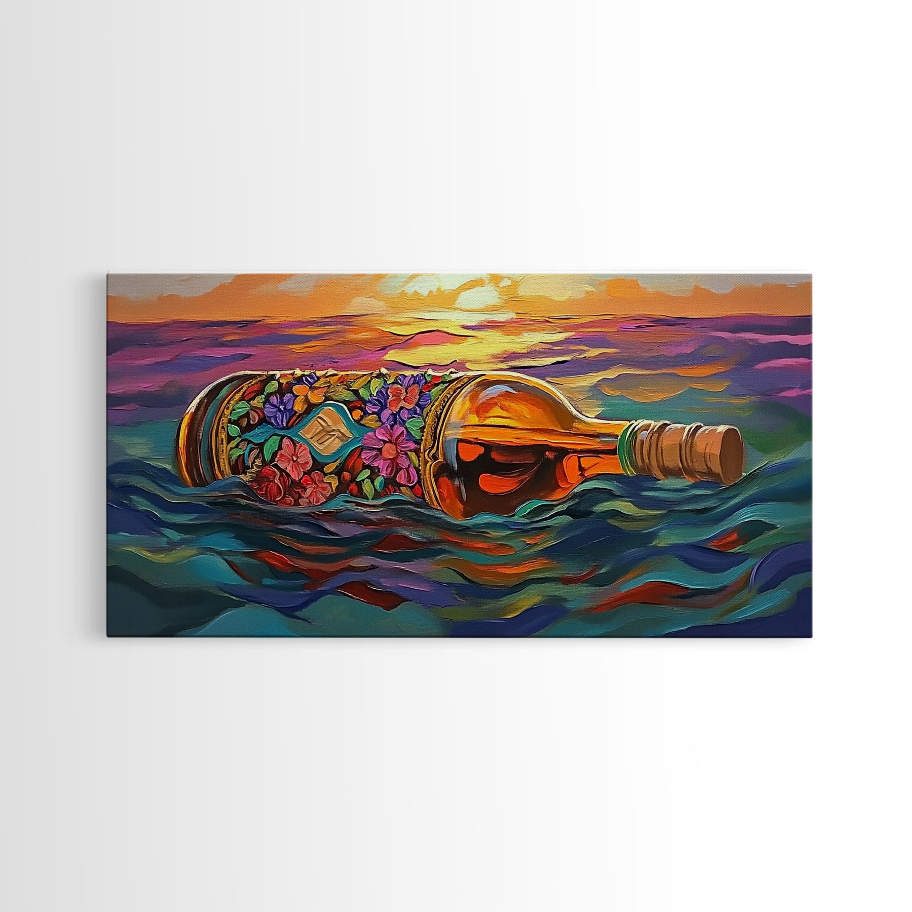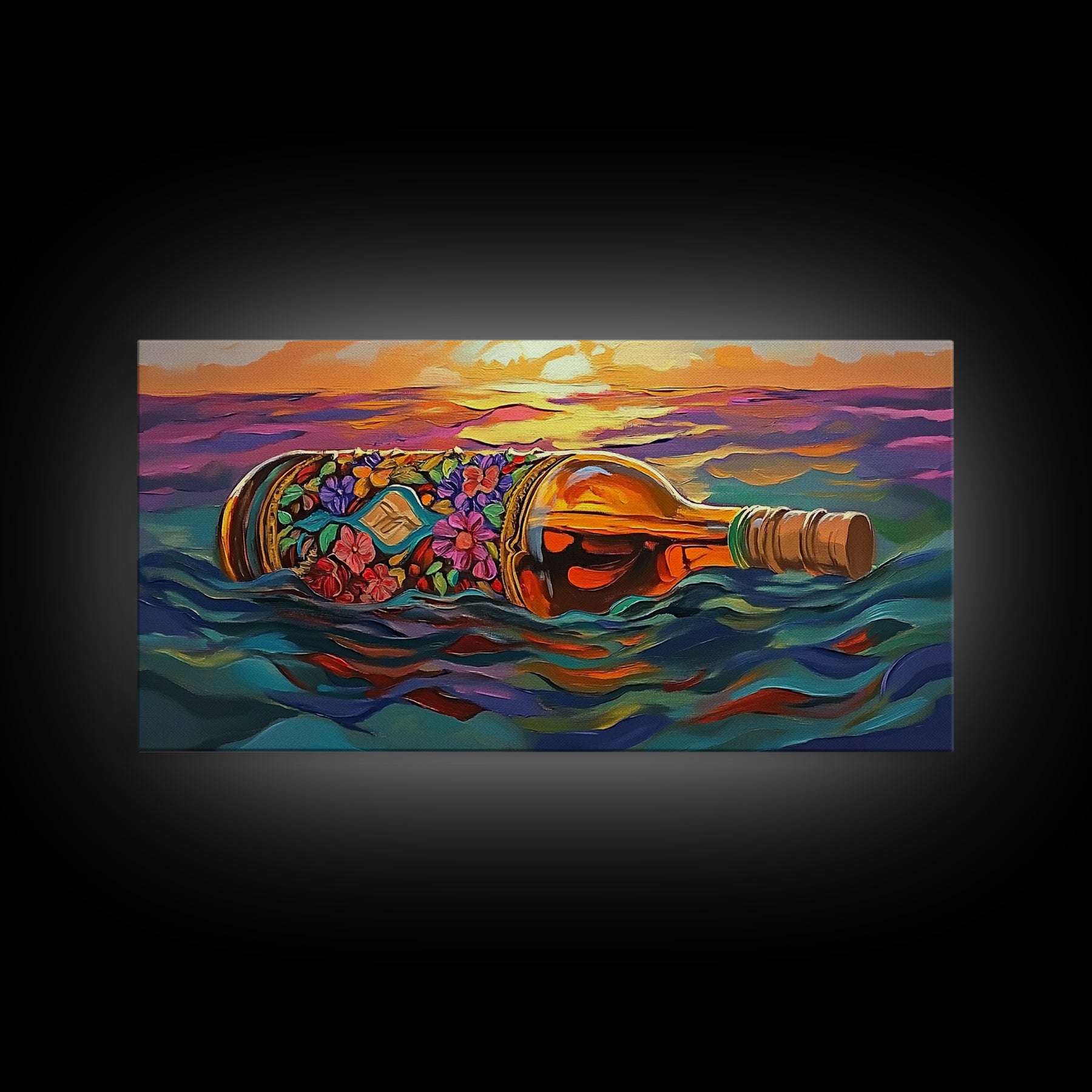 Bottle Ocean, Sunset, Flowers, Framed Canvas Print tropical beach bathroom decor, coastal boho wall art, floral message bottle painting