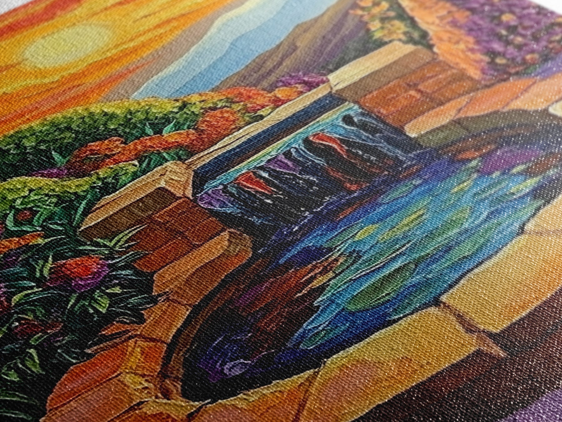 Most of our canvases are made in the USA, with the exception of canvases ordered with the light oak unstained frames, and any large canvases (24x48, 30x60, 16x48 and 20x60) ordered WITH a frame. These are temporarily made in and shipped from Europe, while we try to find a more consistent supplier in the USA.