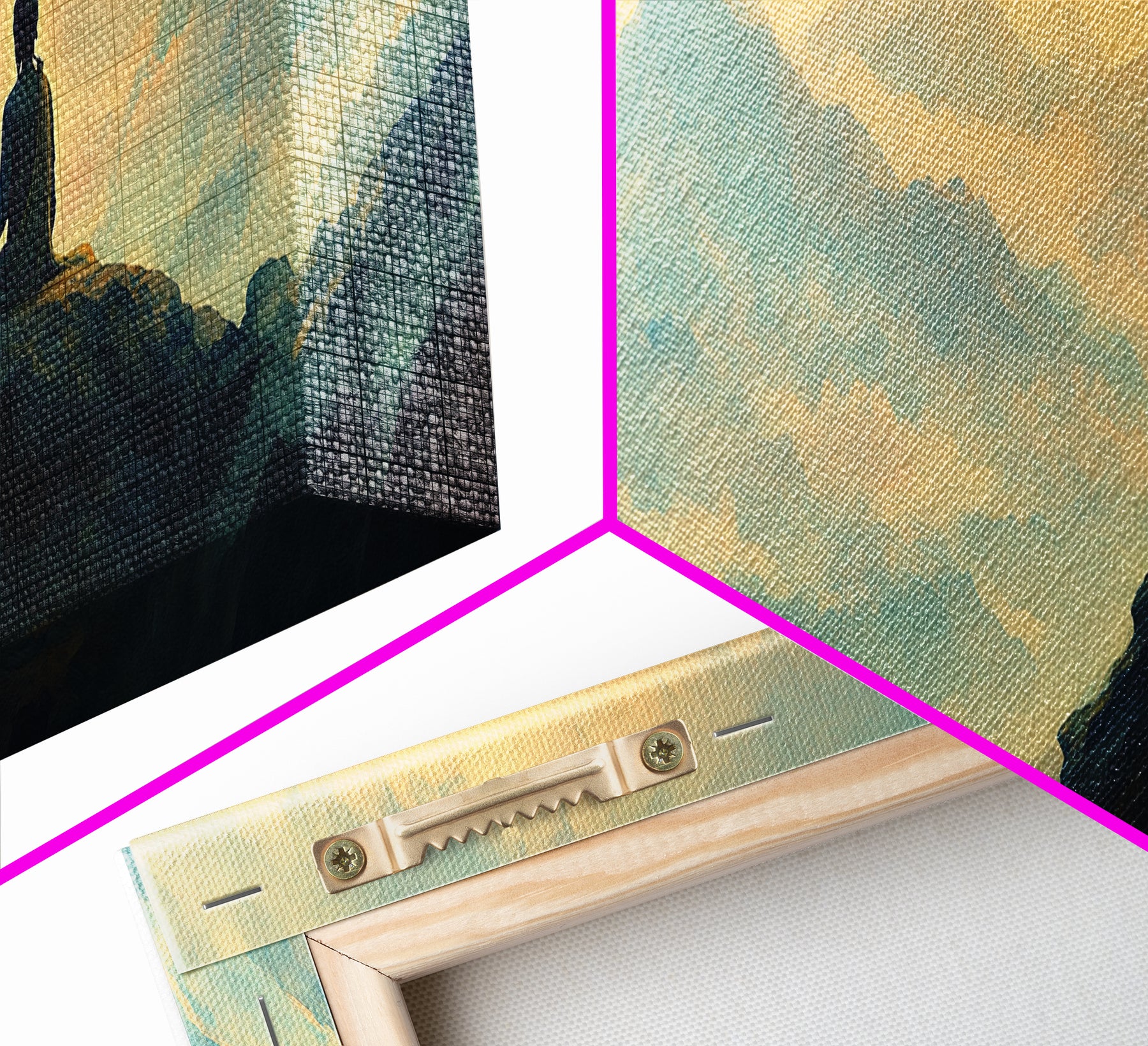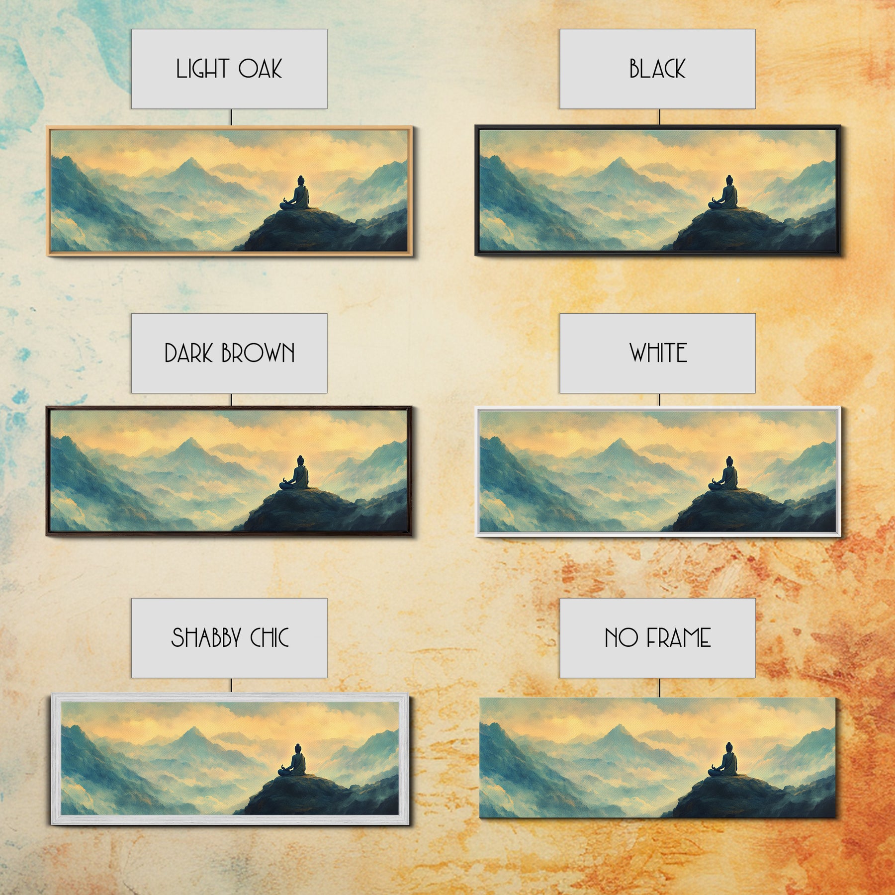 Buddha Meditating On The Mountain Framed Canvas Print, Zen Wall Art, Meditation Room Decor, Yoga Studio Decor, Panoramic Buddha Painting