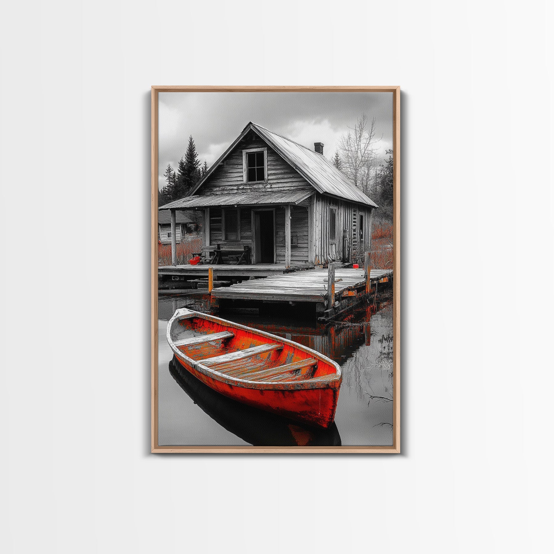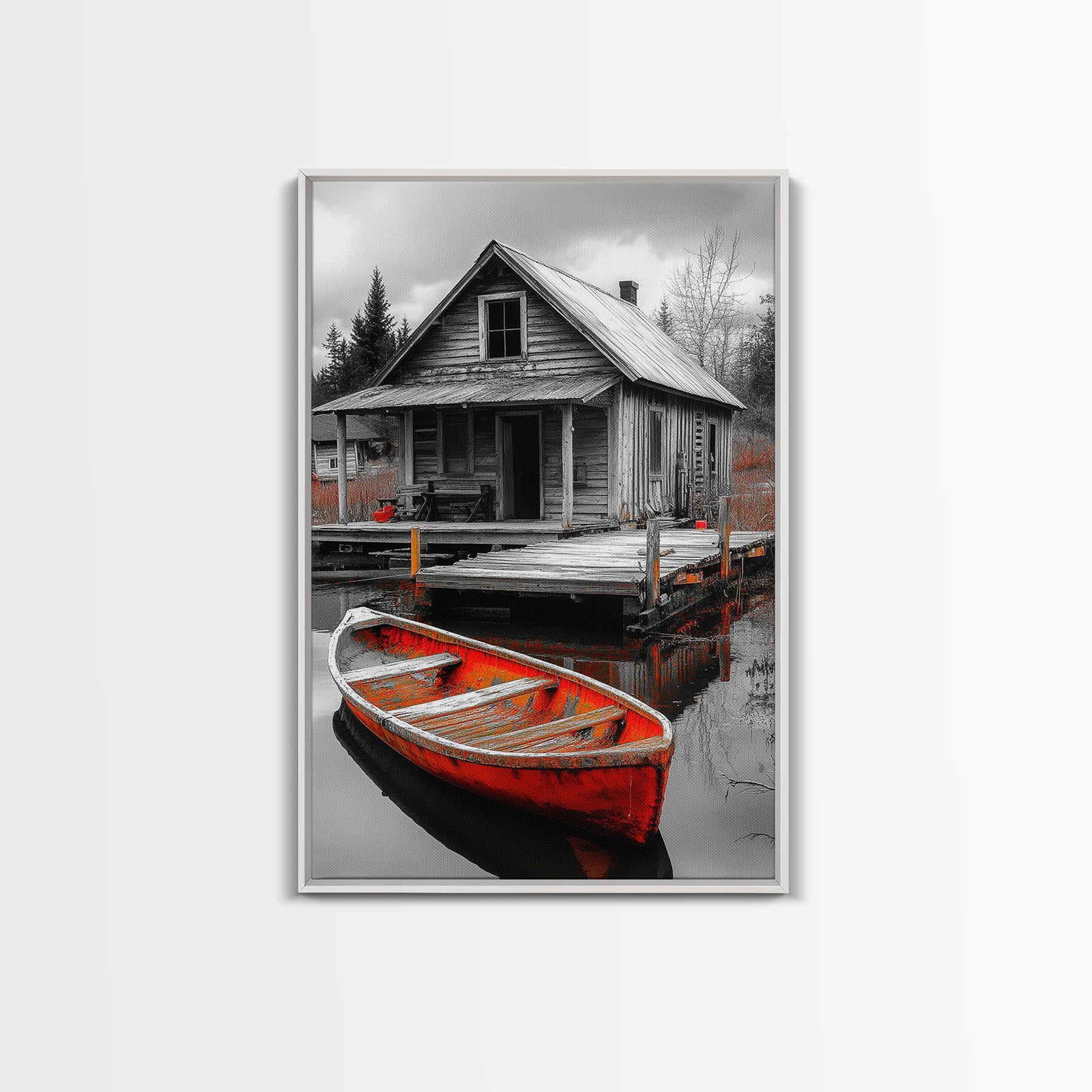 Cabin Reflection, Rustic Rowboat, Autumn Red, Lake Dock, Canvas Print, Fall Wall Art, Country Home Decor, Rustic Landscape, Lodge Style Art