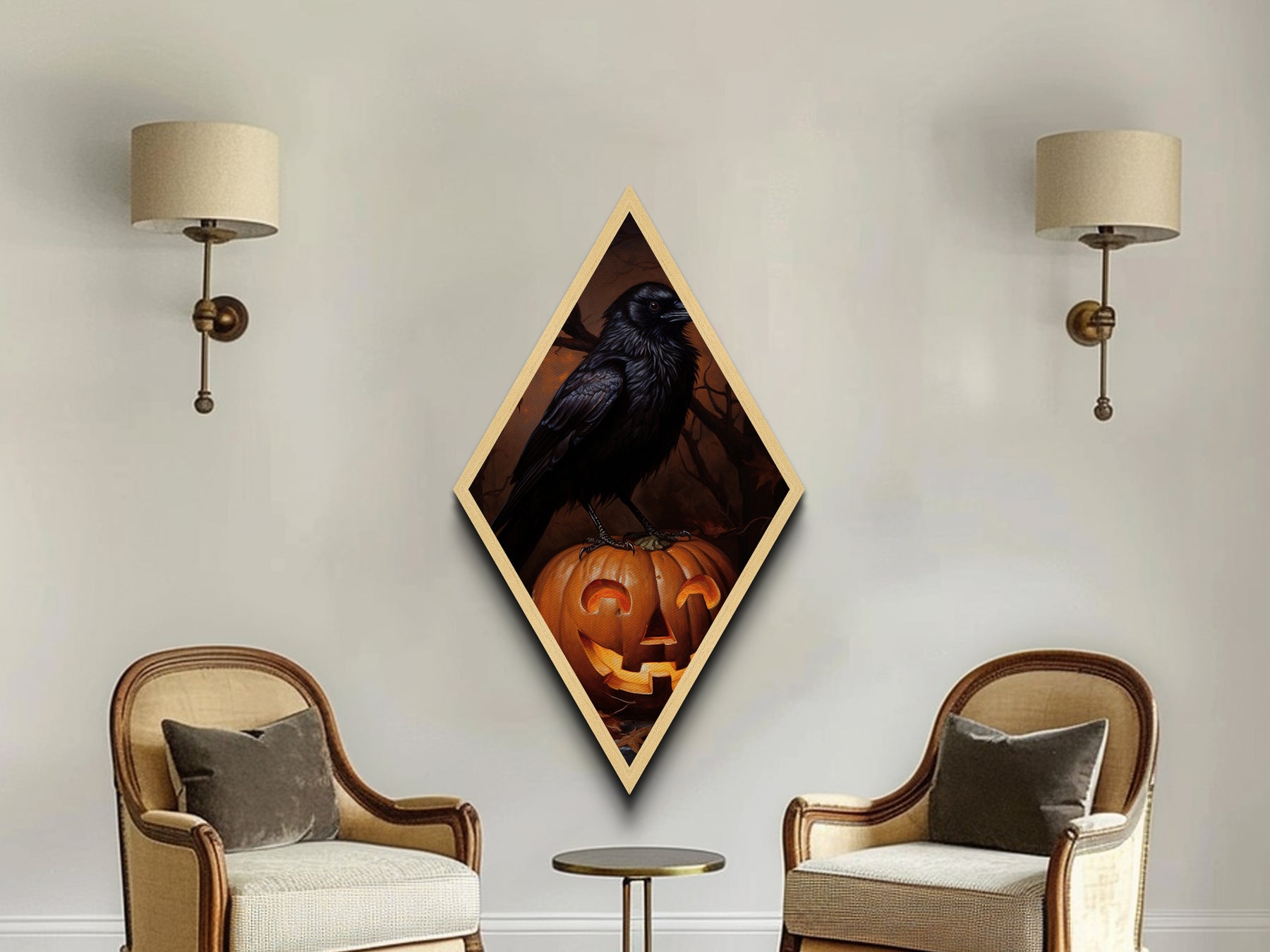 "Cackle Lantern" Gothic Crow and Glowing Jack-O'-Lantern Canvas Embossed Print, Diamond Shaped Art for Dark Halloween and Autumn Vibes