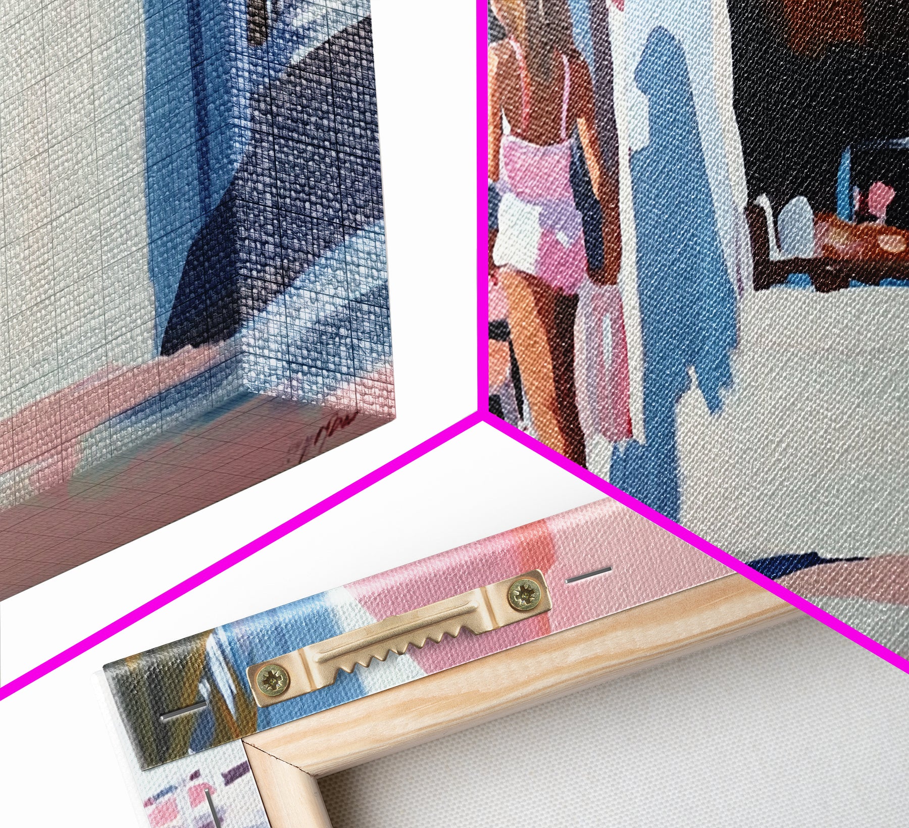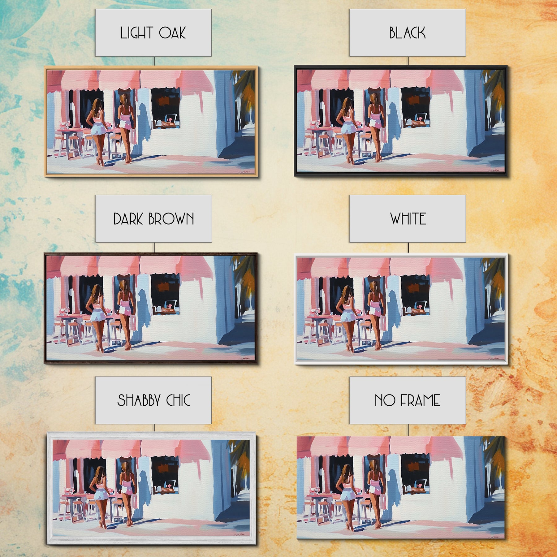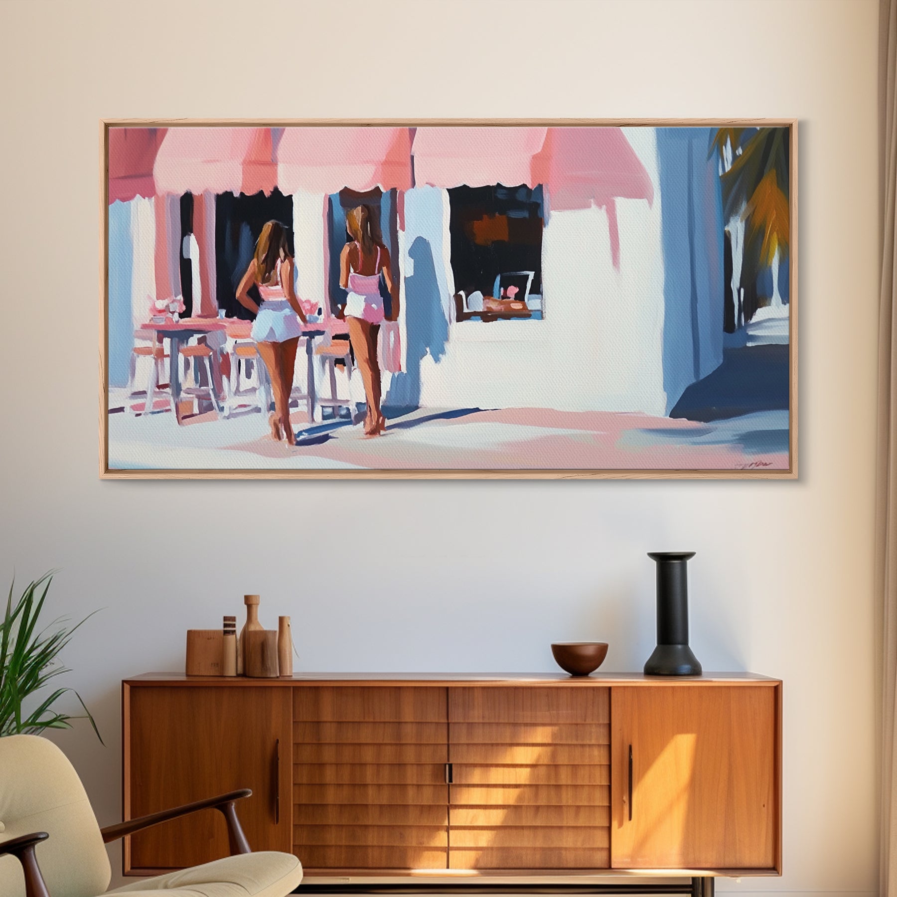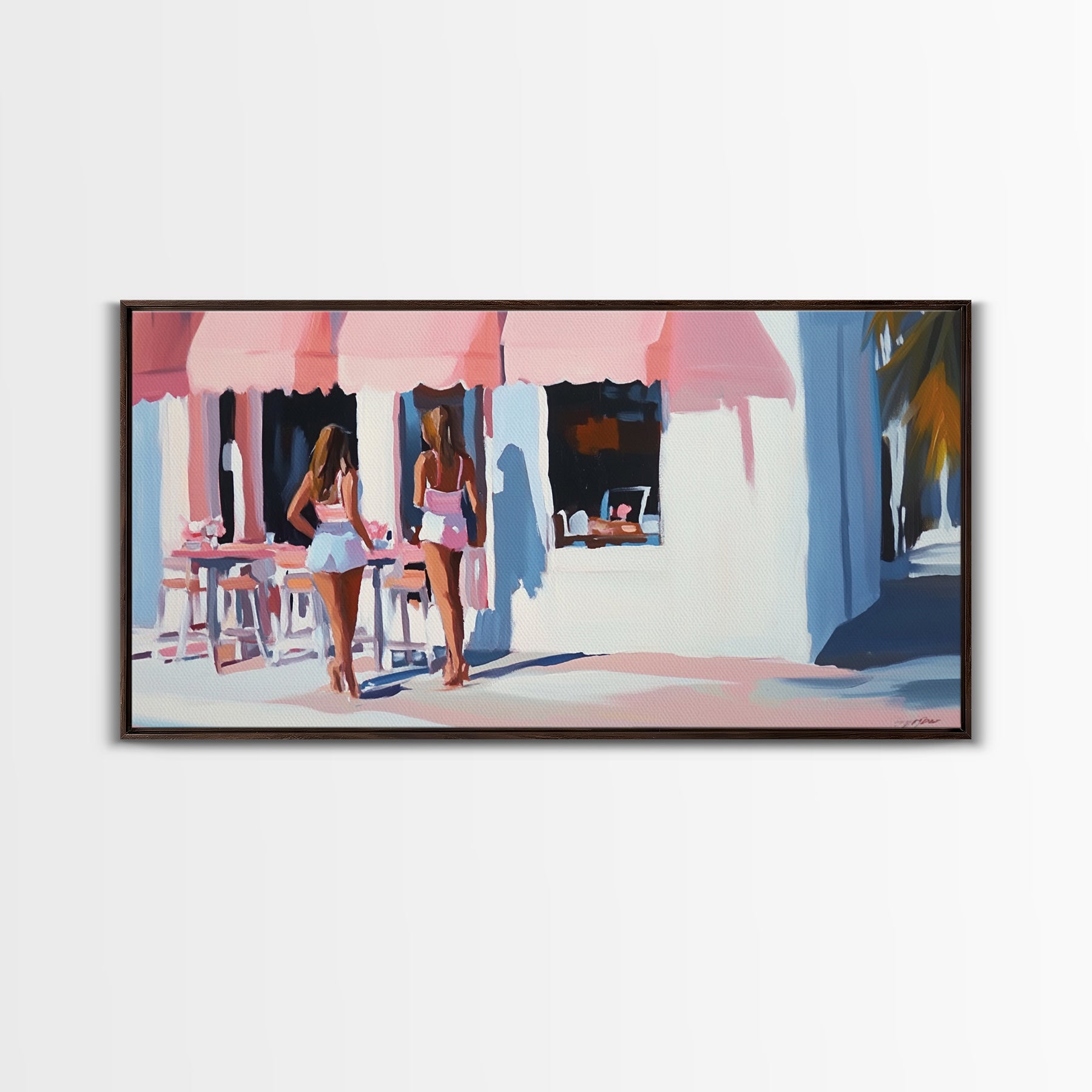 Café Scene, Pink Aesthetic, Coastal Lifestyle, Boho Summer Art, Chic Minimalist Decor, Home Wall Art, Living Room Art, Framed Canvas Print