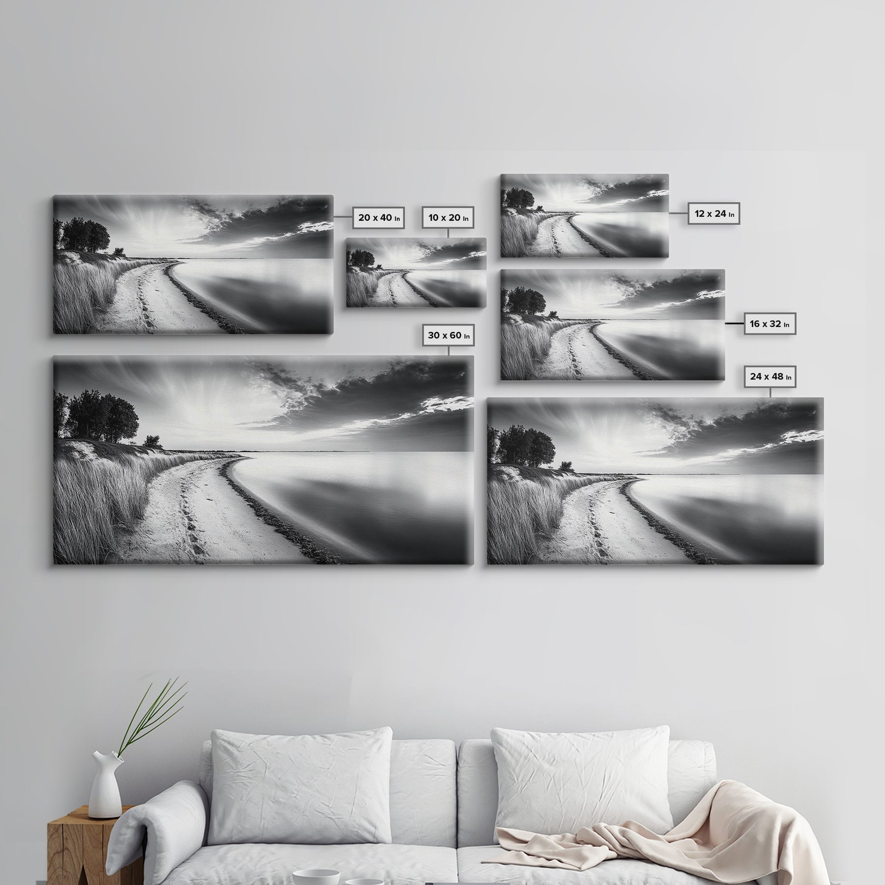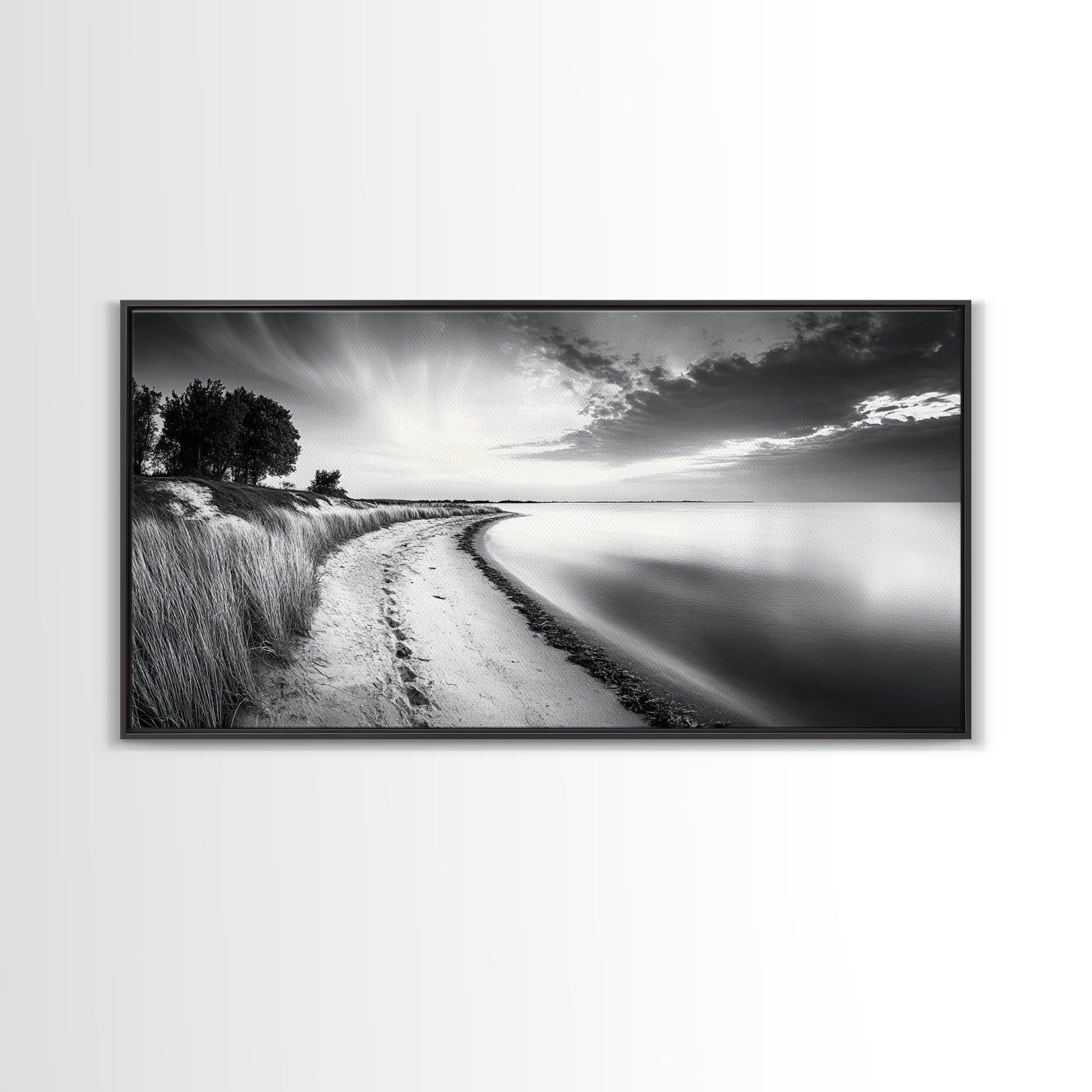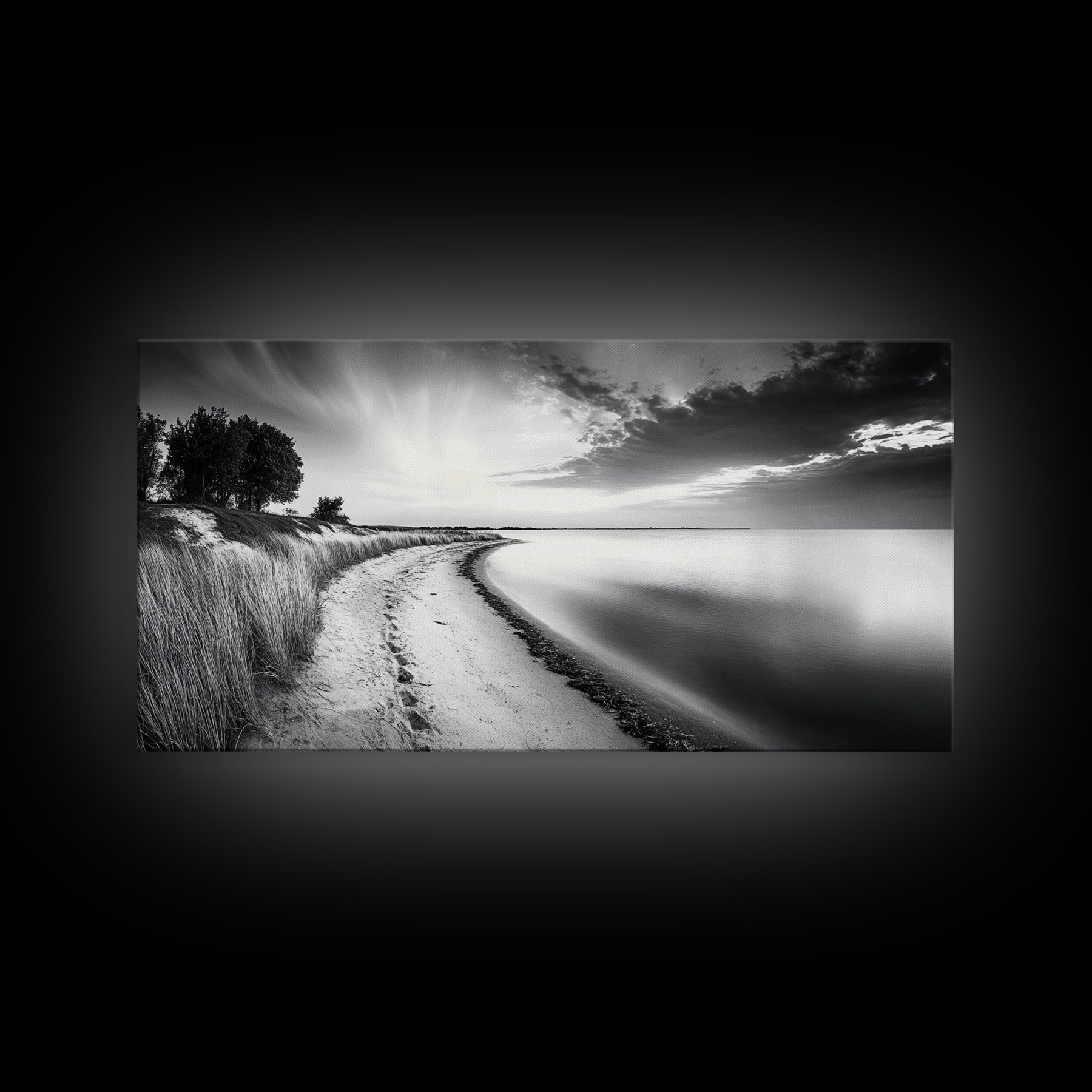 Calm Beach, Grassy Dunes, Serene Shoreline, Peaceful Water, Framed Canvas Print, Minimalist Art, Bedroom Wall Decor, Coastal Calm