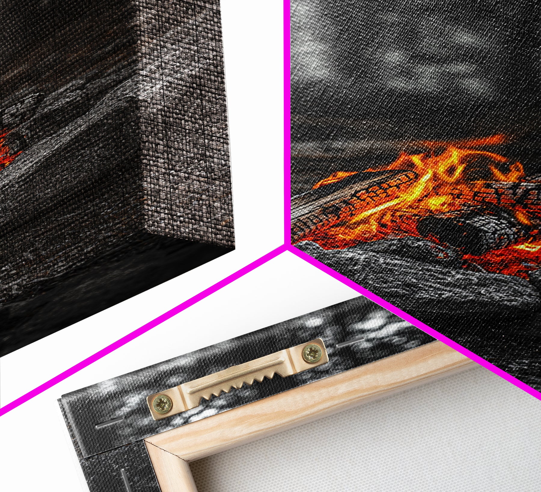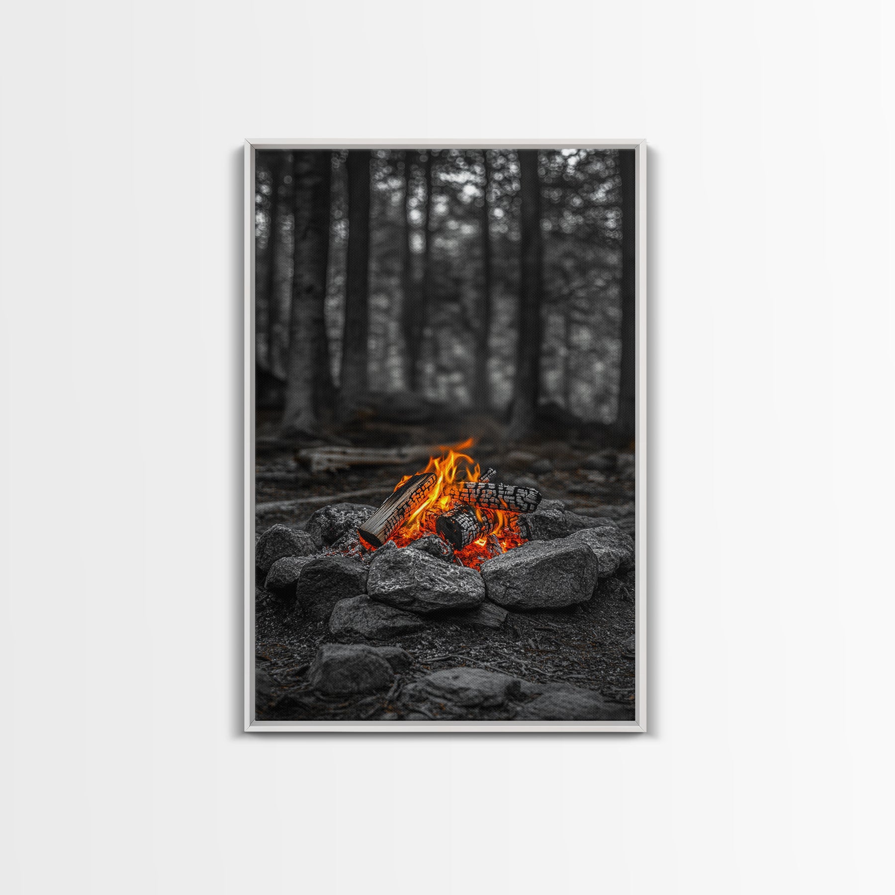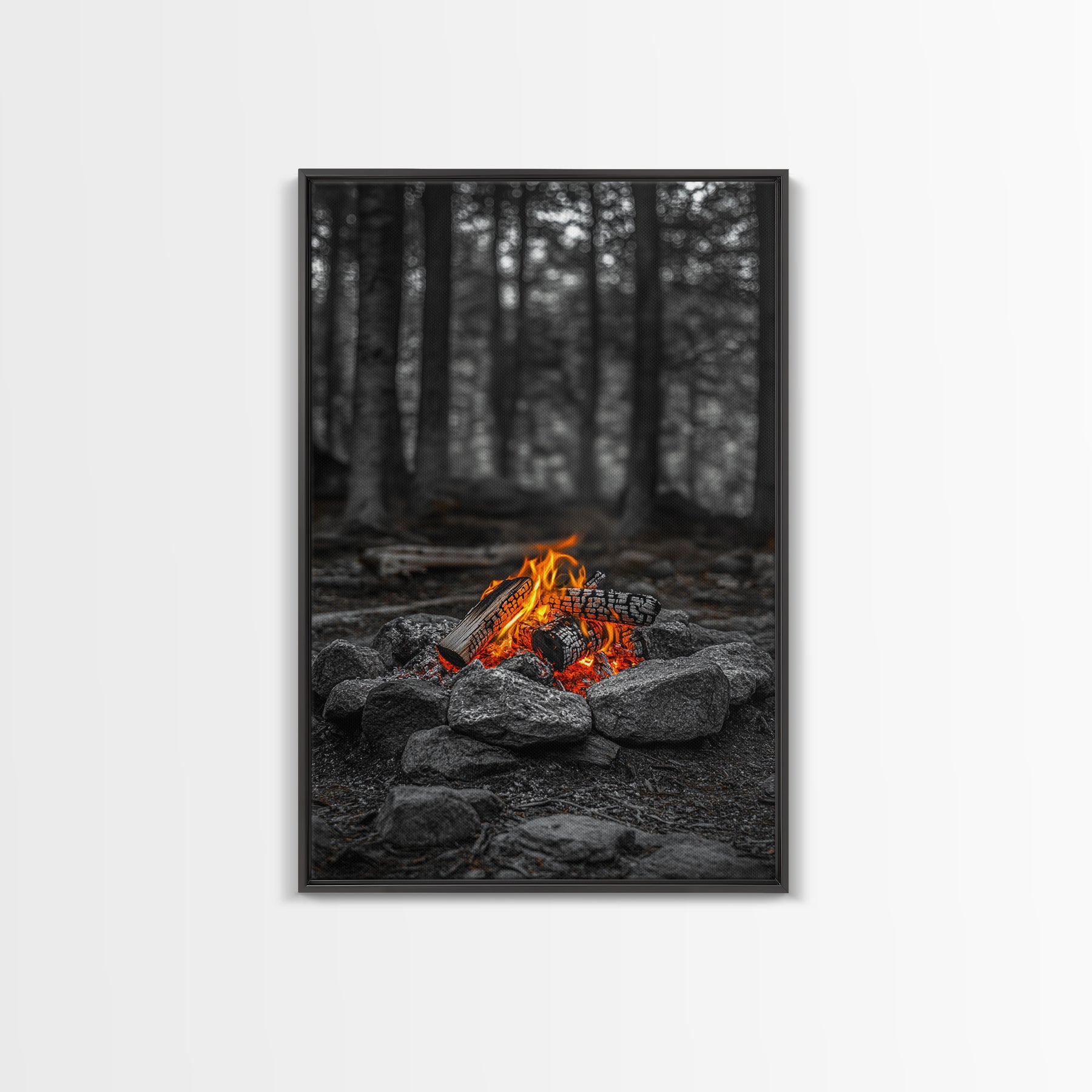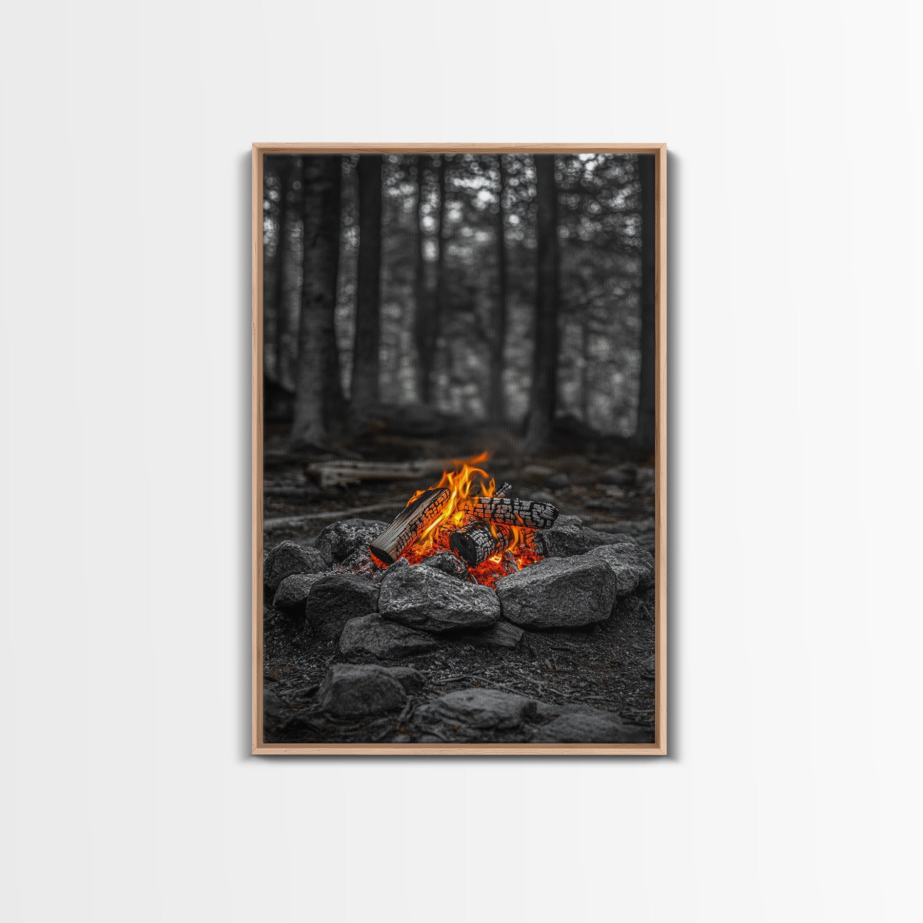 Campfire Glow, Cozy Flames, Autumn Wall Art, Framed Canvas Print, Nature Photography, Rustic Decor, Living Room Cabin Aesthetic