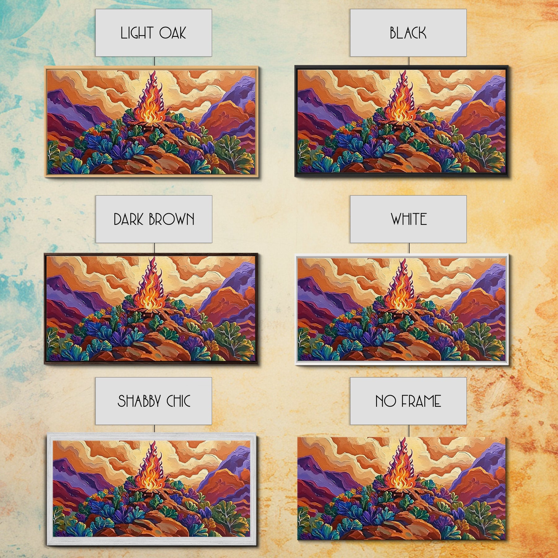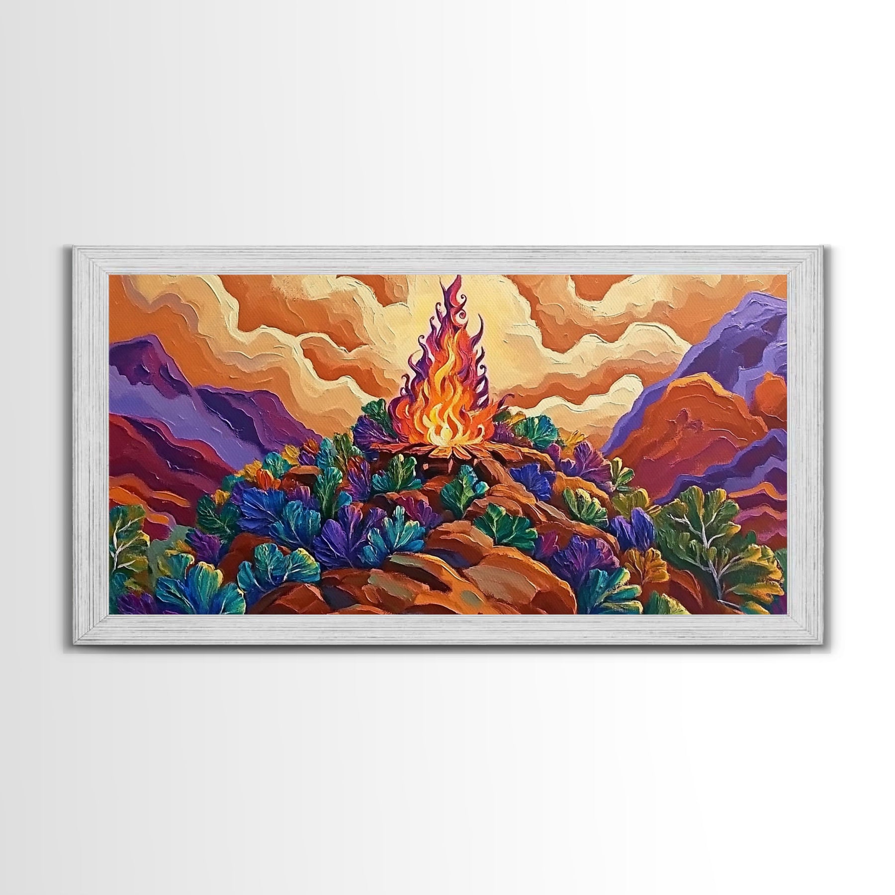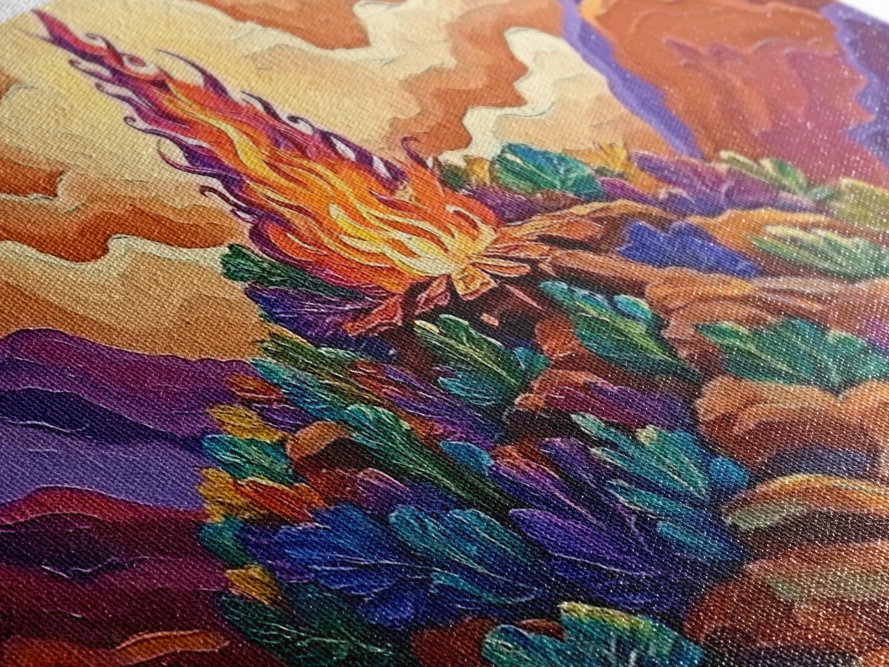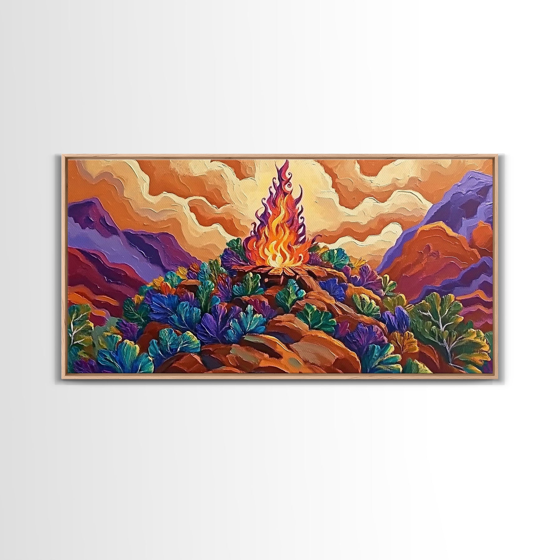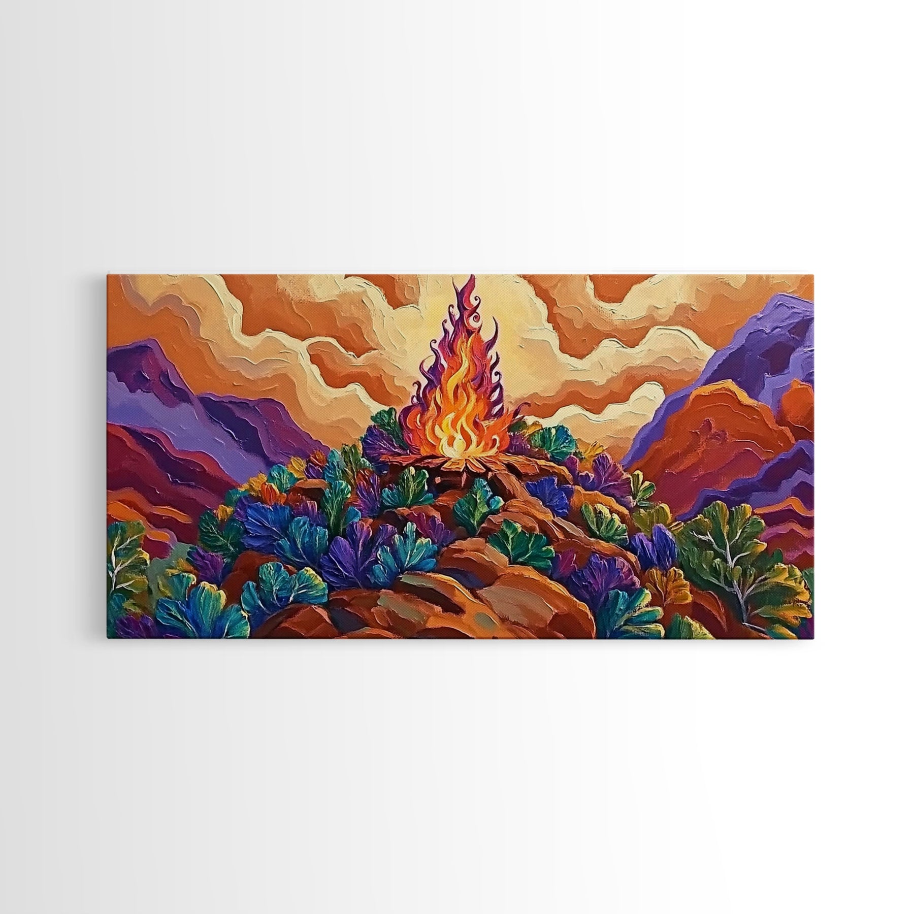 Campfire, Mountains, Glow, Vibrant campfire scene with colorful mountains and plants, Framed Canvas Print, rustic cabin wall art