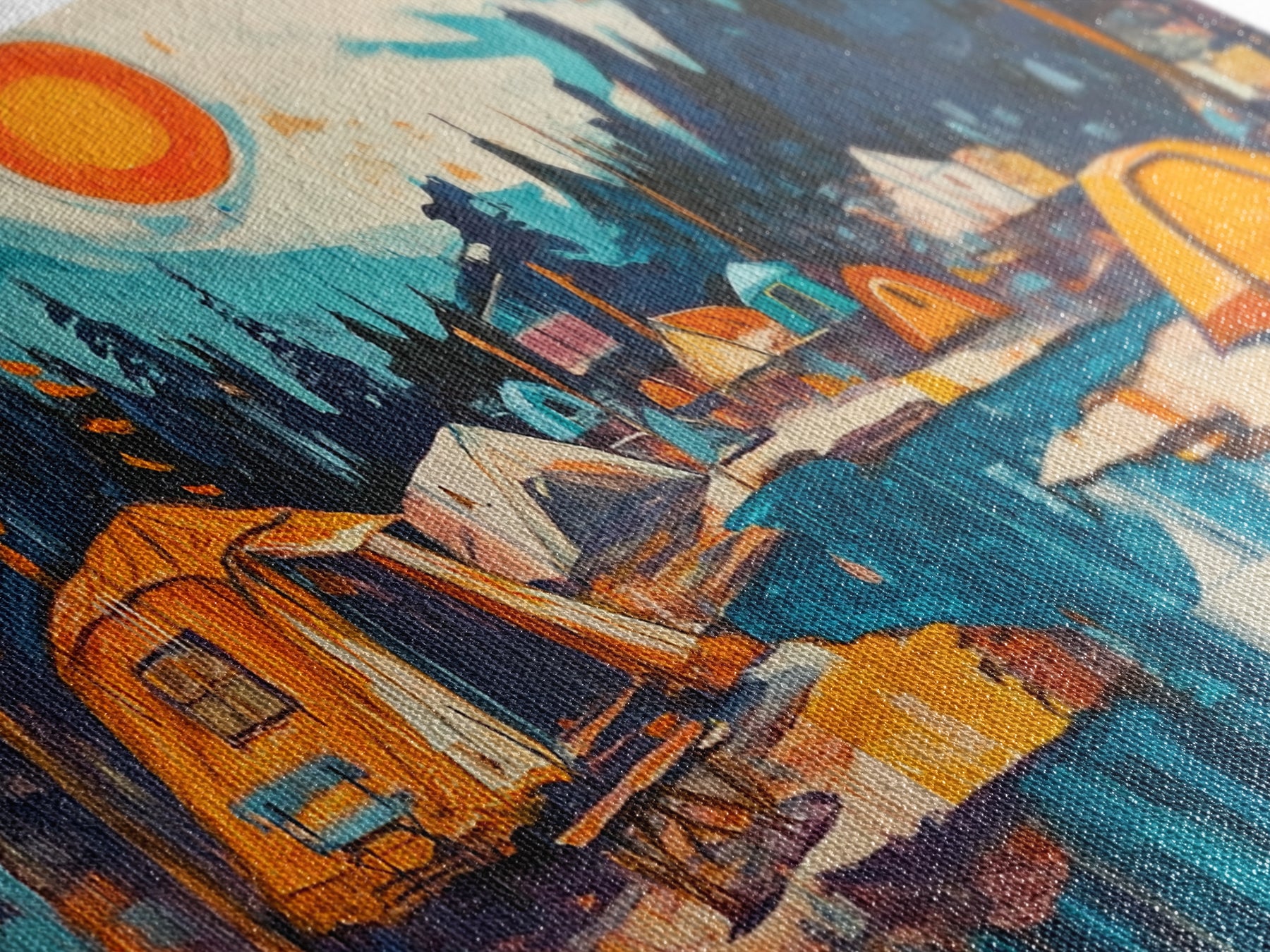Most of our canvases are made in the USA, with the exception of canvases ordered with the light oak unstained frames, and any large canvases (24x48, 30x60, 16x48 and 20x60) ordered WITH a frame. These are temporarily made in and shipped from Europe, while we try to find a more consistent supplier in the USA.