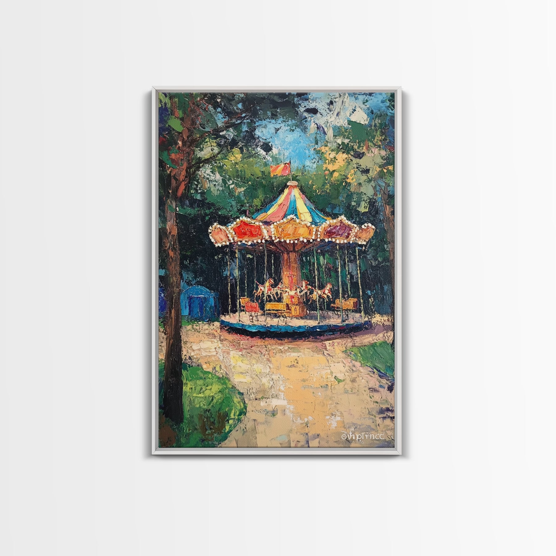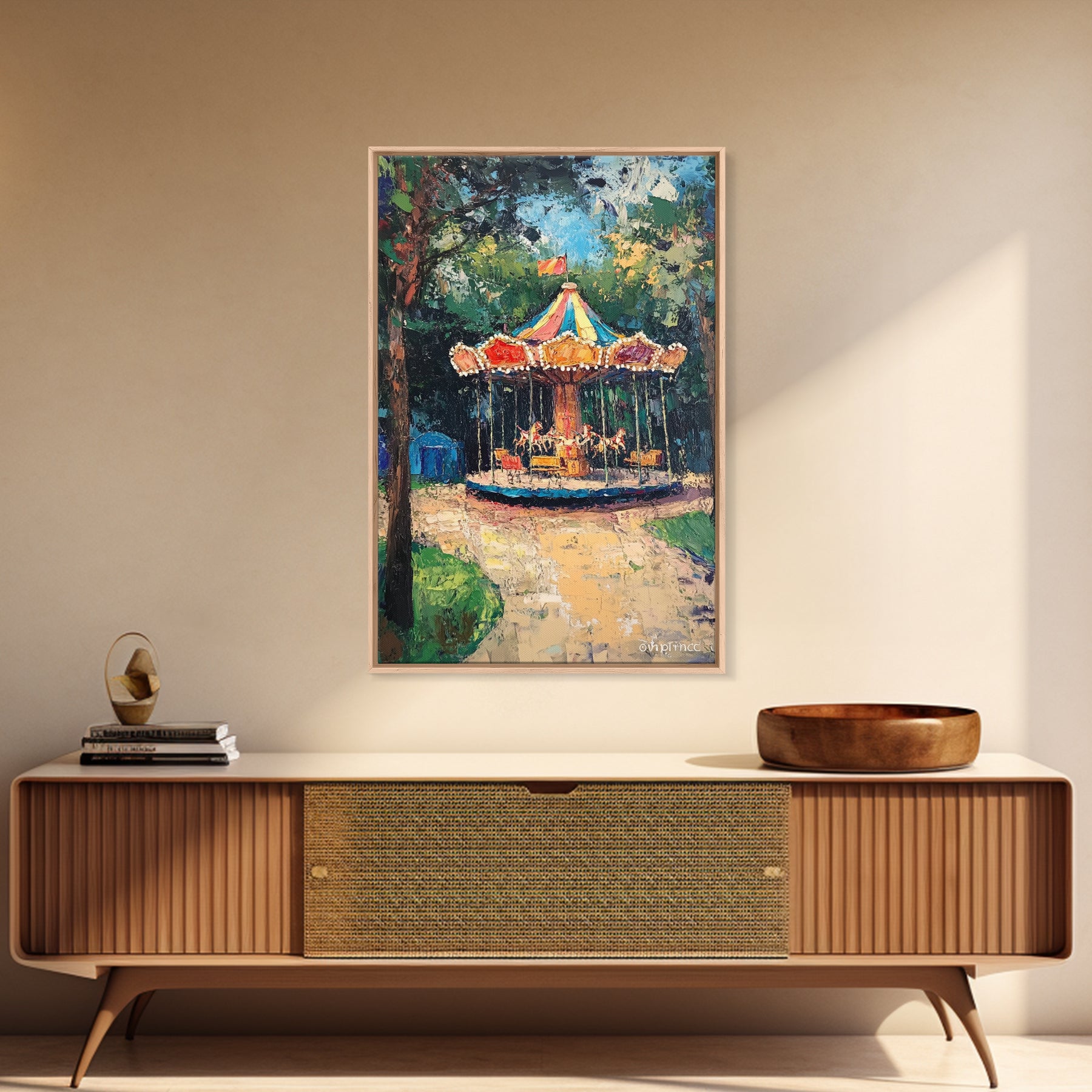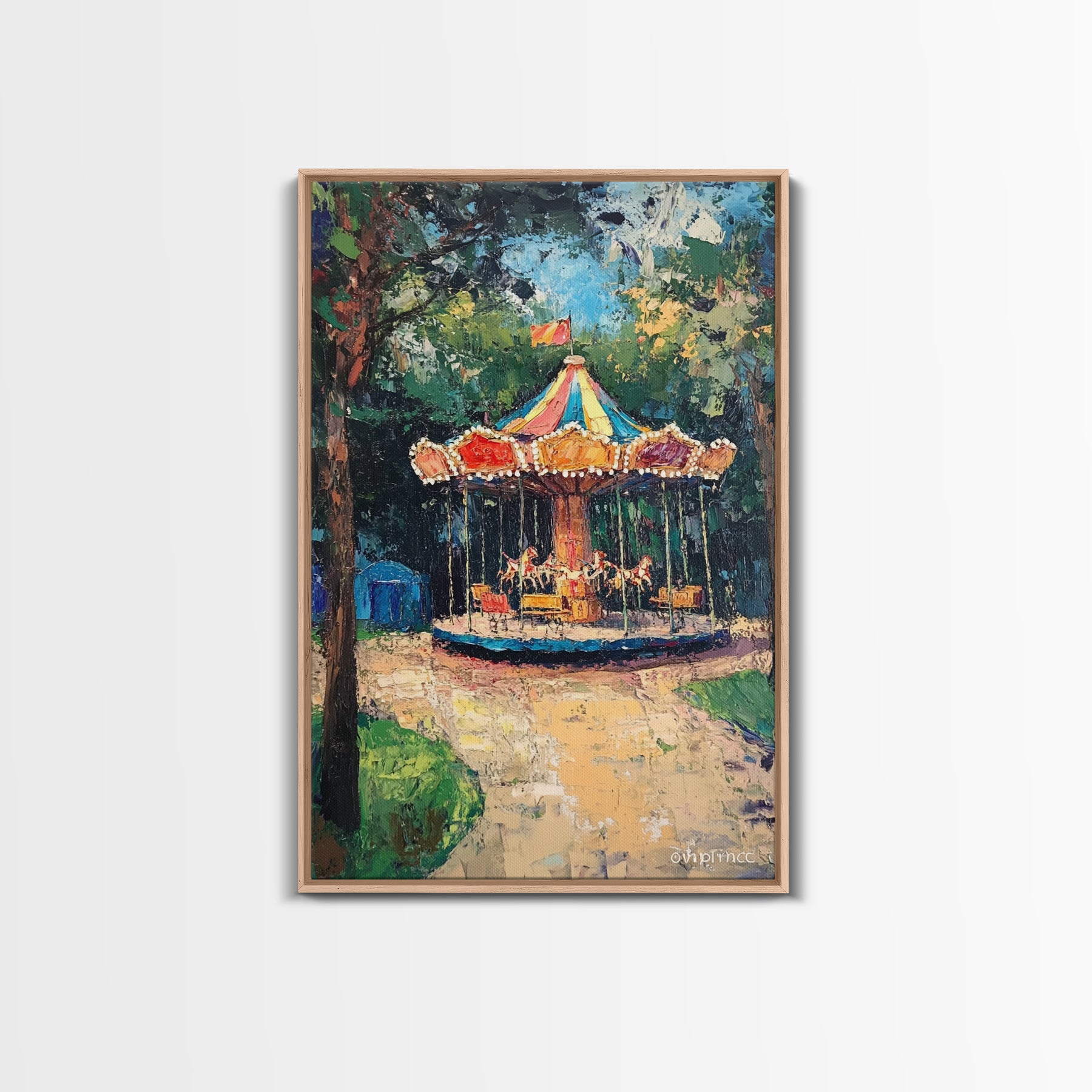 Carrousel Wall Art Framed Canvas Print, Oil Painting Carrousel, Circus Decor, Nursery Decor, Kid's Room Wall Art