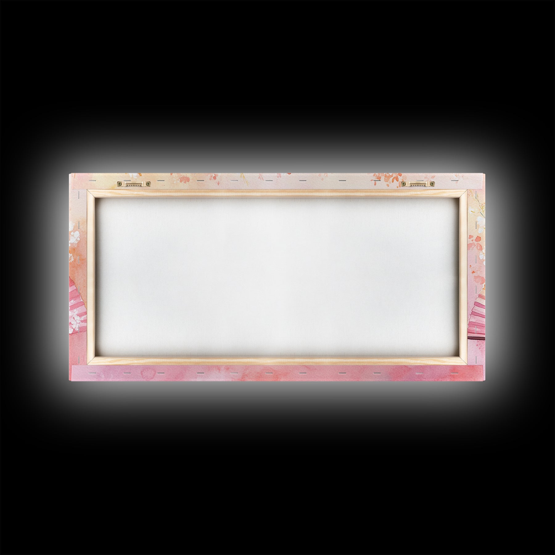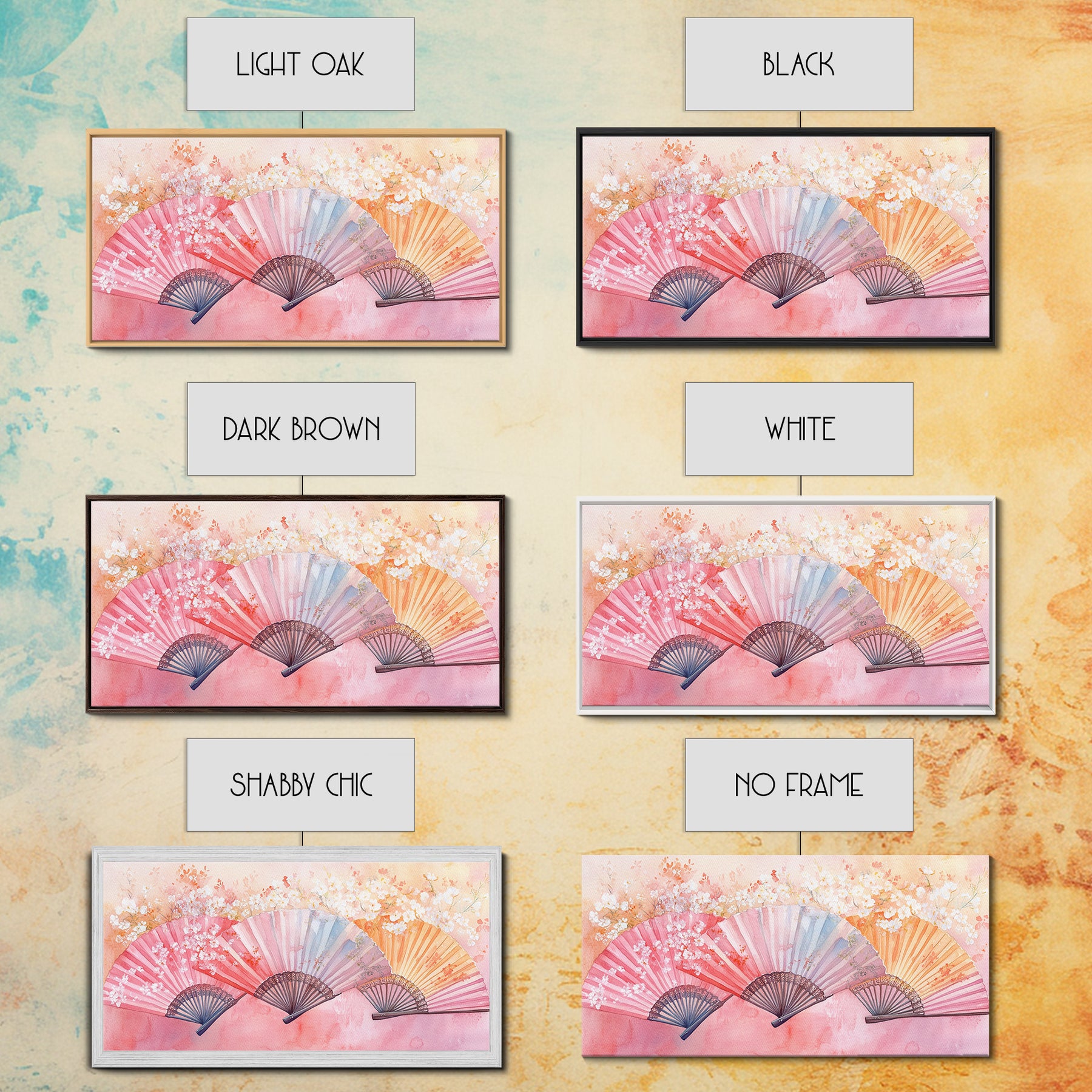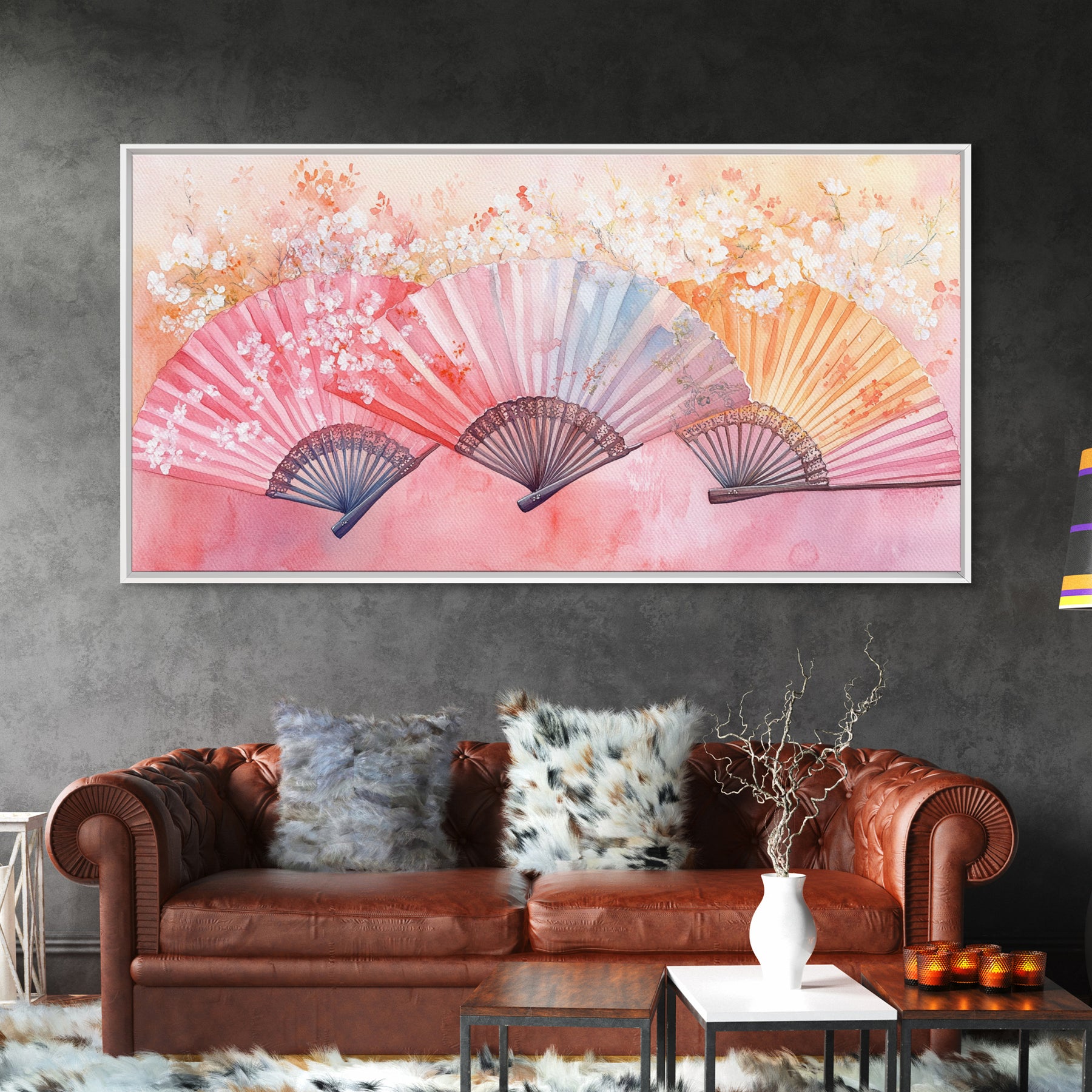 Cherry Blossom Fan Canvas Print Japanese Inspired Art Framed Pink Orange Wall Art Long Narrow Skinny Bedroom Rustic Spring Decor