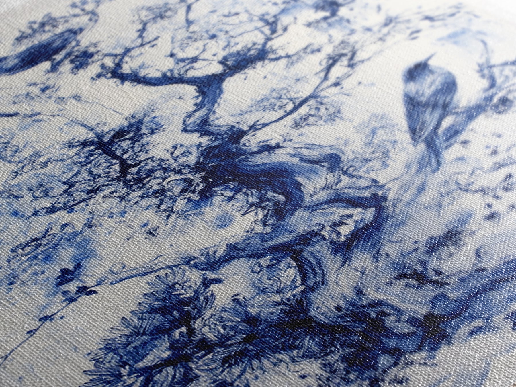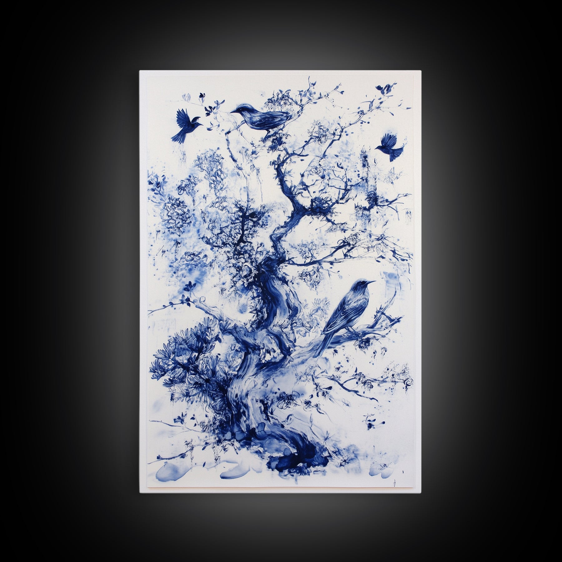 Chinoiserie Wall Art Framed Canvas Print, Blue Tree and Birds, Botanical Print, Birdwatcher Gift Idea, Chinoiserie Style Painting