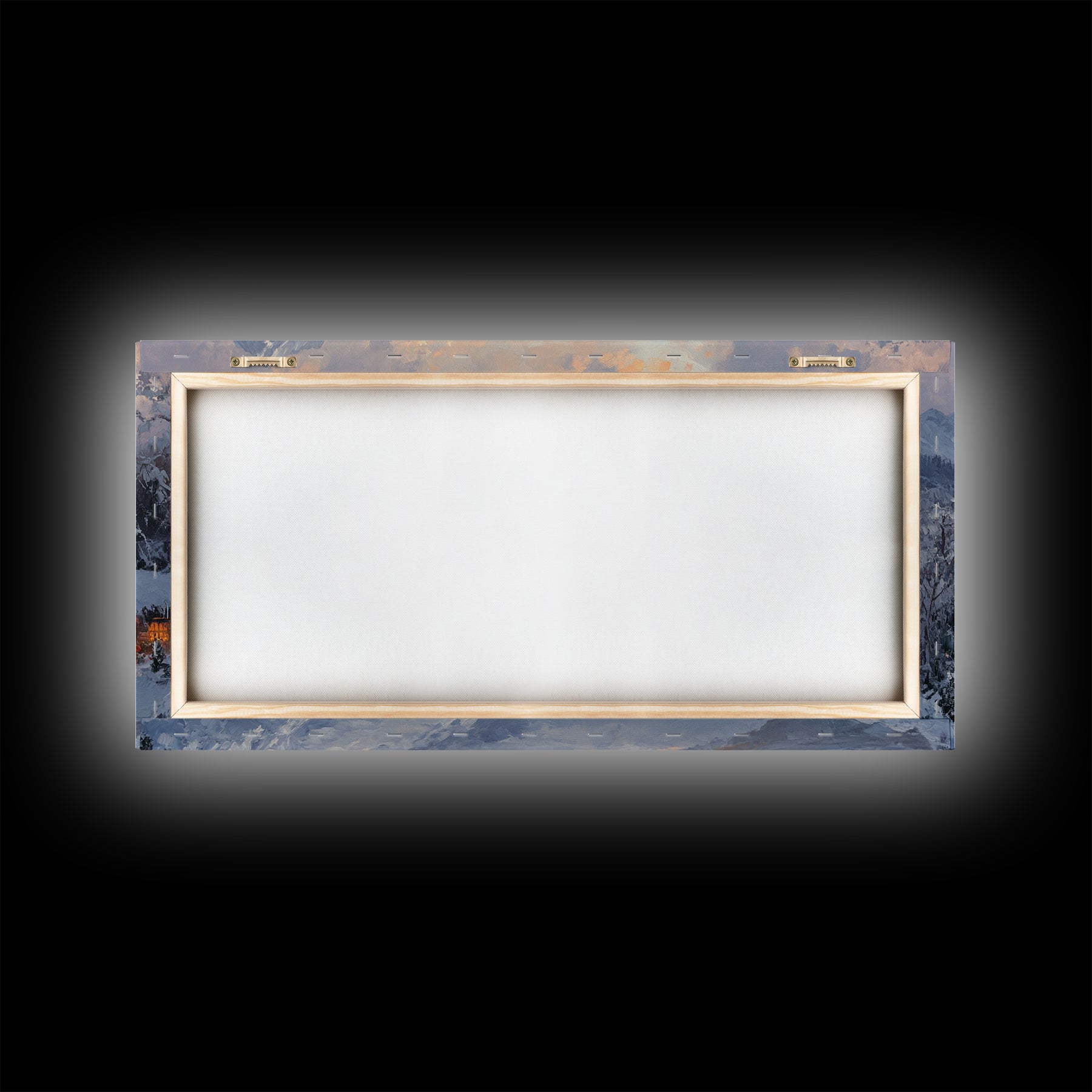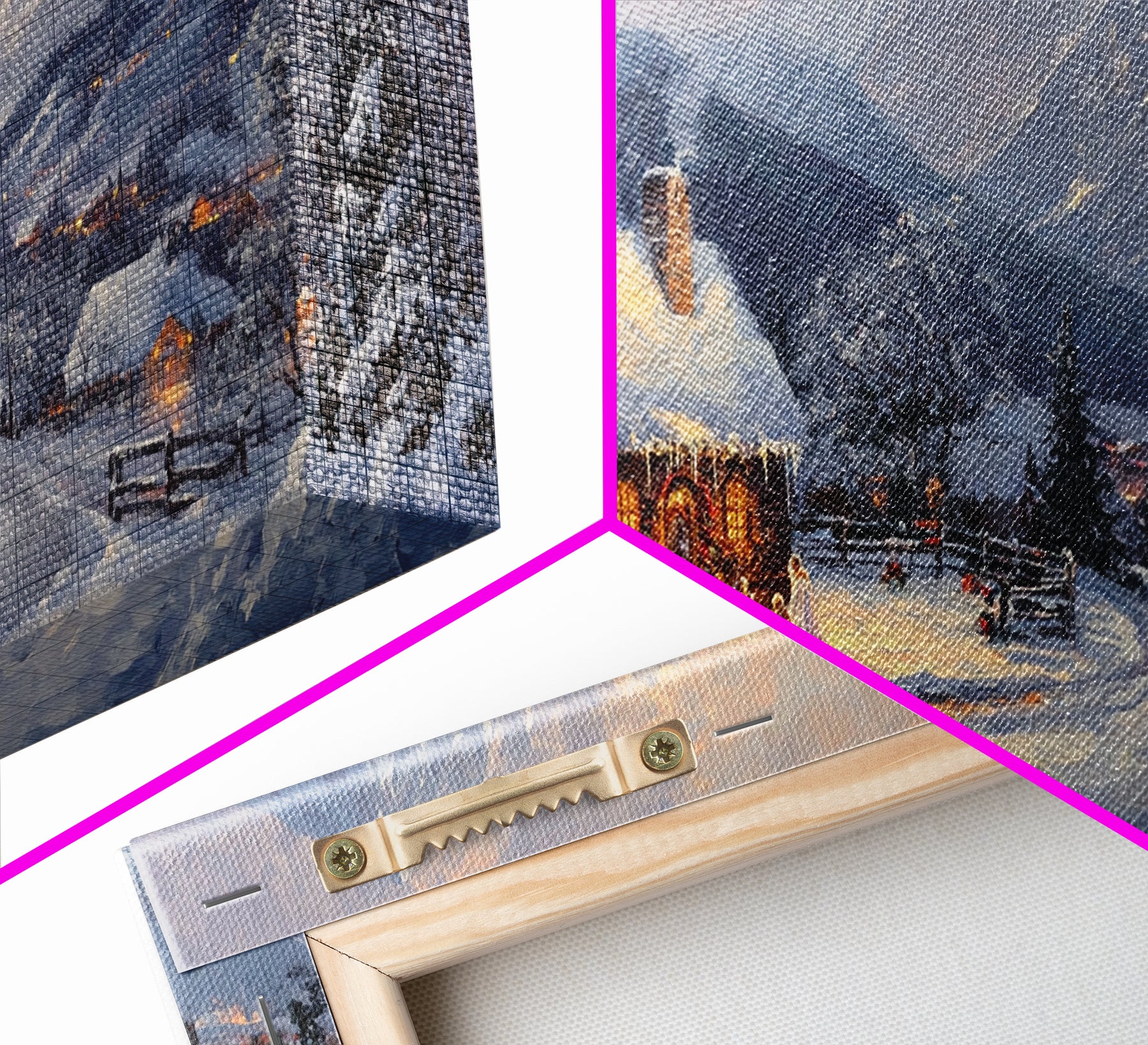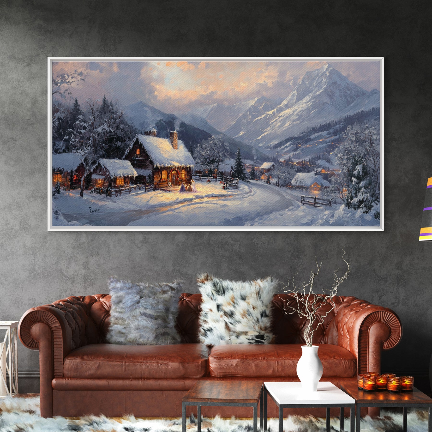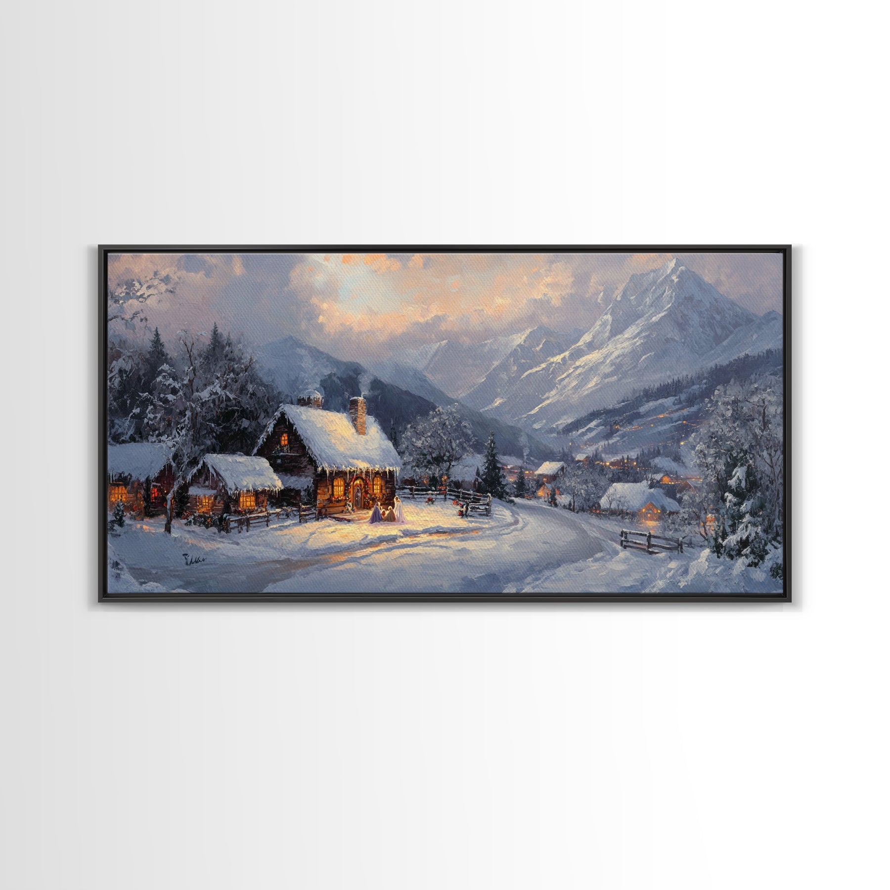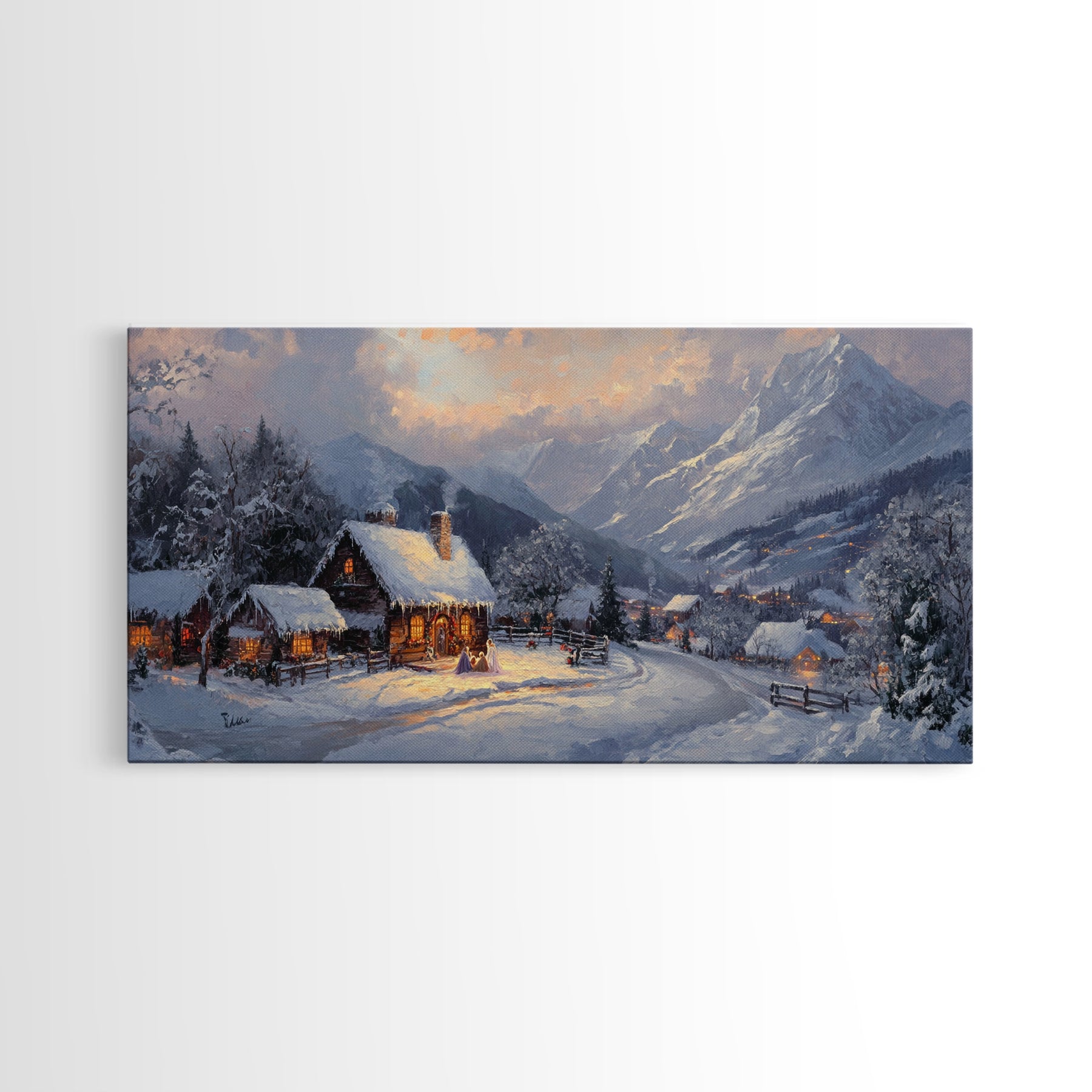 Christmas Mountain Village Oil Painting Print, Framed Canvas, Retro Christmas, Christmas Mountain Landscape Painting, Christmas Art