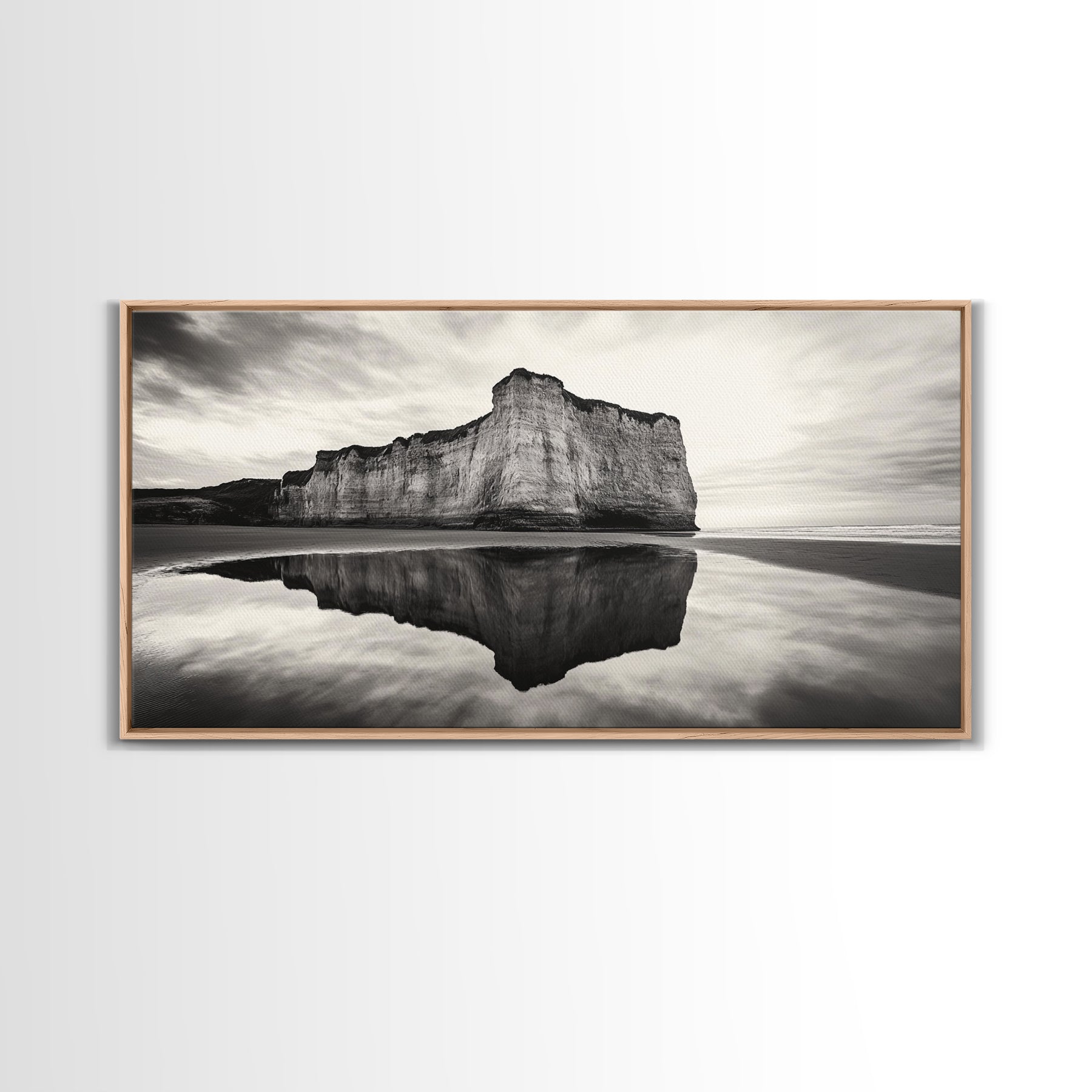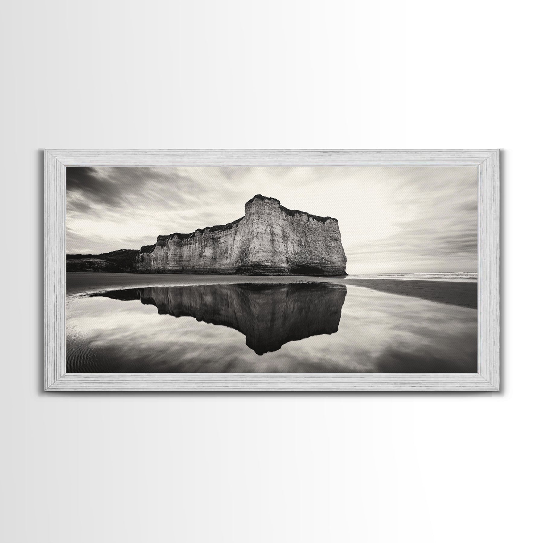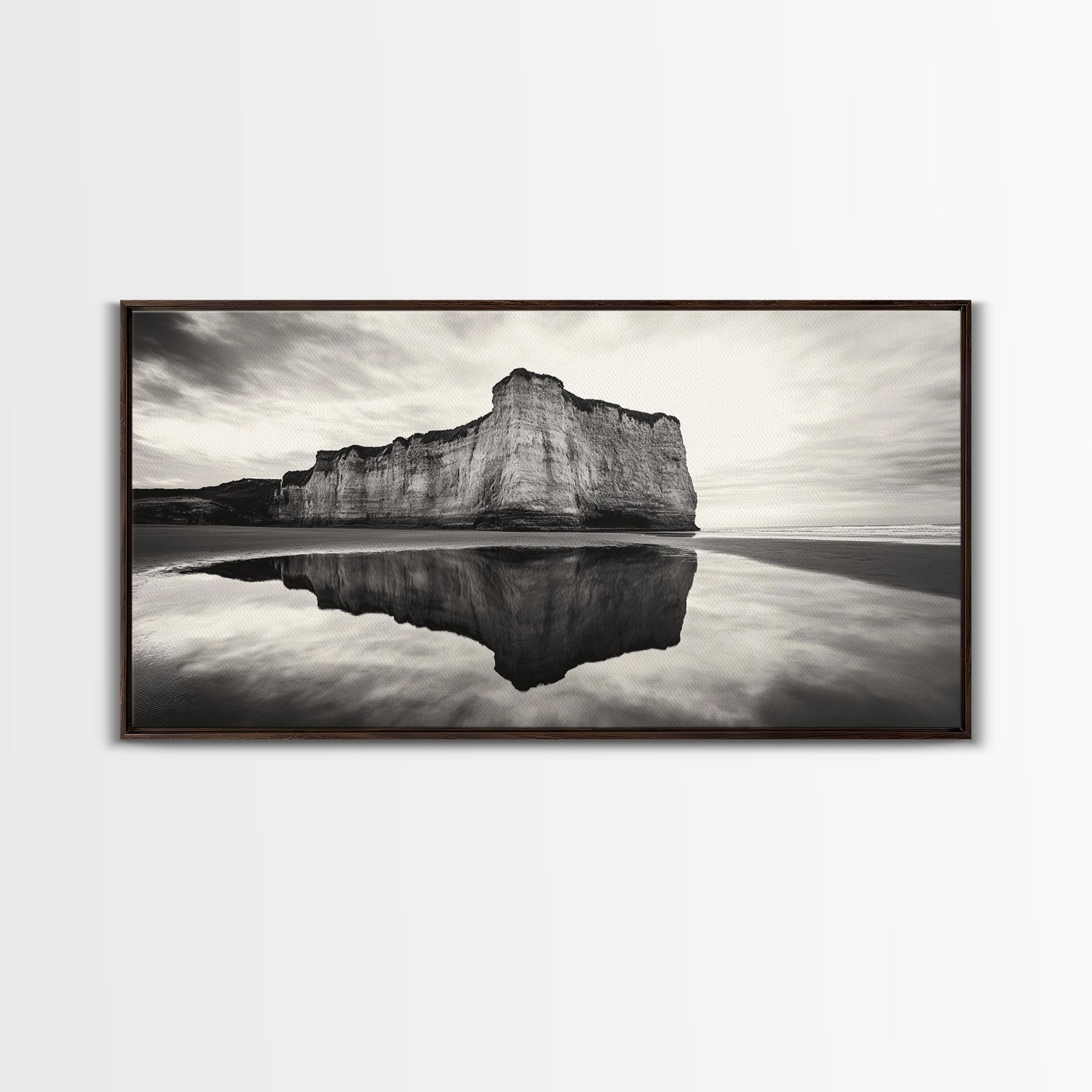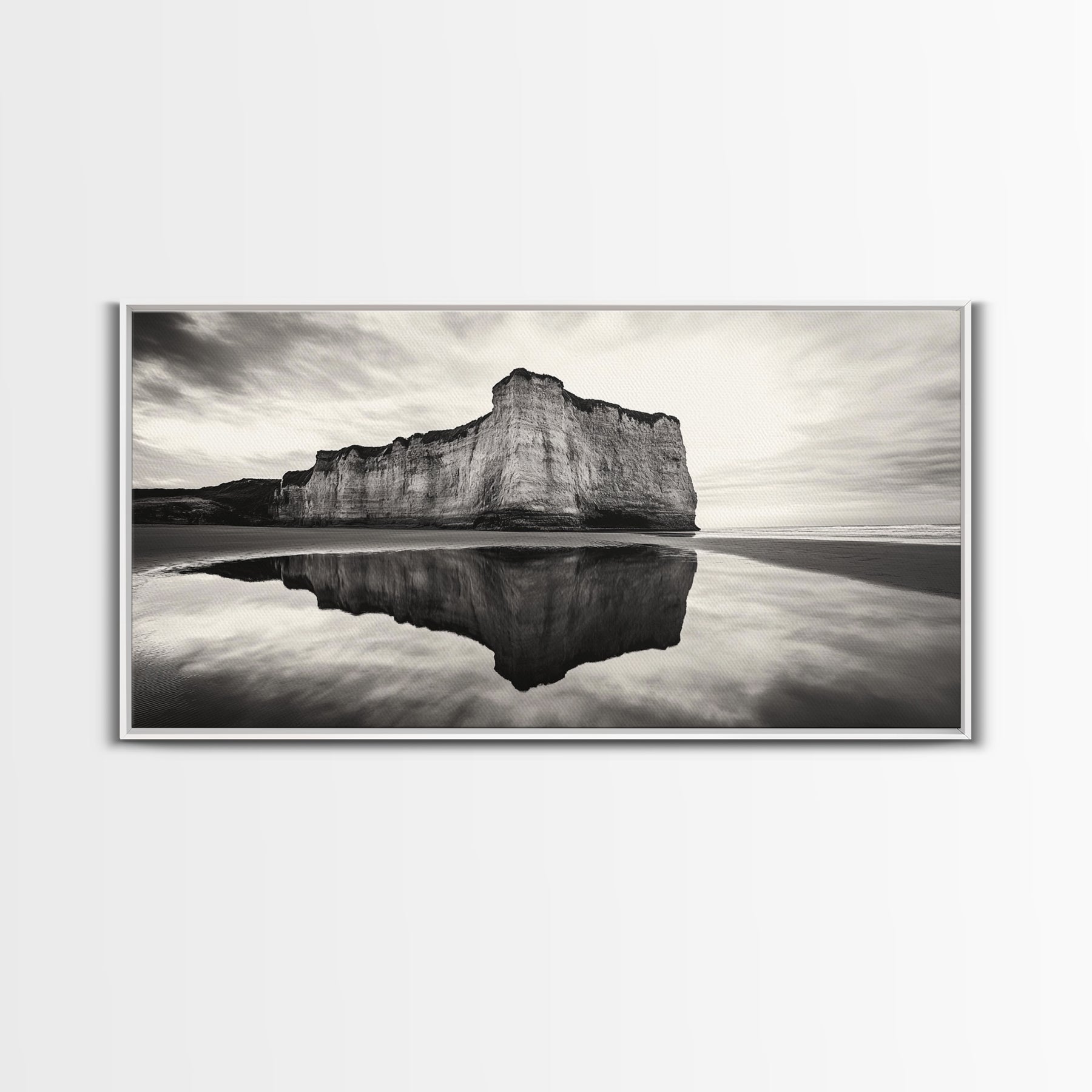 Cliff Reflection, Coastal Monolith, Seashore Beauty, Sunset Vibes, Framed Canvas Print, Living Room Art, Minimalist Beach Scene