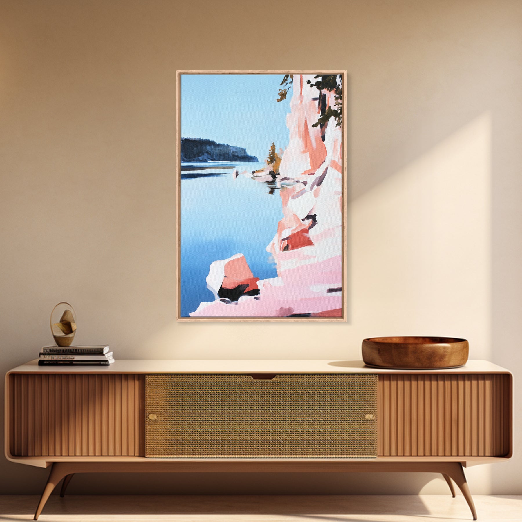 Cliffs, Water, Trees, Reflection, Framed Canvas Print, Nature Wall Art, Mountain Aesthetic, Lakehouse Decor, Minimalist Landscape