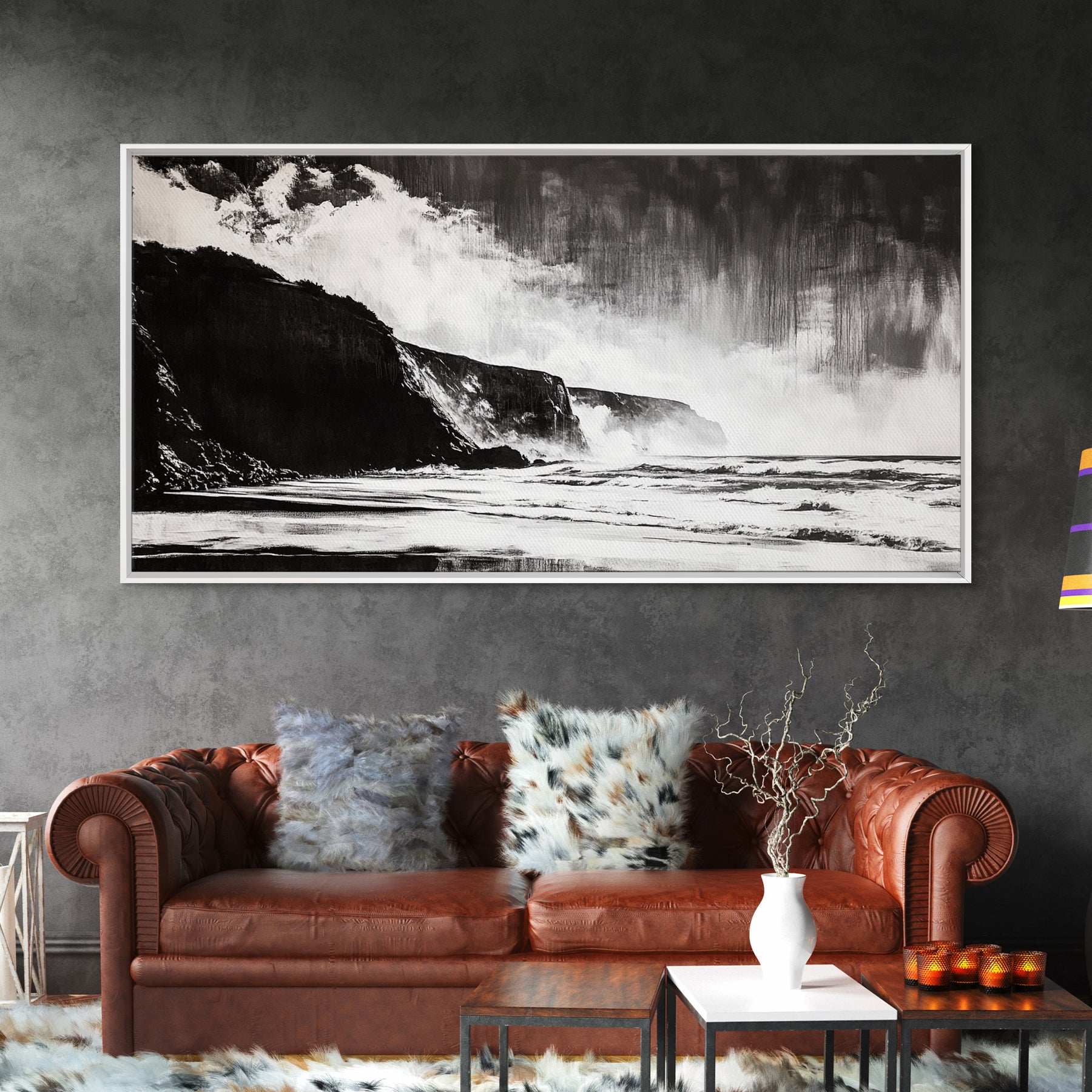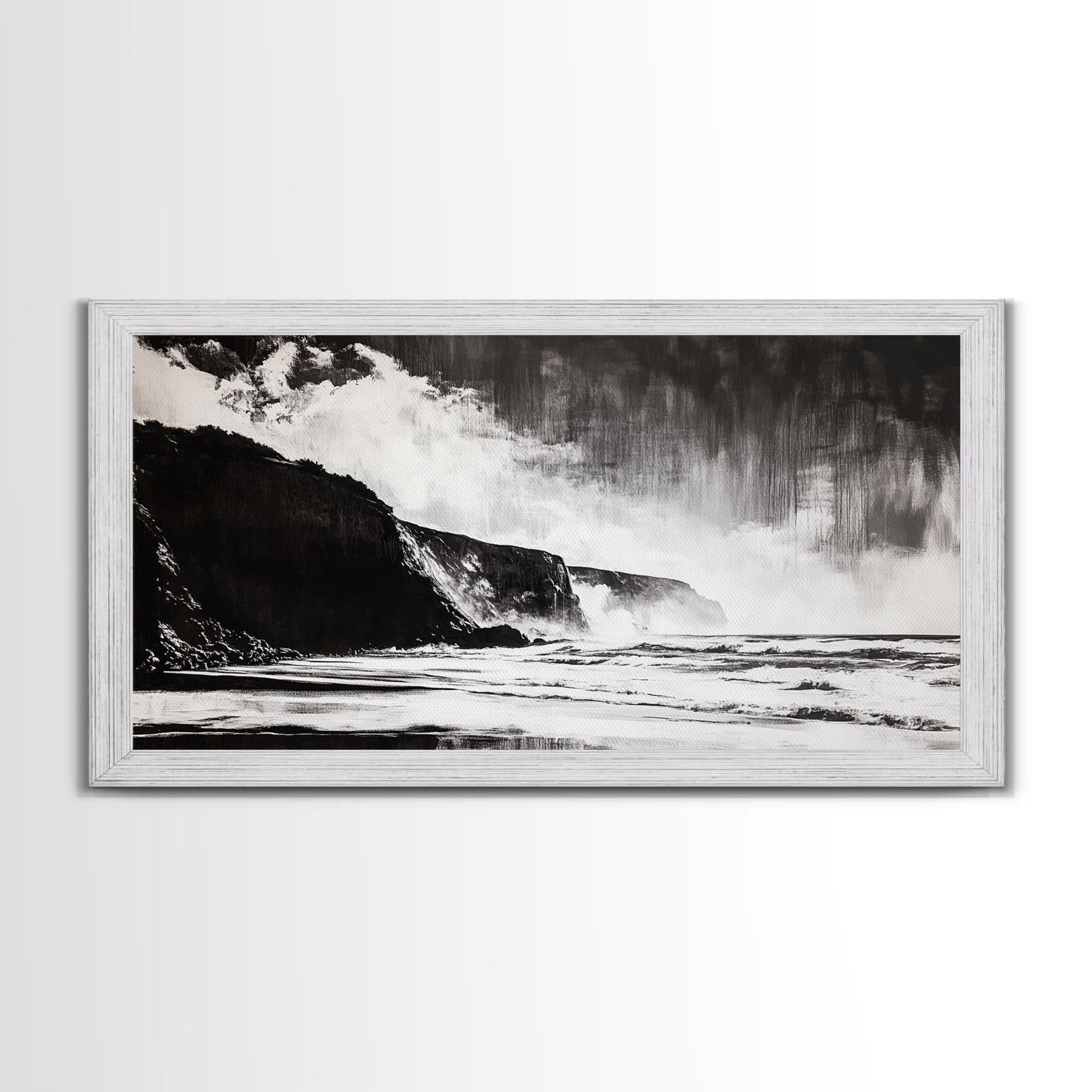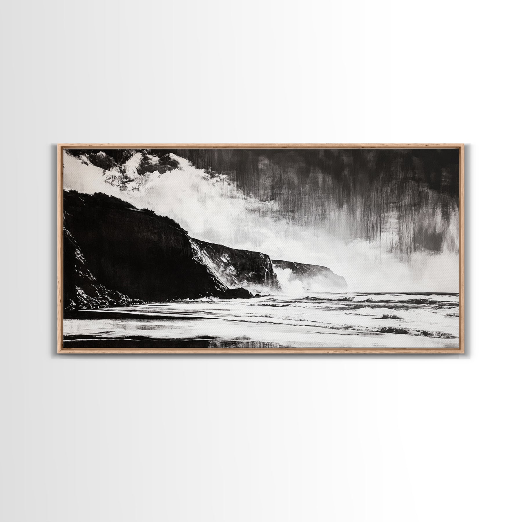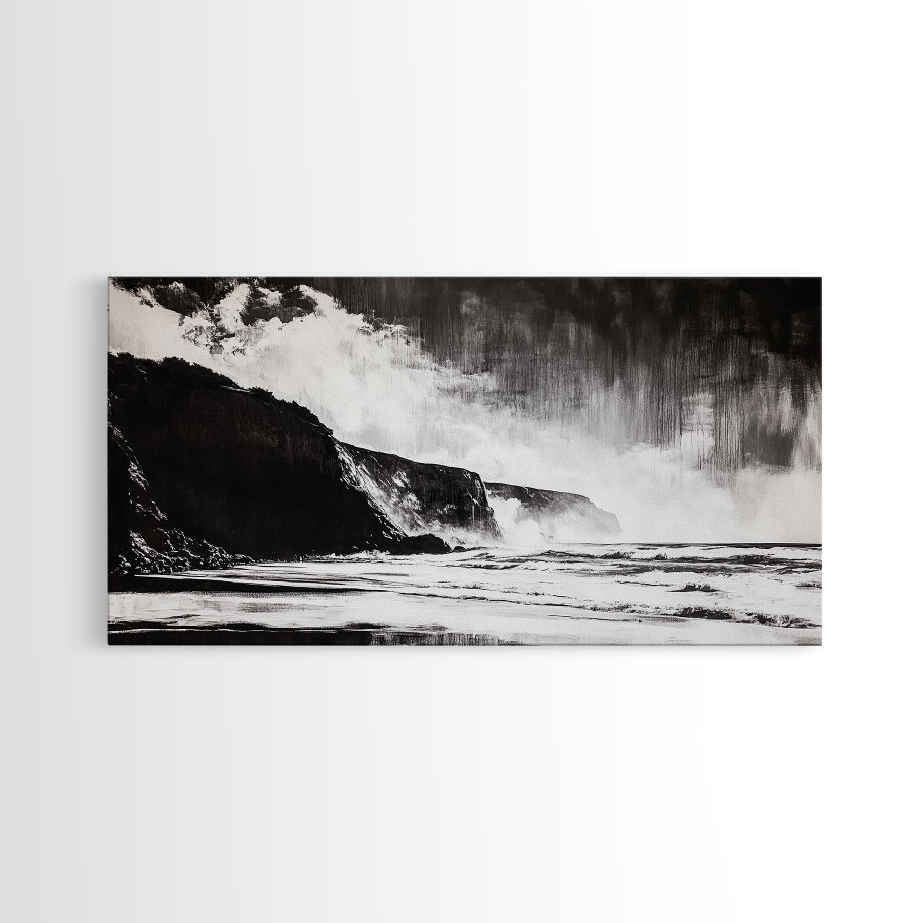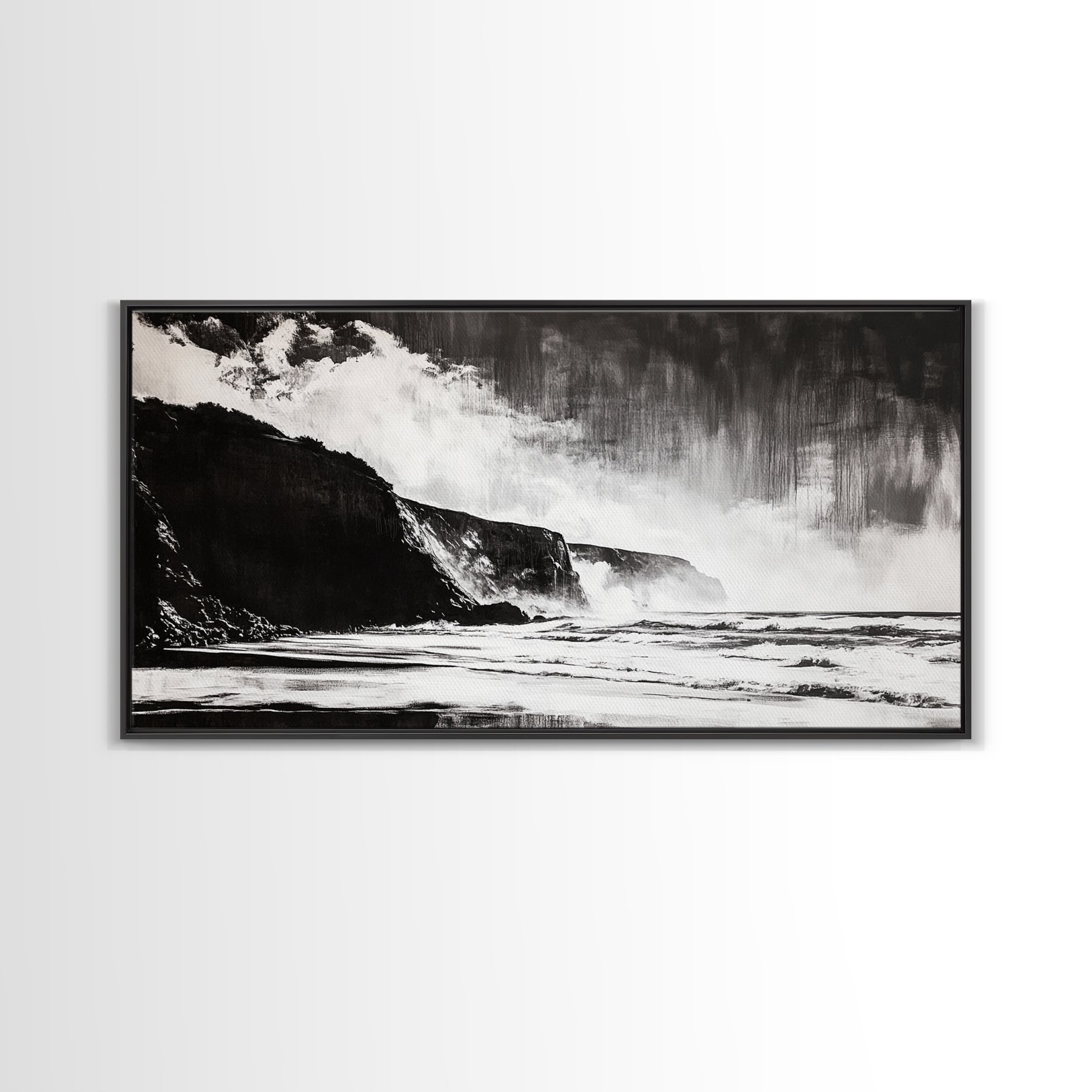 Cliffside Beach, Dramatic Seascape View, Framed Canvas Print, Black and White Art, Minimalist Decor, Bedroom Wall Art, Coastal Aesthetic