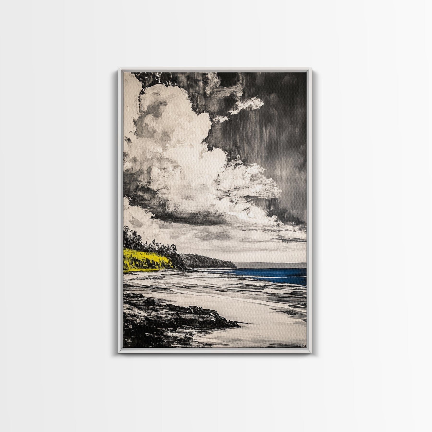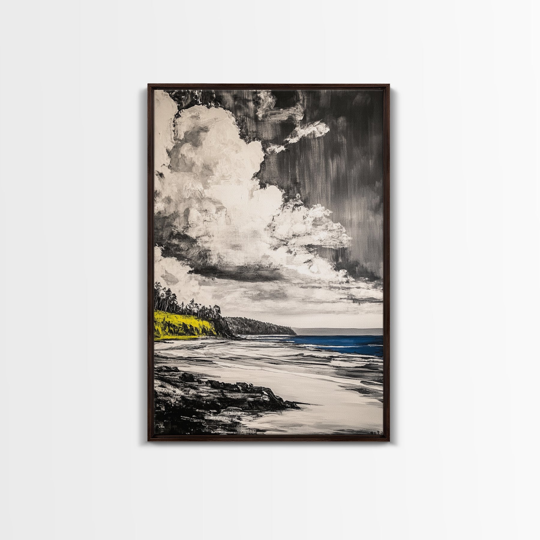 Cliffside View, Ocean Horizon, Cloudy Sky, Framed Canvas Print, Beach House Decor, Monochrome Wall Art, Relaxing Scenery