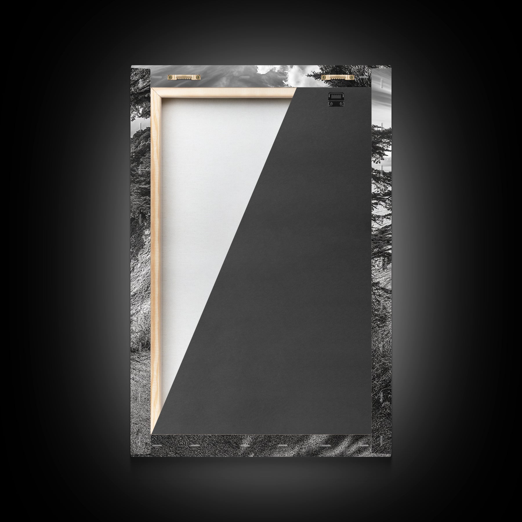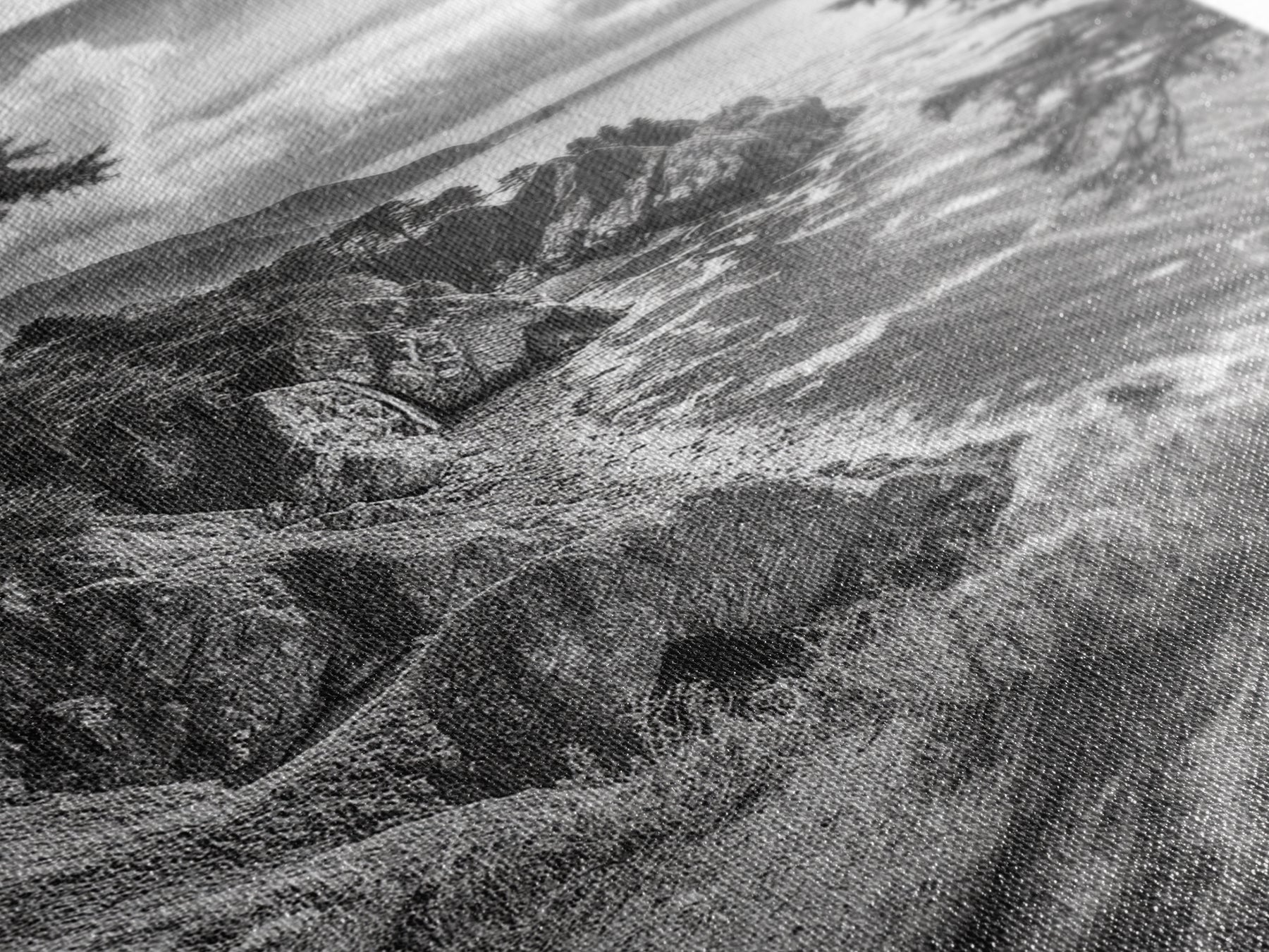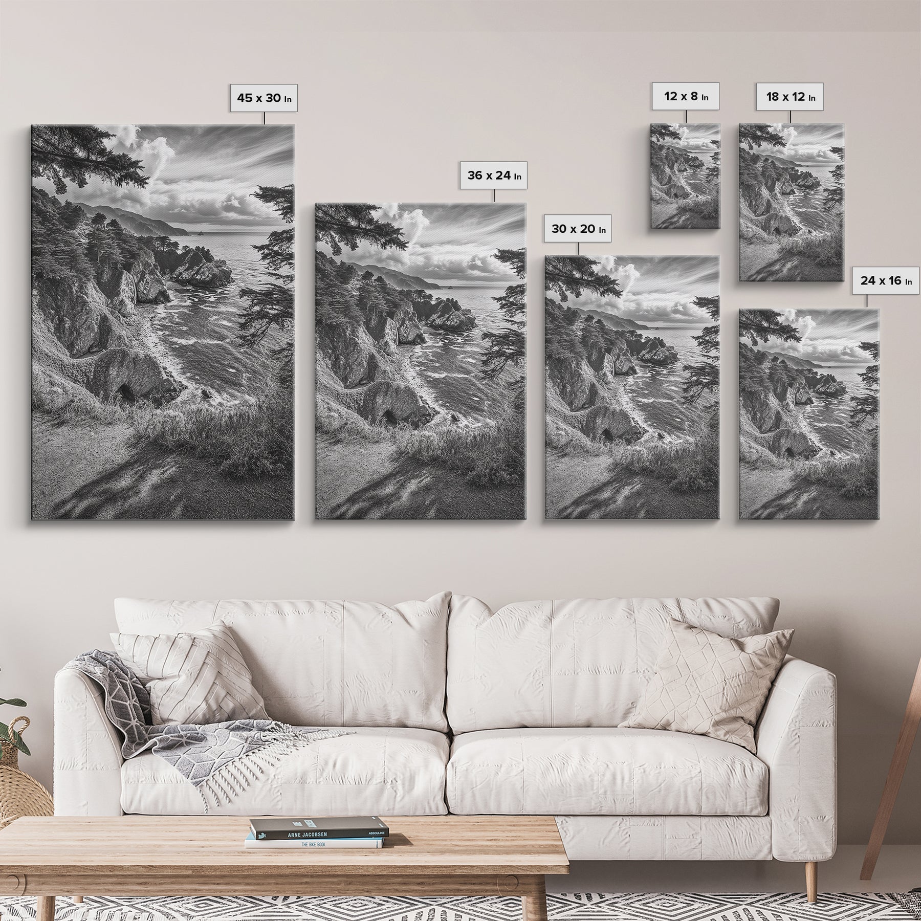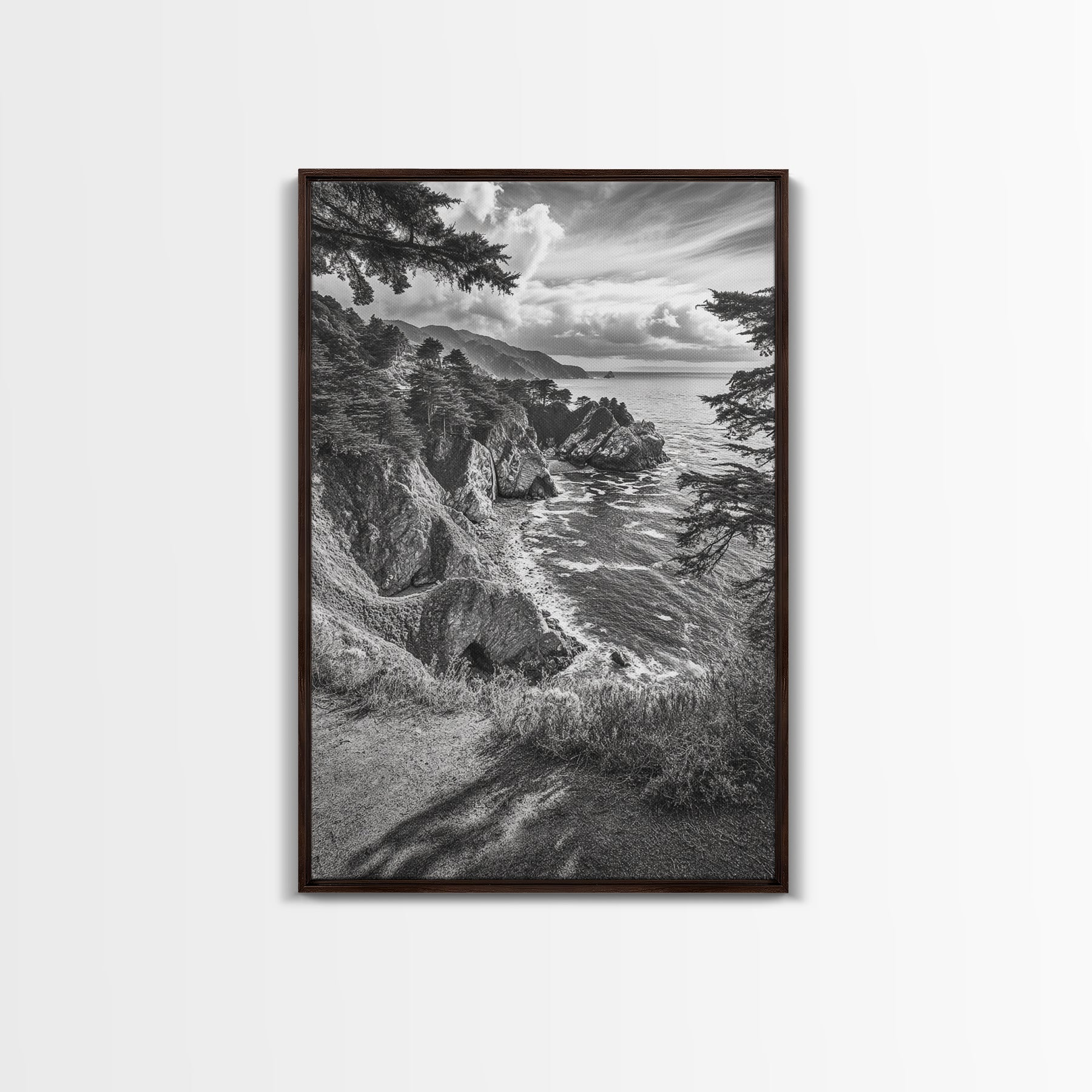 Coastal Cliff, Ocean View, Rocky Shoreline, Framed Canvas Print, Black and White Art, Coastal Living Wall Decor, Nature Landscape Art