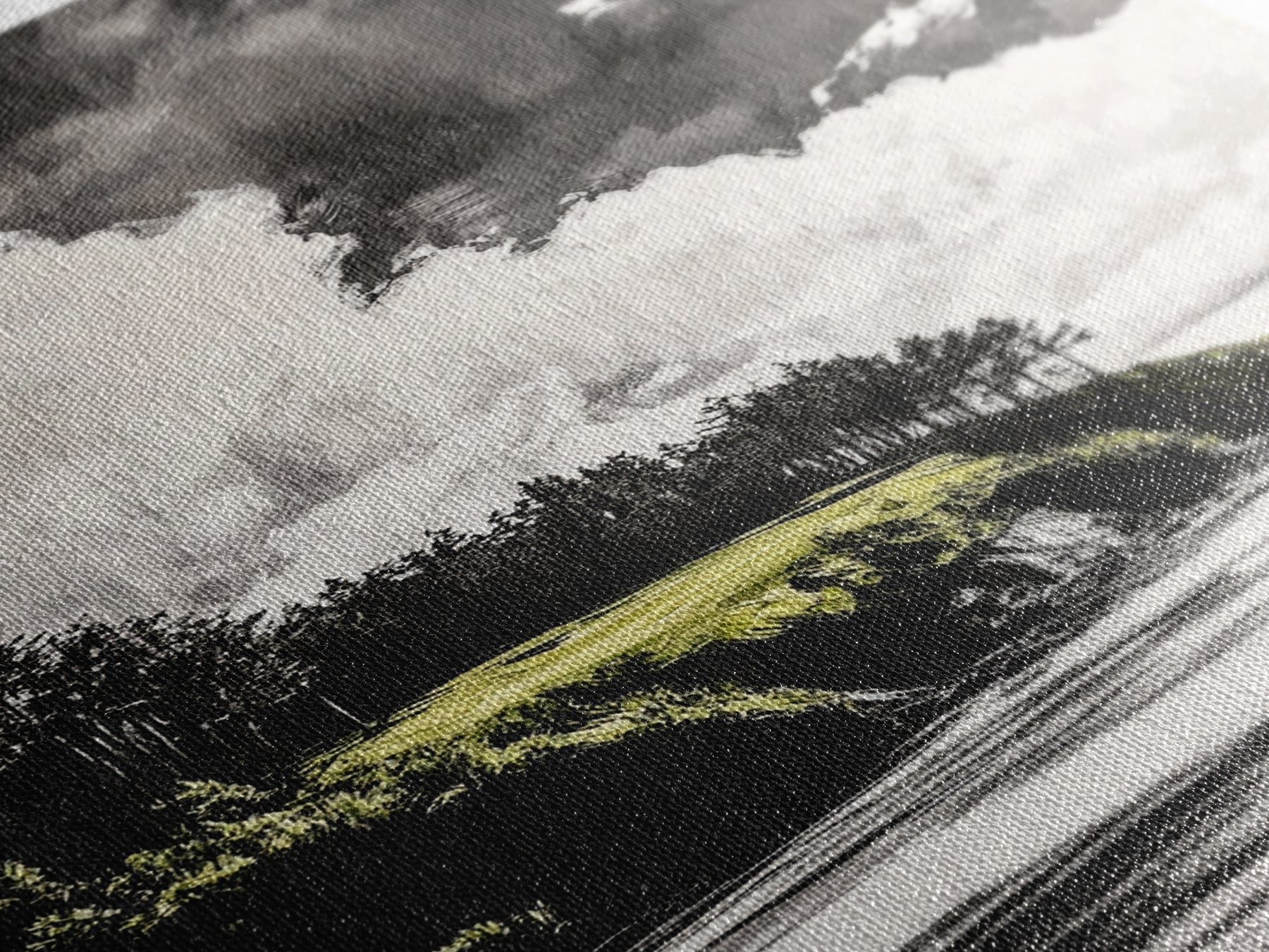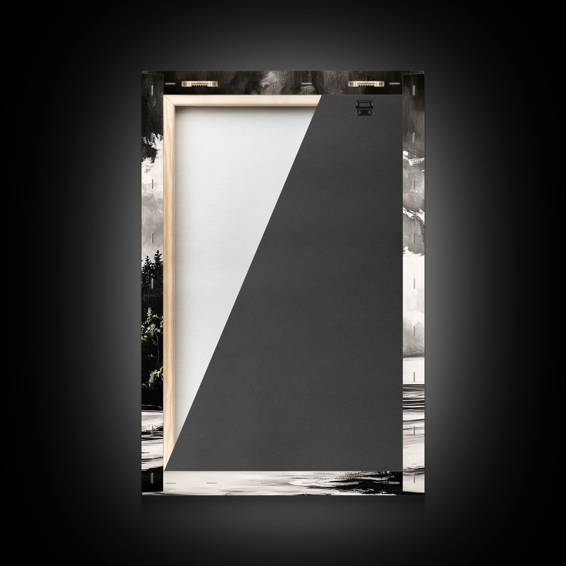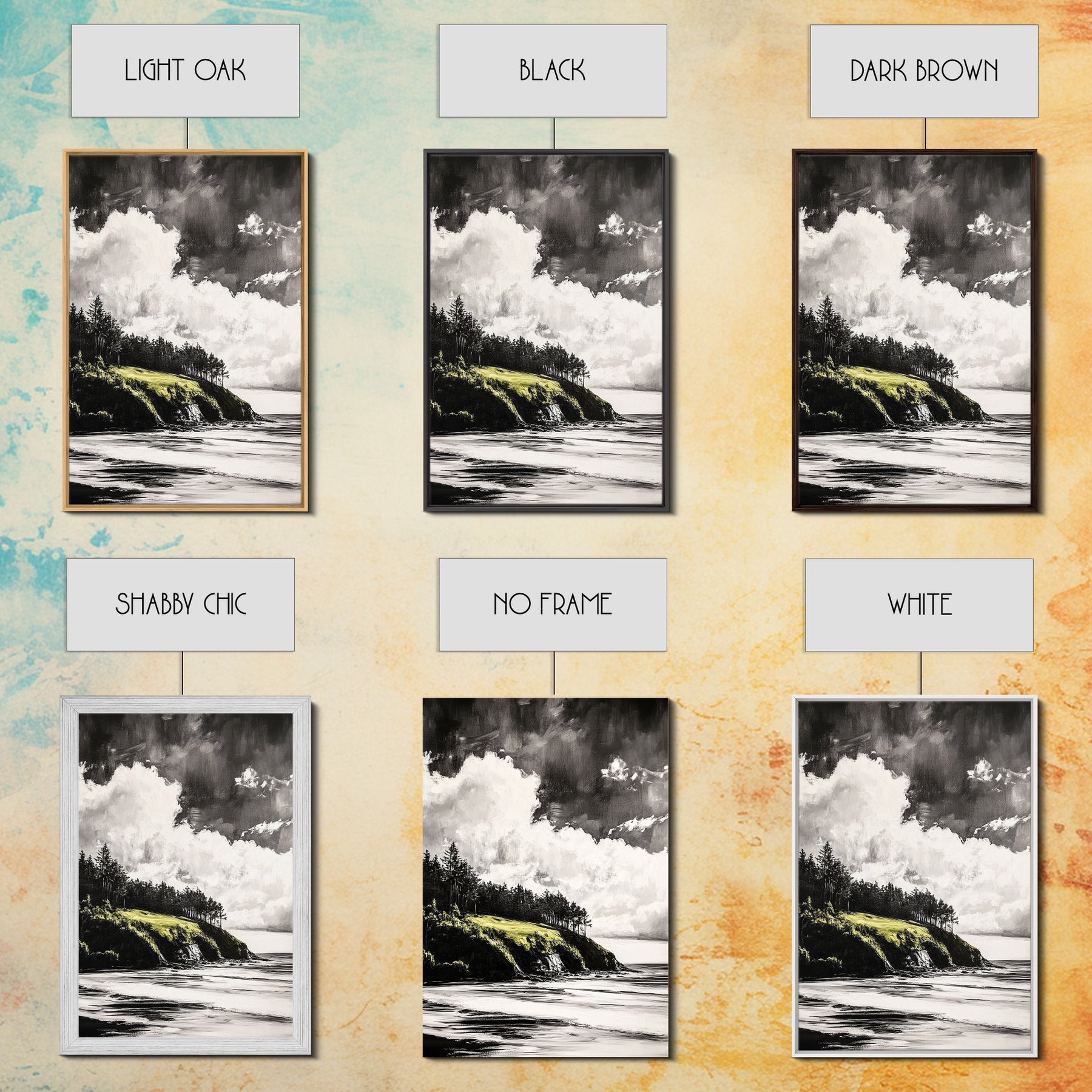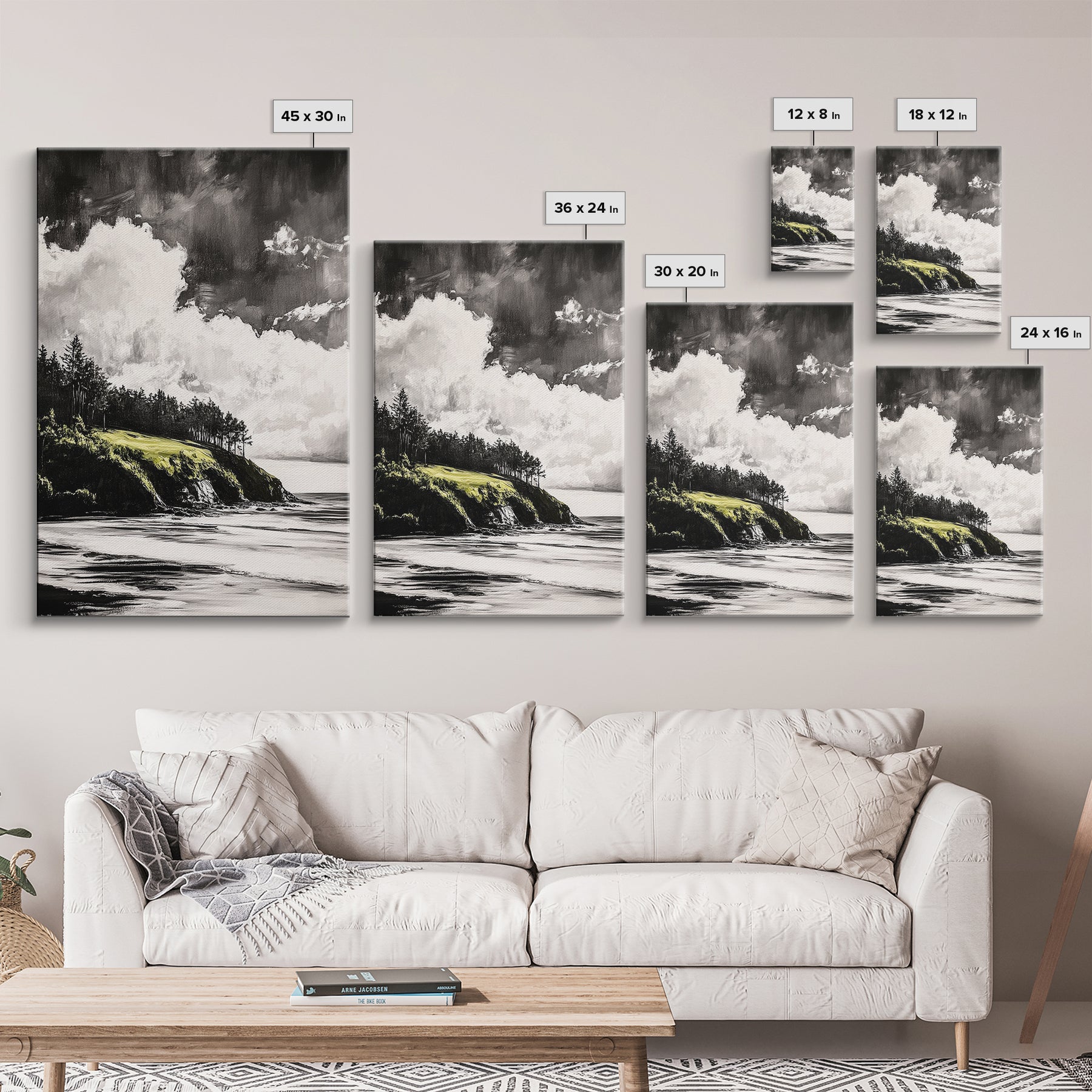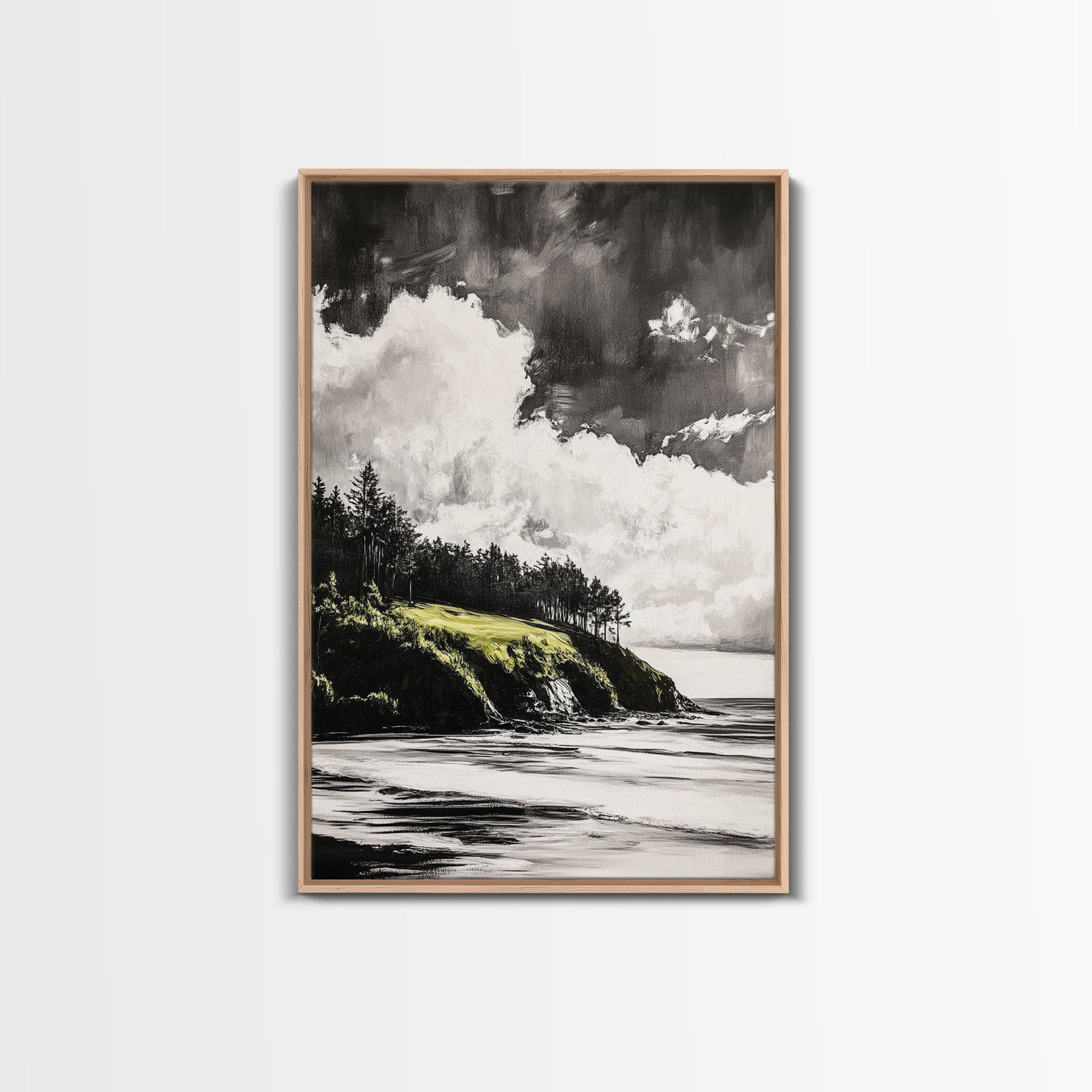 Coastal Cliffs, Black and White Landscape, Moody Sky Painting, Rustic Nature Wall Art, Office Decor, Framed Canvas Print