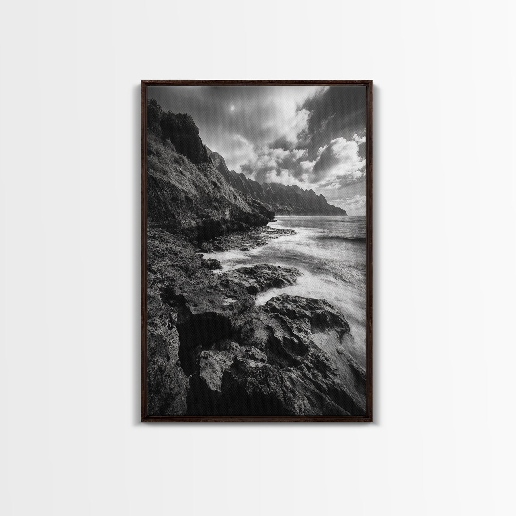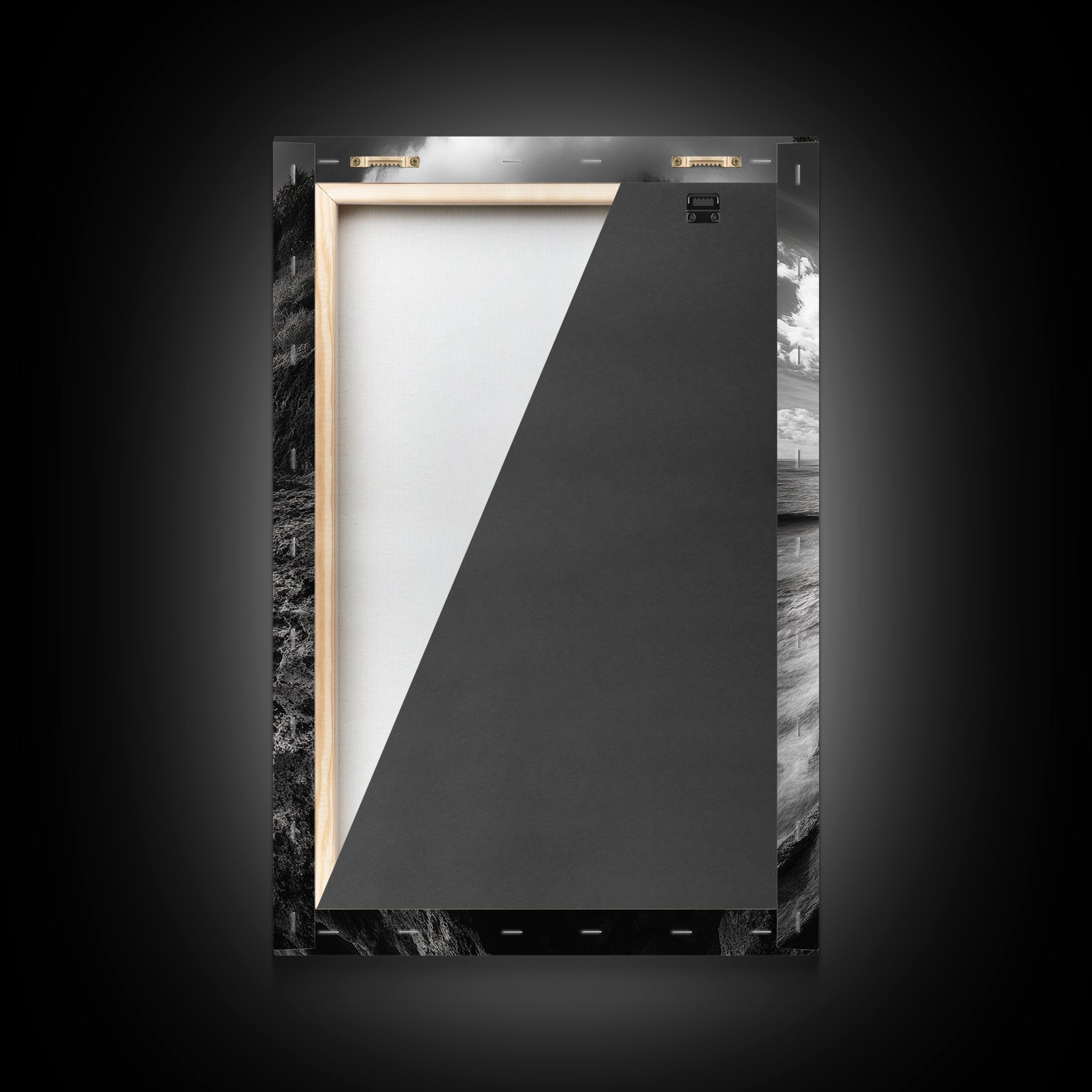 Coastal Cliffs, Ocean Horizon, Wild Waves, Framed Canvas Print, Bathroom Wall Art, Black and White Seascape, Coastal Decor, Moody Art