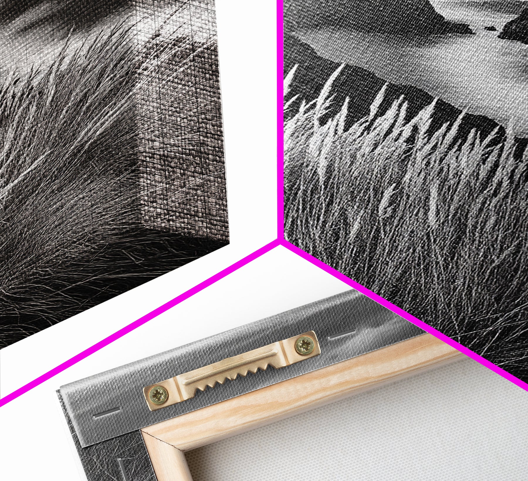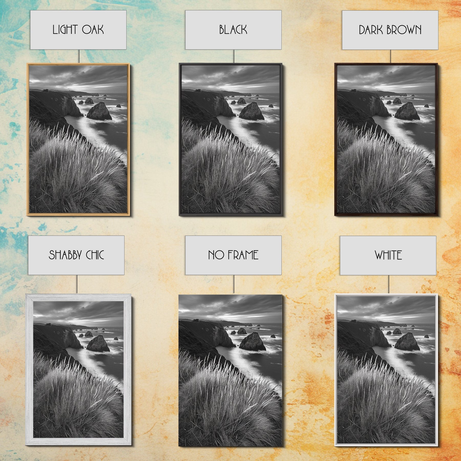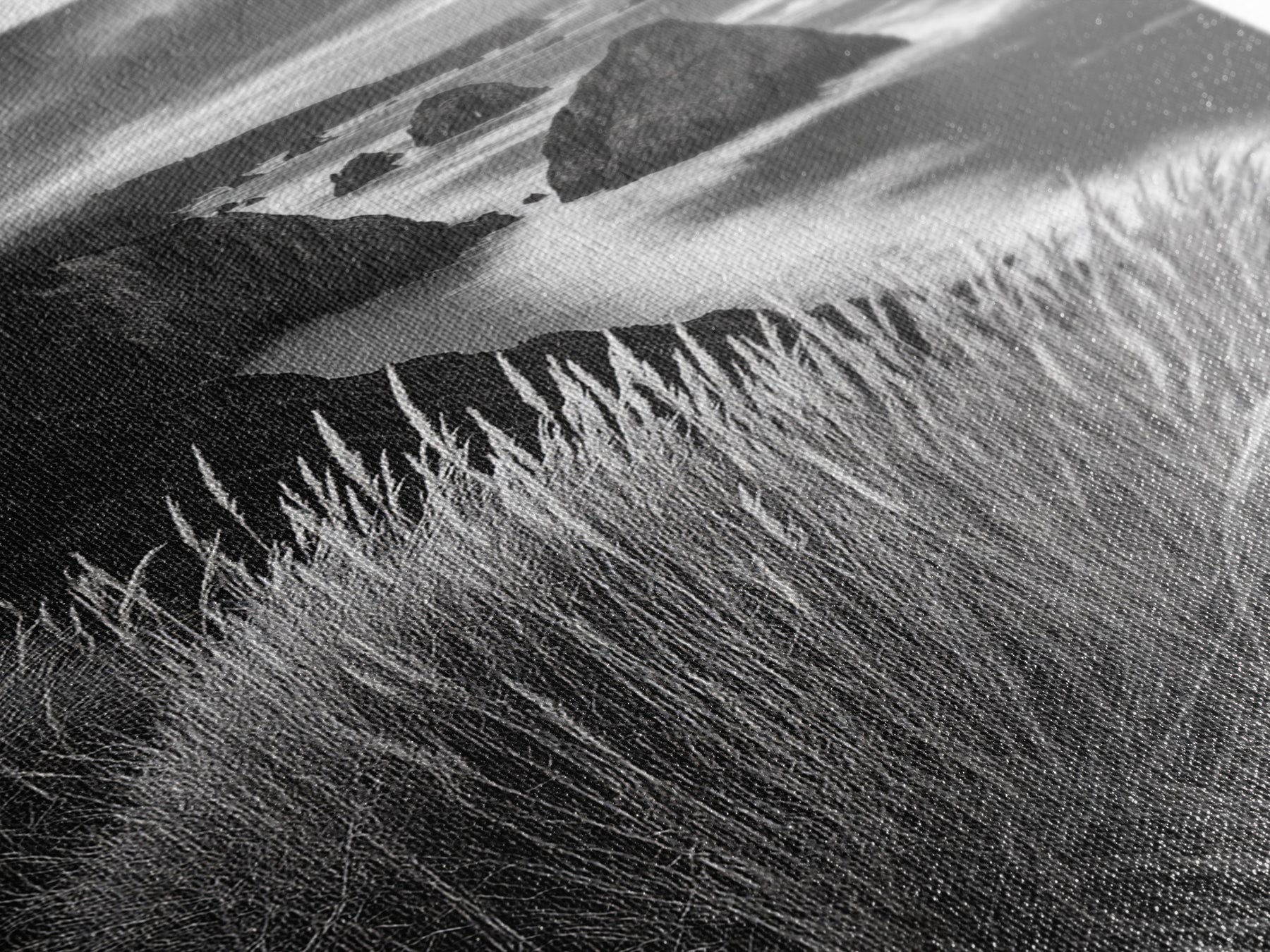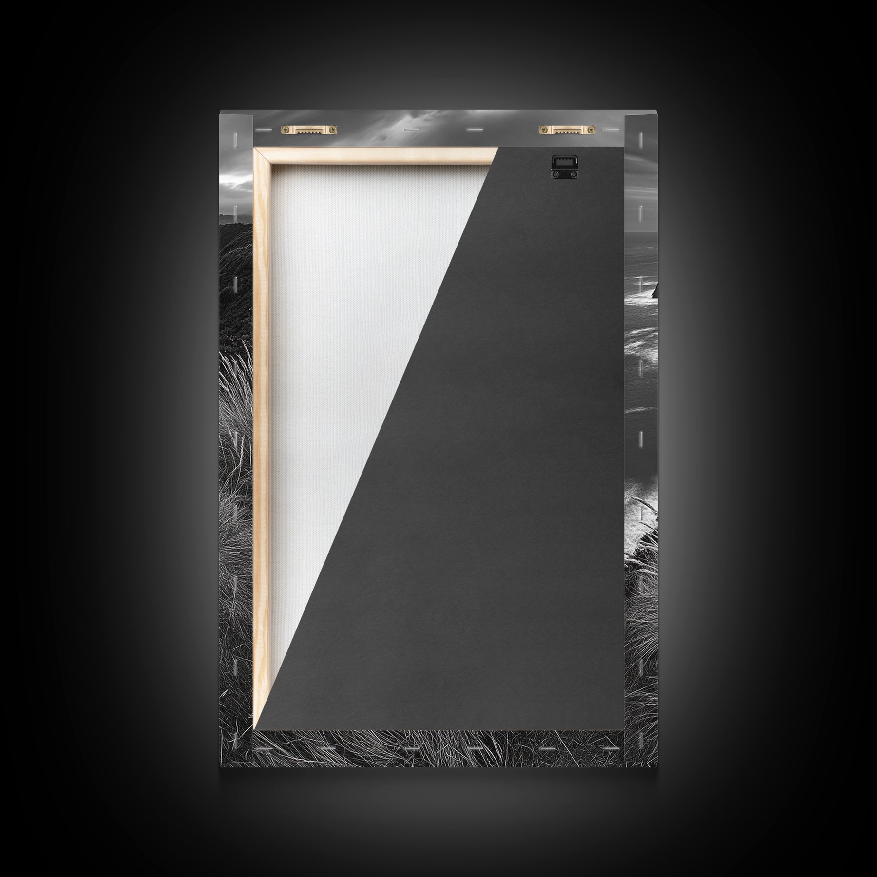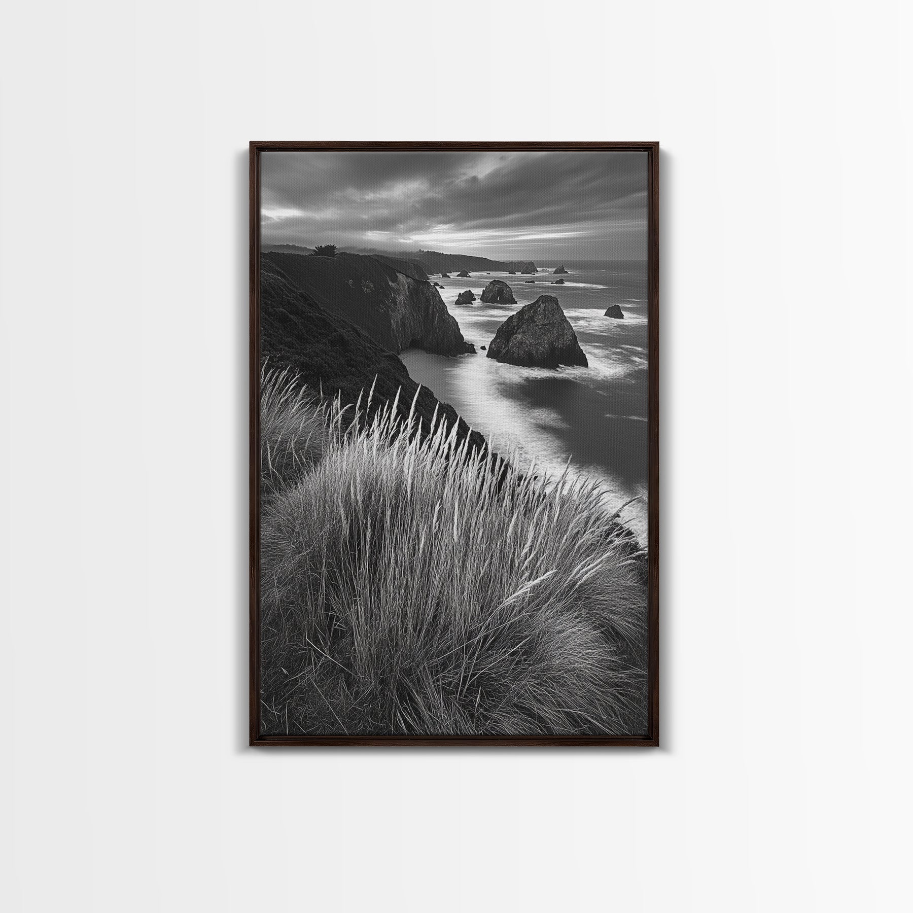 Coastal Cliffs, Ocean Rocks, Tall Grass, Canvas Print, Windswept Landscape Art, Beach House Wall Decor, Monochrome Nature Scene
