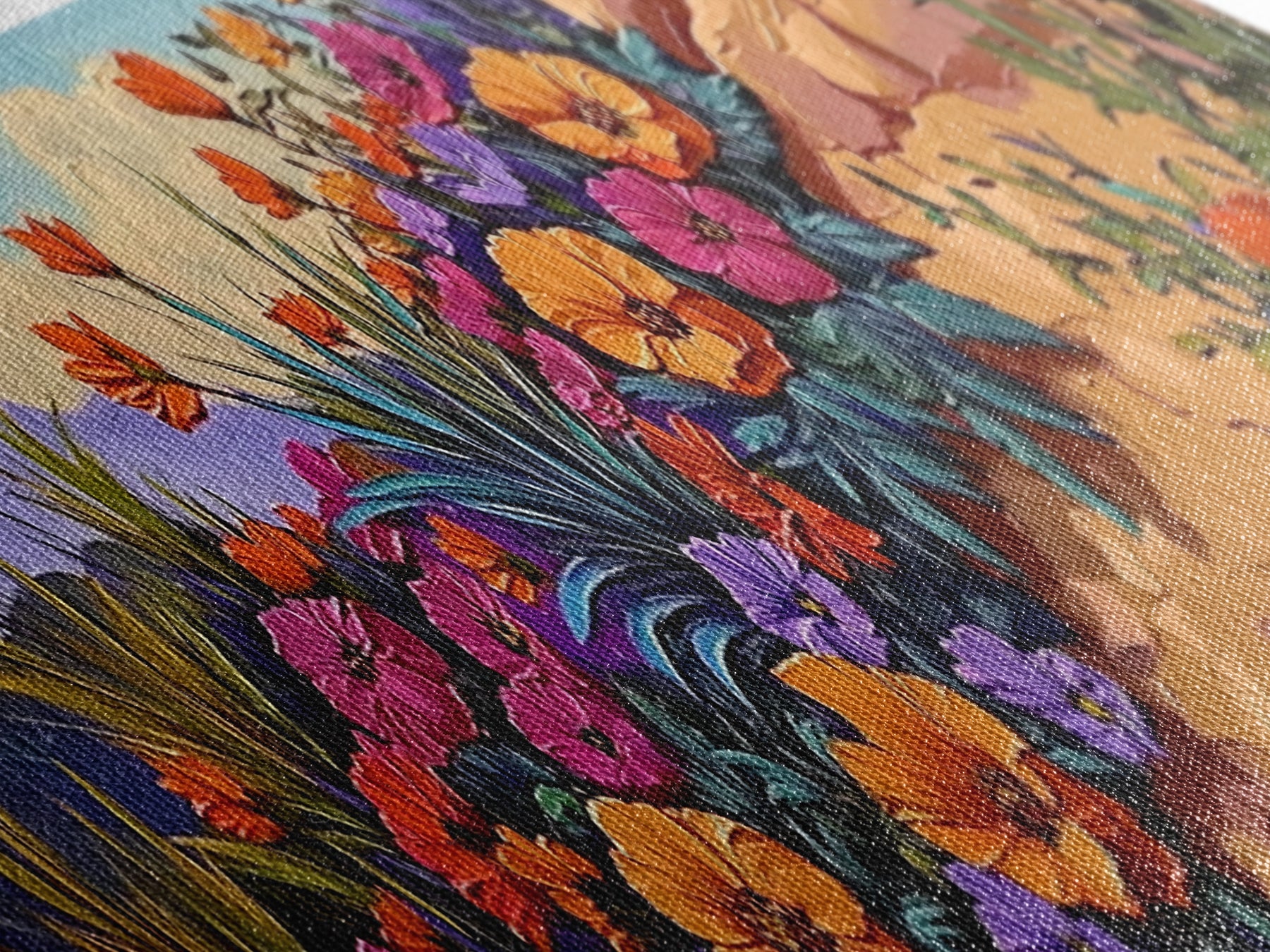 Coastal Flowers, Sunset Hillside, Wildflower Art, Framed Canvas Print, Vibrant Landscape Wall Decor, Living Room Boho Wall Art