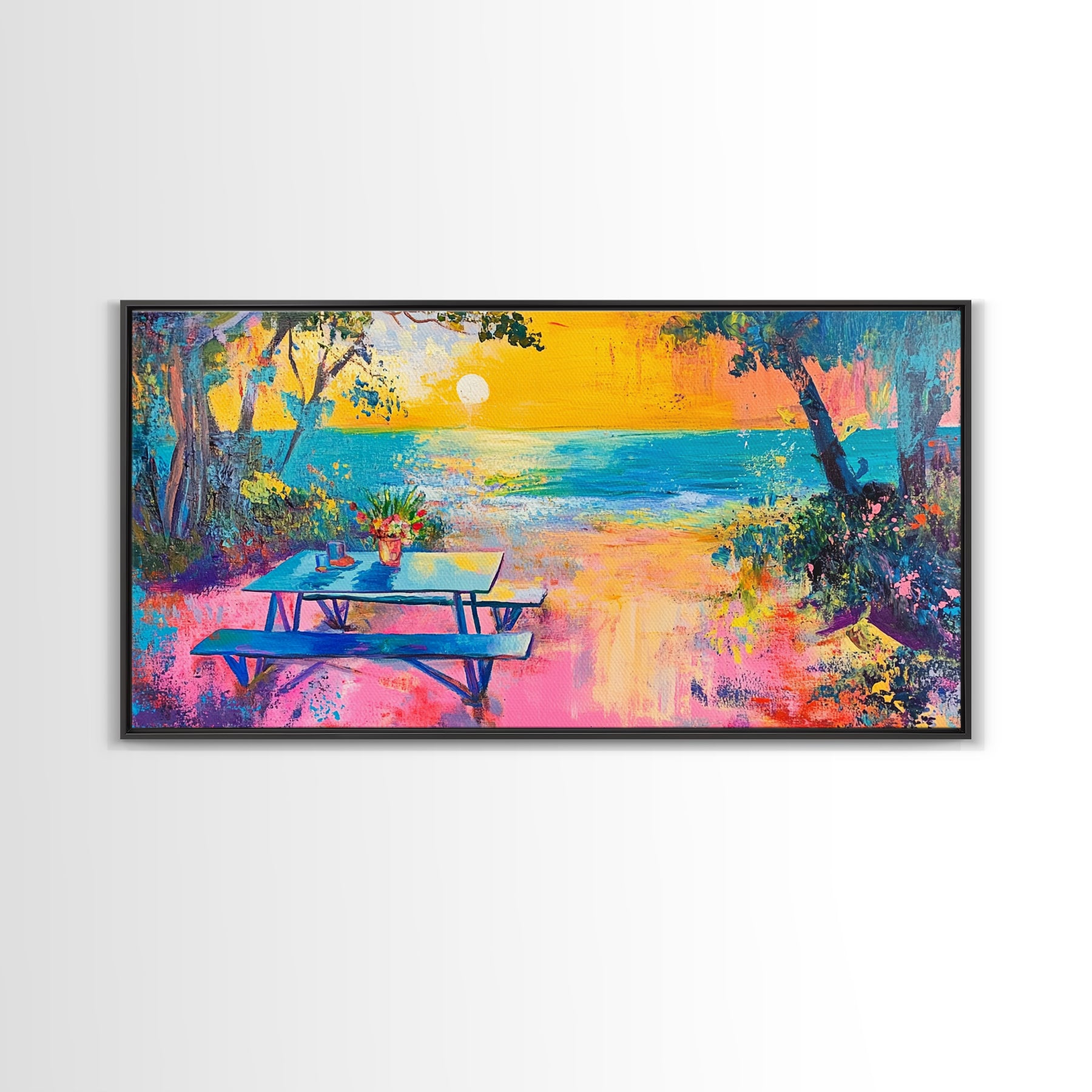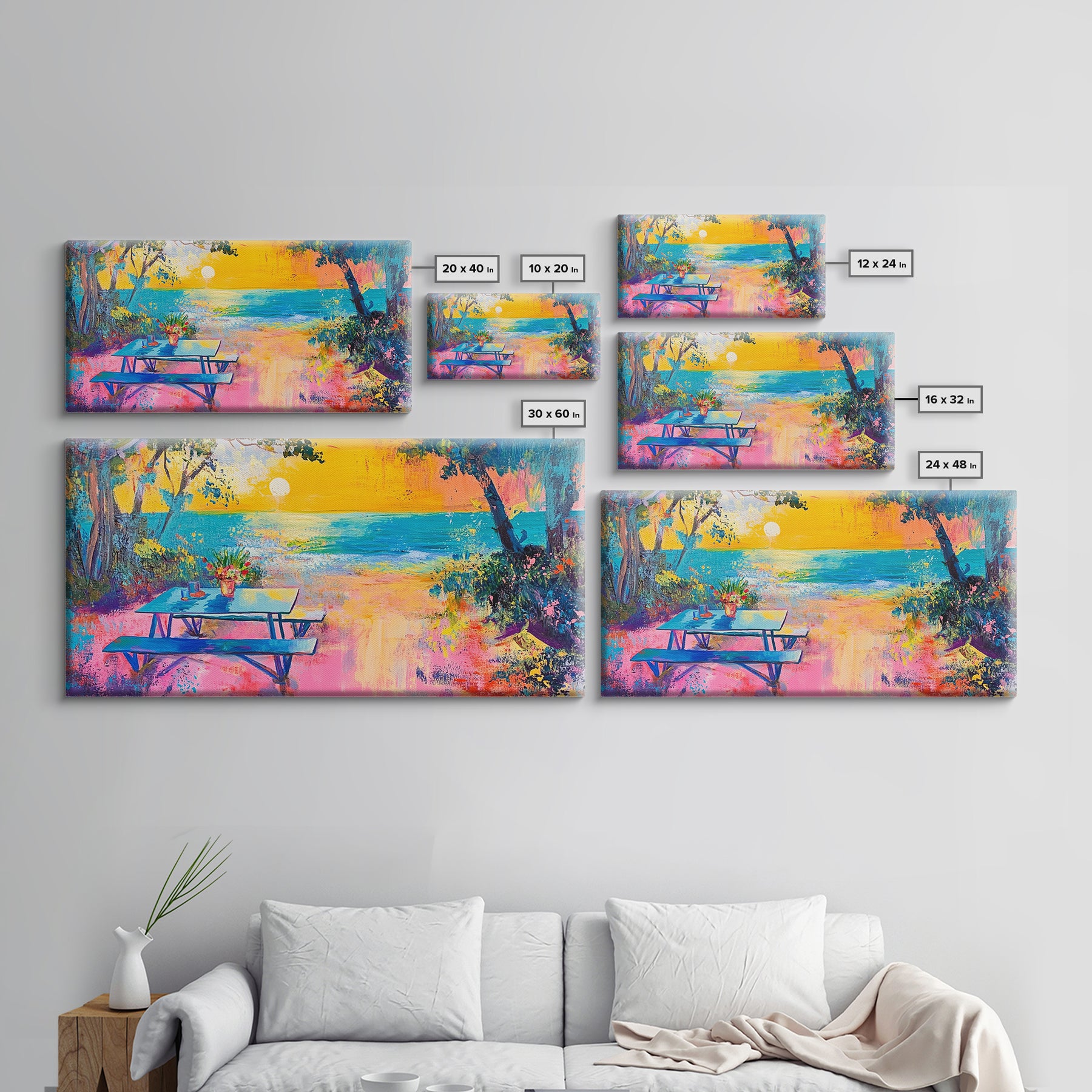 Coastal landscape art, framed canvas print, extra wide art, vibrant sunset painting, tropical beach decor, ocean waves, panoramic art
