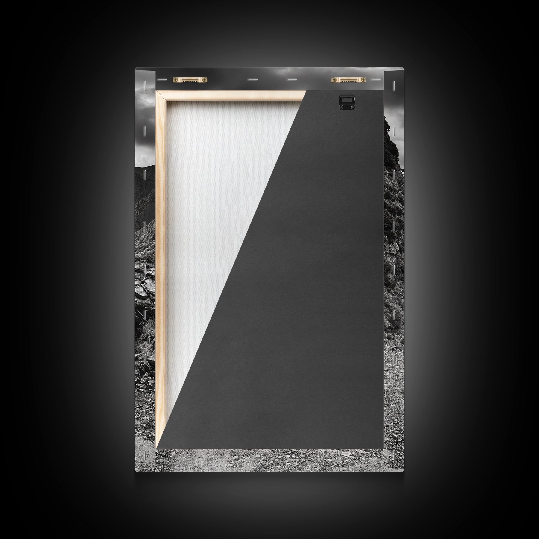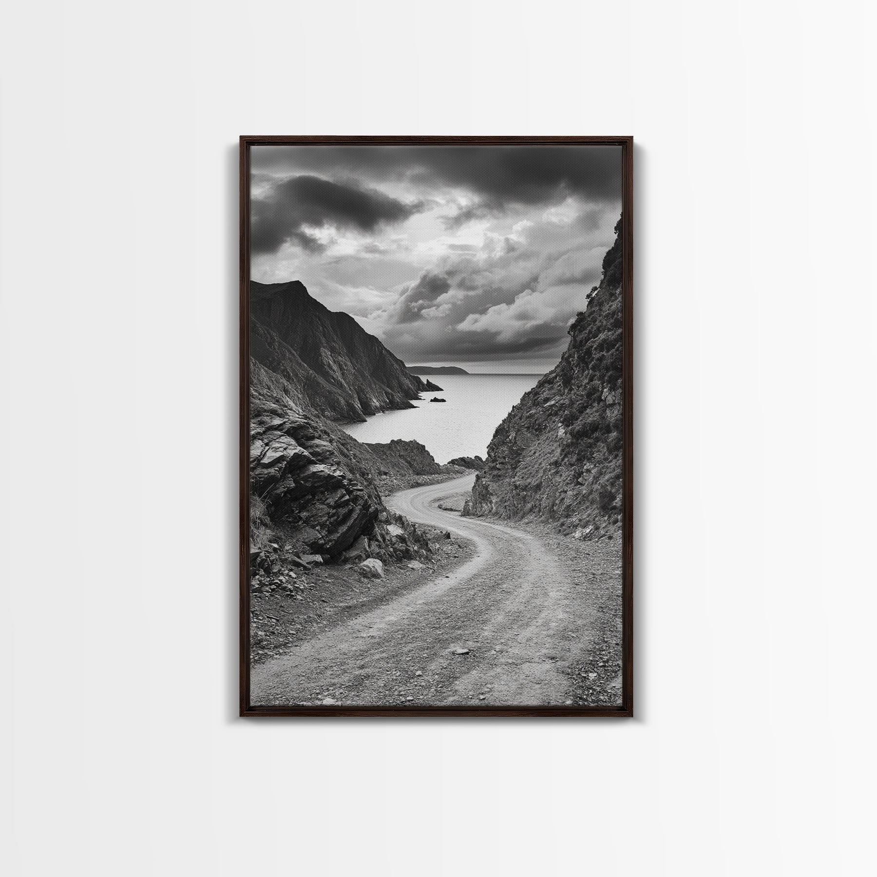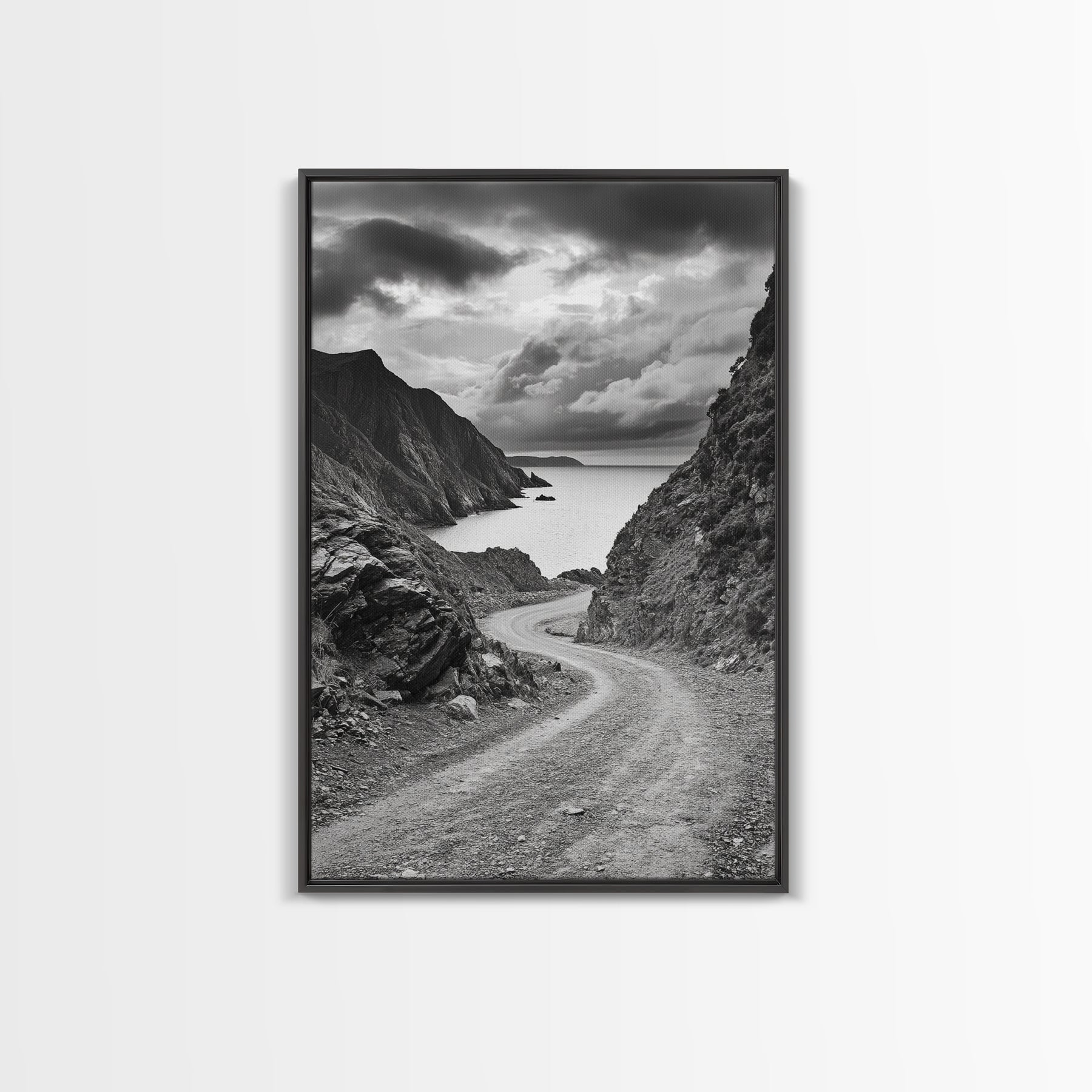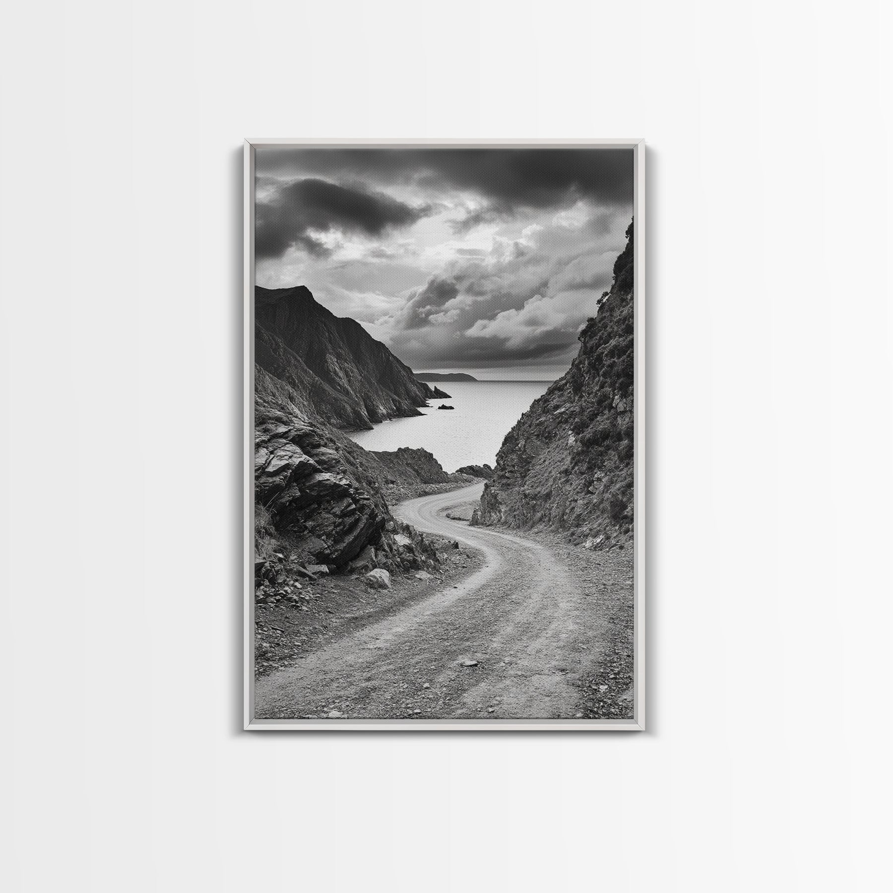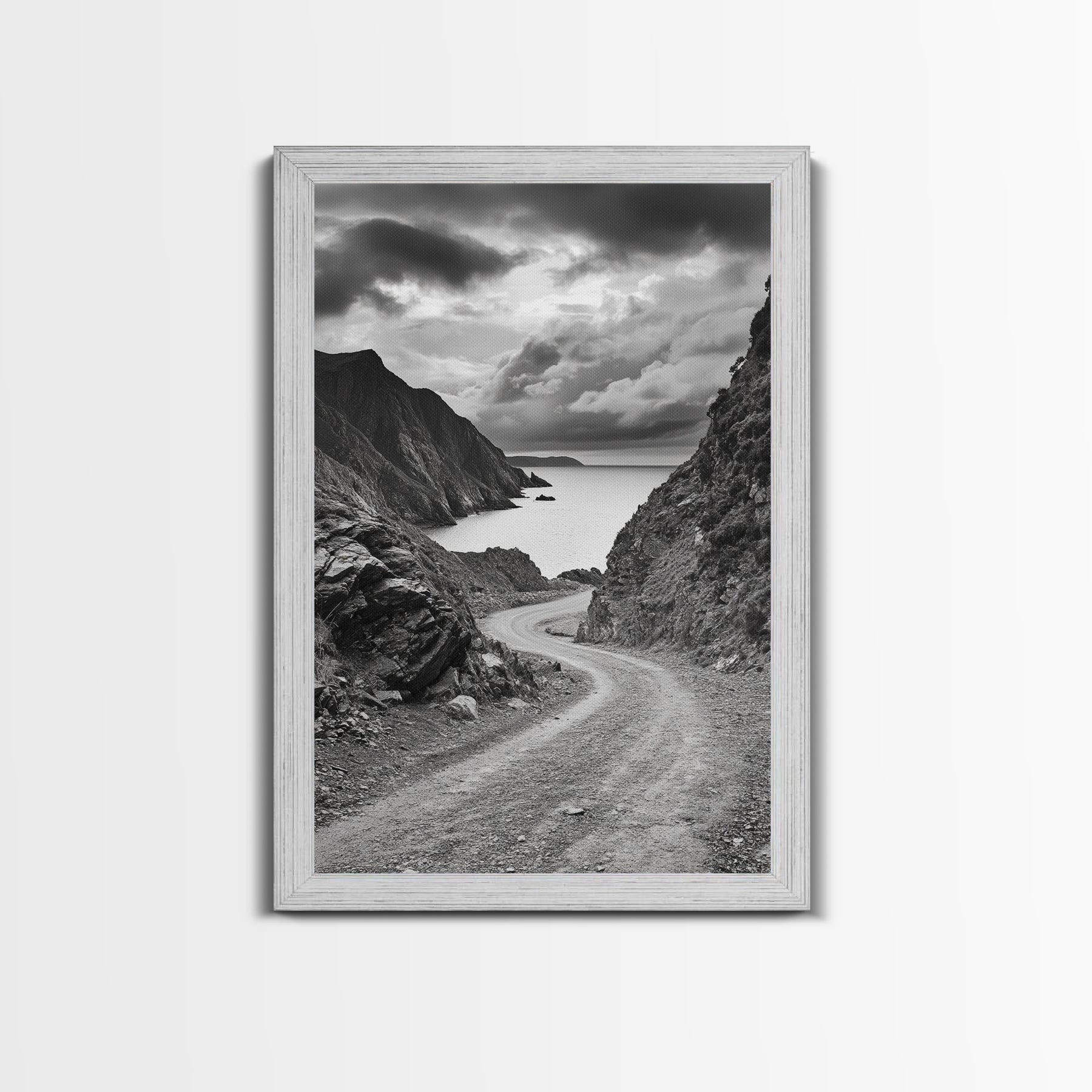 Coastal Road Curve, Rugged Cliff Path, Dramatic Seascape, Canvas Print, Office Wall Art, Monochrome Nature Art, Rustic Home Decor