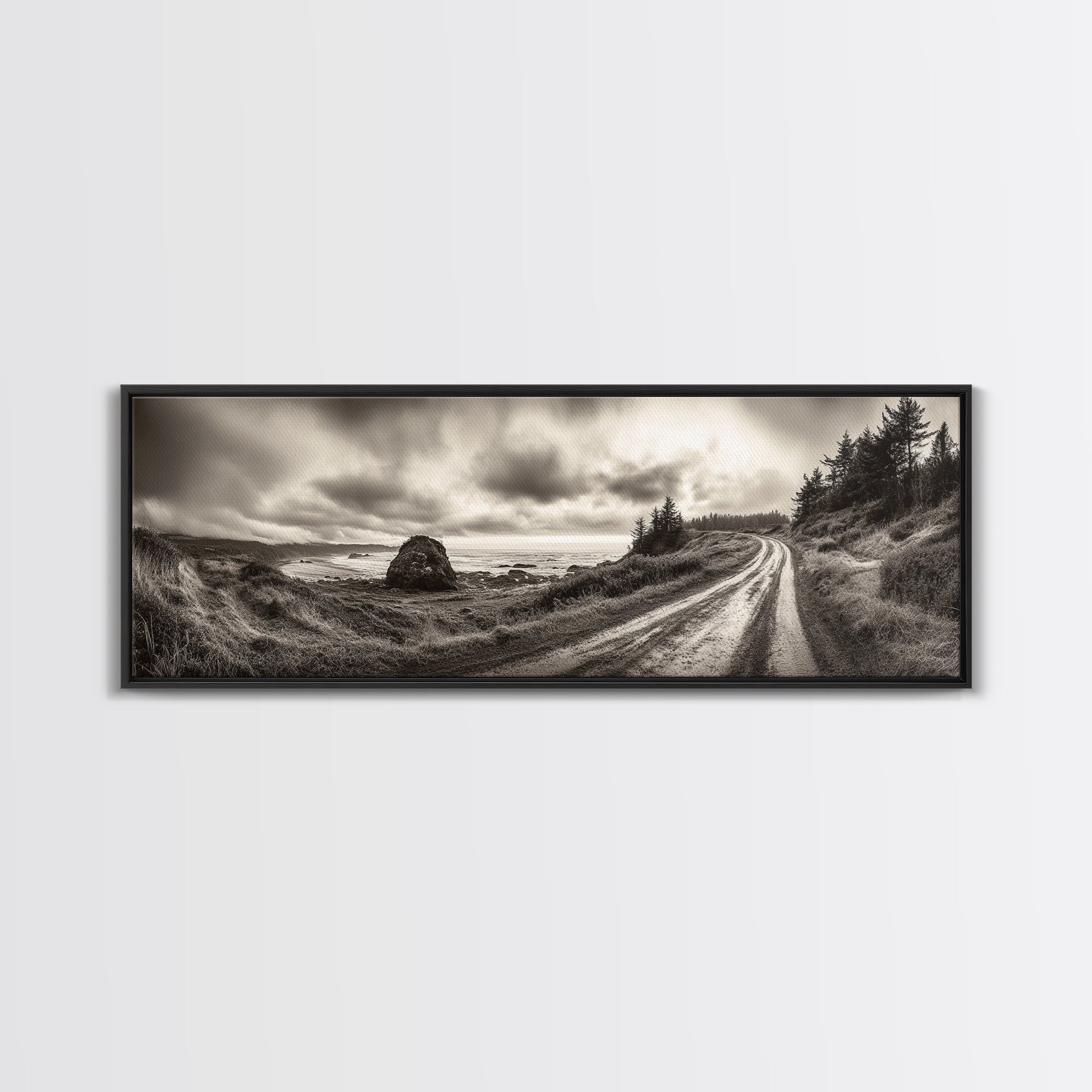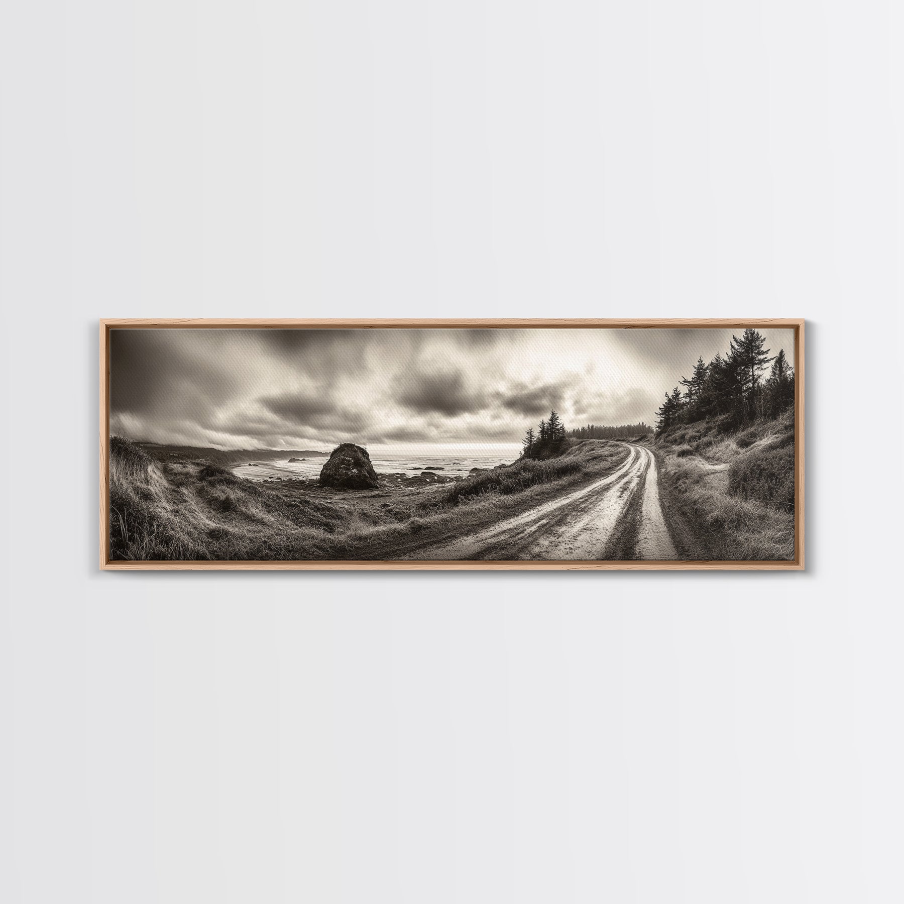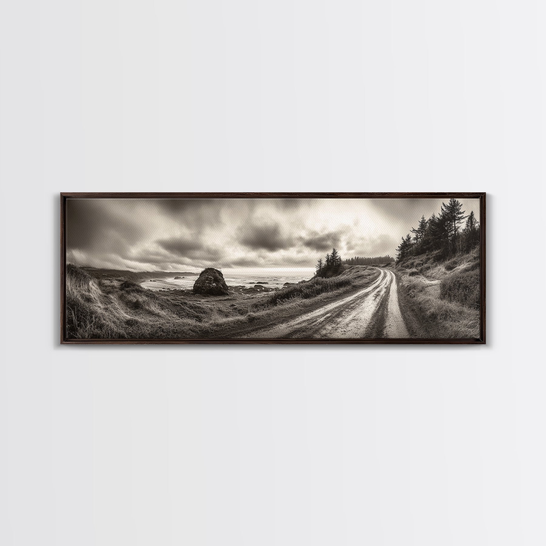 Coastal Road Journey, Overcast Ocean View, Scenic Drive Art, Framed Canvas Print, Fall Landscape Wall Art, Nature Lover, Living Room Decor